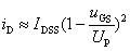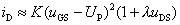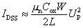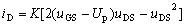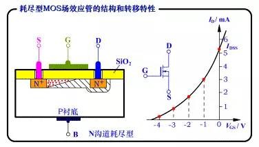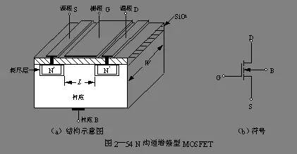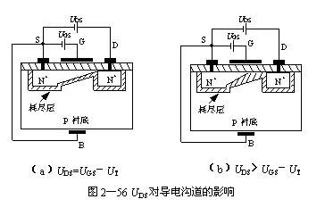 根据导电方式的不同,MOSFET又分增强型、耗尽型。所谓增强型是指:当VGS=0时管子是呈截止状态,加上正确的VGS后,多数载流子被吸引到栅极,从而“增强”了该区域的载流子,形成导电沟道。N沟道增强型MOSFET基本上是一种左右对称的拓扑结构,它是在P型半导体上生成一层SiO2 薄膜绝缘层,然后用光刻工艺扩散两个高掺杂的N型区,从N型区引出电极,一个是漏极D,一个是源极S。在源极和漏极之间的绝缘层上镀一层金属铝作为栅极G。当VGS=0 V时,漏源之间相当两个背靠背的二极管,在D、S之间加上电压不会在D、S间形成电流。当栅极加有电压时,若0<VGS<VGS(th)时,通过栅极和衬底间形成的电容电场作用,将靠近栅极下方的P型半导体中的多子空穴向下方排斥,出现了一薄层负离子的耗尽层;同时将吸引其中的少子向表层运动,但数量有限,不足以形成导电沟道,将漏极和源极沟通,所以仍然不足以形成漏极电流ID。进一步增加VGS,当VGS>VGS(th)时( VGS(th)称为开启电压),由于此时的栅极电压已经比较强,在靠近栅极下方的P型半导体表层中聚集较多的电子,可以形成沟道,将漏极和源极沟通。如果此时加有漏源电压,就可以形成漏极电流ID。在栅极下方形成的导电沟道中的电子,因与P型半导体的载流子空穴极性相反,故称为反型层。随着VGS的继续增加,ID将不断增加。在VGS=0V时ID=0,只有当VGS>VGS(th)后才会出现漏极电流,所以,这种MOS管称为增强型MOS管。VGS对漏极电流的控制关系可用iD=f(VGS(th))|VDS=const这一曲线描述,称为转移特性曲线,见图1.。转移特性曲线的斜率gm的大小反映了栅源电压对漏极电流的控制作用。 gm的量纲为mA/V,所以gm也称为跨导。跨导。 图1. 转移特性曲线图254(a)为N沟道增强型MOSFET的结构示意图,其电路符号如图254(b)所示。它是用一块掺杂浓度较低的P型硅片作为衬底,利用扩散工艺在衬底上扩散两个高掺杂浓度的N型区(用N+表示),并在此N型区上引出两个欧姆接触电极,分别称为源极(用S表示)和漏极(用D表示)。在源区、漏区之间的衬底表面覆盖一层二氧化硅(SiO2)绝缘层,在此绝缘层上沉积出金属铝层并引出电极作为栅极(用G表示)。从衬底引出一个欧姆接触电极称为衬底电极(用B表示)。由于栅极与其它电极之间是相互绝缘的,所以称它为绝缘栅型场效应管。图254(a)中的L为沟道长度,W为沟道宽度。 图254所示的MOSFET,当栅极G和源极S之间不加任何电压,即UGS=0时,由于漏极和源极两个N+型区之间隔有P型衬底,相当于两个背靠背连接的PN结,它们之间的电阻高达1012W的数量级,也就是说D、S之间不具备导电的沟道,所以无论漏、源极之间加何种极性的电压,都不会产生漏极电流ID。当将衬底B与源极S短接,在栅极G和源极S之间加正电压,即UGS﹥0时,如图255(a)所示,则在栅极与衬底之间产生一个由栅极指向衬底的电场。在这个电场的作用下,P衬底表面附近的空穴受到排斥将向下方运动,电子受电场的吸引向衬底表面运动,与衬底表面的空穴复合,形成了一层耗尽层。如果进一步提高UGS电压,使UGS达到某一电压UT时,P衬底表面层中空穴全部被排斥和耗尽,而自由电子大量地被吸引到表面层,由量变到质变,使表面层变成了自由电子为多子的N型层,称为“反型层”,如图255(b)所示。反型层将漏极D和源极S两个N+型区相连通,构成了漏、源极之间的N型导电沟道。把开始形成导电沟道所需的UGS值称为阈值电压或开启电压,用UT表示。显然,只有UGS﹥UT时才有沟道,而且UGS越大,沟道越厚,沟道的导通电阻越小,导电能力越强。这就是为什么把它称为增强型的缘故。在UGS﹥UT的条件下,如果在漏极D和源极S之间加上正电压UDS,导电沟道就会有电流流通。漏极电流由漏区流向源区,因为沟道有一定的电阻,所以沿着沟道产生电压降,使沟道各点的电位沿沟道由漏区到源区逐渐减小,靠近漏区一端的电压UGD最小,其值为UGD=UGS-UDS,相应的沟道最薄;靠近源区一端的电压最大,等于UGS,相应的沟道最厚。这样就使得沟道厚度不再是均匀的,整个沟道呈倾斜状。随着UDS的增大,靠近漏区一端的沟道越来越薄。 ![]() 当UDS增大到某一临界值,使UGD≤UT时,漏端的沟道消失,只剩下耗尽层,把这种情况称为沟道“预夹断”,如图256(a)所示。继续增大UDS(即UDS>UGS-UT),夹断点向源极方向移动,如图256(b)所示。尽管夹断点在移动,但沟道区(源极S到夹断点)的电压降保持不变,仍等于UGS-UT。因此,UDS多余部分电压[UDS-(UGS-UT)]全部降到夹断区上,在夹断区内形成较强的电场。这时电子沿沟道从源极流向夹断区,当电子到达夹断区边缘时,受夹断区强电场的作用,会很快的漂移到漏极。耗尽型。耗尽型是指,当VGS=0时即形成沟道,加上正确的VGS时,能使多数载流子流出沟道,因而“耗尽”了载流子,使管子转向截止。耗尽型MOS场效应管,是在制造过程中,预先在SiO2绝缘层中掺入大量的正离子,因此,在UGS=0时,这些正离子产生的电场也能在P型衬底中“感应”出足够的电子,形成N型导电沟道。当UDS>0时,将产生较大的漏极电流ID。如果使UGS<0,则它将削弱正离子所形成的电场,使N沟道变窄,从而使ID减小。当UGS更负,达到某一数值时沟道消失,ID=0。使ID=0的UGS我们也称为夹断电压,仍用UP表示。UGS<UP沟道消失,称为耗尽型。N沟道耗尽型MOSFET的结构与增强型MOSFET结构类似,只有一点不同,就是N沟道耗尽型MOSFET在栅极电压uGS=0时,沟道已经存在。该N沟道是在制造过程中应用离子注入法预先在衬底的表