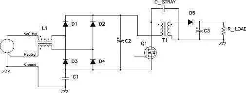 在隔离式电源中,这种情况变得更加糟糕,因为隔离变压器的次级绕组最终连接至机架接地。因此,存在相当大的初级到次级寄生电容。图1显示了一个这种情况的简化示意图。 图1:Q1高压开关驱动C-STRAY中共模电流这是一种离线工作的隔离式反向结构。110伏到220伏AC输入电源经过整流,从而向功率级提供100伏到400伏DC。电源开关迅速开启和关闭,在Q1漏极上产生500伏到600伏开关波形,其同时也施加于电源变压器的初级绕组。这种开关电压,在变压器初级绕组到次级绕组之间的杂散电容中形成电流。该电流流经负载的预设机架接地,或者只是以电容方式接地耦合。该电流必须完成噪声返回通路,从而产生开关式电源。在没有C1的情况下,它流回AC输入电源,然后流入电源的输入线,其很可能会超出EMI辐射规格。由于其高电源阻抗,这种电流的滤波特别困难。变压器的杂散电容大小级别为100 pF,其典型电源开关频率的阻抗为10千欧。只在电流通路中添加一个电感来减小这种电流的方法并不实际。例如,如果我们希望将电流减小10倍,其要求100千欧的电抗(也即0.1亨),且分布电容小于10 pF,这并不现实。电容器C1带来了另一种解决方案。它为电流提供了一条本地返回通路。大多数共模电流通过该电容器在电源内部回流,而不是通过AC输入电源回流。另外,C1还减小了系统的电源阻抗,这样共模串联电感L1就变得现实了。在共模滤波器的设计过程中,一个关键因素是C1值的选择。从电磁干扰(EMI)的角度来看,其值越大越好。更大的电容可获得更小的EMI信号,且电源阻抗也更低。你可以利用电容的平方原则,估计EMI信号的减小程度。但是,高电容也意味着机架连线的线频率电流更大。另外,这种电流还有一些安全限制,目的是减少触电事故的发生机率。当电源机架连线断裂时,人员进入电流通路便会发生触电事故,如图2所示。IEC Std 601-1将这种电流的大小限制为0.5 mA RMS,同时人们还在讨论出台更为严格的安全规定。输入为230伏时,IEC可有效地将C1值限制为4700 pF。 图2:C1可以成为一种触电风险总之,驱动寄生电容机架接地的高dV/dt电压波形,会形成共模电流。这种电流特别难以滤波,原因是其存在高电源阻抗。滤波要求使用一个机架电容器,提供另一条本地返回通路,并降低阻抗。尽管从EMI滤波器的角度来看,电容越大越好,但是总电容受限于安全规定。续如前所述我们可以使用一个机架电容将共模电流返回至电源,该电容还可以降低噪声的源阻抗。然而就我们可以使用的电容大小而言是有一个安全极限的,其决定了共模滤波器的剩余量。共模电流是由Q1漏极上的大AC开关电压产生的(请参见图1),其使得电流流经杂散电容进入机架接地。机架电容C1为其提供了一个在电源中返回而不会流经AC输入源接地连接的路径。共模电感L1通过在电源机架和AC输入源之间的路径中添加阻抗来限制共模辐射。1 MHz时,4700 pF机架电容的最大容许感抗为30 Ohms。为了让所有开关产生的电流都进入到机架电容C1,这一电感需要在高频率范围内具有高阻抗(数千欧姆)。 图1:高阻抗共模电感 (L1) 降低了辐射更进一步观察T2,电感位于热线和中线组合路径,差动电感不再用于降低共模电流。许多设计人员都使用L1漏电感进行差动滤波。由于有了电感连接(如图1所示),在电感中就没有了净DC电流,这就是说可以使用一个高磁导率无隙磁芯。图2显示了典型共模电感磁芯材料与频率之间关系的相关磁导率。就磁导率而言有真实部分 (real part) 也有复极部分 (complex part)。当复极部分与材料损耗相关时真实部分就与电感相关。由于该图表述为串联组件,因此总体阻抗为二者的矢量和。这是极具价值的,因为即使电感的真实部分在 300 kHz频率时作用开始衰减并且在高于1-2 MHz时无法使用,阻抗取决于1 MHz以上时材料的损耗情况并继续实现10 MHz的高效率。 图2:寻找一种具有高磁导率裕量的磁芯材料一旦您选定了磁芯材料,接下来的最大挑战就是如何充分利用磁芯材料的高磁导性(请参见图3),该图显示了28 mH阻抗共模与频率的关系。在低频率时,该器就像是一个电感器,但是在高频率时其更像是一个分布电容,该电容与电感共振。由于该大电感,23 pF分布式电容就会影响电感在200 kHz以上时的性能。设计一款高性能共模电感的关键就是选择扇形绕组、单个绕组并精心选择磁芯最小化绕组的数量来最小化电容。有时这些共振是不可避免的并且在较高频率时需要额外的滤波。在这些情况下,我们可以再添加一个电感来对较高频率进行滤波。 图3:分布电容降低了共模电感阻抗总之,出于对噪声的高源阻抗以及安全性考虑,AC电源的共模滤波包含了若干高阻抗组件以将电容限制在机架以内。由于中间绕组电容的存在,就高频率下的高阻抗而言,要想实现上述功能,共模电感面临着很大的挑战。在选择磁芯材料时需十分谨慎,材料磁导性裕量必须一直保持在高水平。此外,必须要对分布式绕组电容进行适当控制。一个仅为30 pF 的分布式电容就可损坏电感的阻抗。在大多数情况下,设计人员会使用串联的两个电感(每个电感在特定的频带内均能提供滤波功能)来解决这一问题。 |