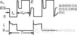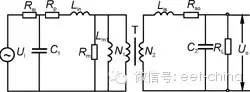 1、开关电源功率变压器的特性功率变压器是开关电源中非常重要的部件,它和普通电源变压器一样也是通过磁耦合来传输能量的。不过在这种功率变压器中实现磁耦合的磁路不是普通变压器中的硅钢片,而是在高频情况下工作的磁导率较高的铁氧体磁心或铍莫合金等磁性材料,其目的是为了获得较大的励磁电感、减小磁路中的功率损耗,使之能以最小的损耗和相位失真传输具有宽频带的脉冲能量。图1(a)为加在脉冲变压器输入端的矩形脉冲波,图1(b)为输出端得到的输出波形,可以看出脉冲变压器带来的波形失真主要有以下几个方面: 图1脉冲变压器输入、输出波形(a)输入波形(b)输出波形(1)上升沿和下降沿变得倾斜,即存在上升时间和下降时间;(2)上升过程的末了时刻,有上冲,甚至出现振荡现象;(3)下降过程的末了时刻,有下冲,也可能出现振荡波形;(4)平顶部分是逐渐降落的。这些失真反映了实际脉冲变压器和理想变压器的差别,考虑到各种因素对波形的影响,可以得到如图2所示的脉冲变压器等效电路。图中:Rsi信号源Ui的内阻Rp一次绕组的电阻Rm磁心损耗(对铁氧体磁心,可以忽略)T理想变压器Rso二次绕组的电阻RL负载电阻C1、C2一次和二次绕组的等效分布电容Lin、Lis一次和二次绕组的漏感Lm1一次绕组电感,也叫励磁电感n理想变压器的匝数比,n=N1/N2 图2脉冲变压器的等效电路将图2所示电路的二次回路折合到一次,做近似处理,合并某些参数,可得图3所示电路,漏感Li包括Lin和Lis,总分布电容C包括C1和C2;总电阻RS包括Rsi、RP和Rso;Lm1是励磁电感,和前述的Lm1相同;RL′是RL等效到一次侧的阻值,RL′=RL/n2,折合后的输出电压U′o=Uo/n。经过这样处理后,等效电路中只有5个元件,但在脉冲作用的各段时间内,每个元件并不都是同时起主要作用,我们知道任何一个脉冲波形可以分解成基波与许多谐波的叠加。脉冲的上升沿和下降沿包含着各种高频分量,而脉冲的平顶部分包含着各种低频分量。因此在上升、下降和平顶过程中,各元件(L、C等)表现出来的阻抗也不一样,因此我们把这一过程分成几个阶段来分析,分别找出各阶段起主要作用的元件,而忽略次要的因素。例如,当输入信号为矩形脉冲时,可以分3个阶段来分析,即上升阶段、平顶阶段和下降阶段。(1)上升阶段对于通常的正脉冲而言,上升阶段即脉冲前沿,信号中包含丰富的高频成分,当高频分量通过脉冲变压器时,在图3所示的等效电路中,C的容抗1/ωC很小,而Lm1的感抗ωLm1很大,相比起来,可将Lm1的作用忽略,而在串联的支路中,Li的作用即较为显著。于是可以把图3所示的等效电路简化成图4所示的等效电路。![]() ![]() 图3图2的等效电路 图4图3的简化电路在这个电路中,频率越高,ωLi越大,而1/ωC越小,因而高频信号大多降在Li上,输出的高频分量就减少了,可见输入信号Usm前沿中所包含的高频分量就不能完全传输到输出端,频率越高的成分到达输出端越小,结果在输出端得到的波形前沿就和输入波形不同,即产生了失真。 要想减小这种波形失真,就要尽量减小分布电容C(应减小变压器一次绕组的匝数)。但又要得到一定的绕组电感量,所以需要用高磁导率的磁心。在绕制上也可以采取一些措施来减小分布电容,例如用分段绕法;为了减小漏感L1,可采用一、二次绕组交叠绕法等。 (2)平顶阶段脉冲的平顶包含着各种低频分量。在低频情况下,并联在输出端的3个元件中,电容C的容抗1/ωC很大,因此电容C可以忽略。同时在串联支路中,Li的感抗ωLi很小,也可以略去。所以又可以把图3电路简化为图5所示的低频等效电路。信号源也可以等效成电动势为Usm的直流电源。这里可用下述公式表达U′o=(UsmRL′)e-T/τ/(Rs+RL′)τ=Lm1(Rs+RL′)RsRL′可见U′o为一下降的指数波形,其下降速度决定于时间常数τ,τ越大,下降越慢,即波形失真越小。为此,应尽量加大Lm1,而减小Rs和RL′,但这是有限的。如果Lm1太大,必然使绕组的匝数很多,这将导致绕组分布电容加大,致使脉冲上升沿变坏。 ![]() ![]() 图5图3的低频等效电路 图6脉冲下降阶段的等效电路(3)下降阶段下降阶段的信号源相当于直流电源Usm串联的开关S由闭合到断开的阶段,它与上升阶段虽然是相对的过程,但有两个不同;一是电感Lm1中有励磁电流,并开始释放,因此Lm1不能略去;二是开关S断开后,Rs便不起作用,由此得出下降阶段的等效电路,见图6。一般来说,在脉冲变压器平顶阶段以后,Lm1中存储了比较大的磁能,因此在开关断开后,会出现剧烈的振荡,并产生很大的下冲。为了消除下冲往往采用阻尼措施。2、功率变压器的参数及公式2.1、变压器的基本参数在磁路中,磁通集中的程度,称为磁通密度或磁感应强度,用B表示,单位是特斯拉(T),通常仍用高斯(GS)单位,1T=104GS。另一方面,产生磁通的磁力称为磁场强度,用符号H表示,单位是A/mH=0.4πNI/li式中:N绕组匝数I电流强度li磁路长度磁性材料的磁滞回线表示磁性材料被完全磁化和完全去磁化这一过程的磁特性变化。图7为一典型的磁化曲线。由坐标0点到a点这段曲线称起始磁化曲线。曲线中的一些关键点是十分重要的,BS:饱和磁通密度,Br:剩磁,HC:矫顽磁力。当Br越接近于BS值时,磁滞曲线的形状越接近于矩形,见图8(a),同时矫顽磁力HC越大时,磁滞曲线越宽,这表明这种磁性材料的磁化特性越硬,表明这种材料为硬磁性材料。当Br和BS相差越大,矫顽磁力HC越小时,即磁滞曲线越瘦,表明这种材料为