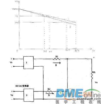 目前,将多个模块电源通过并联的方式进行均流输出,已经成为了很多生产商在进行新产品研发时的选择。这种并联均流输出的方式能够充分保障电源电池的工作稳定性,在某一个电源模块出现故障时,其他模块还可以正常运行,能够为工程师提供充足的维修检测时间。本文将会就电源模块并联的方法之一,输出阻抗法,进行简要介绍,帮助工程师快速掌握其原理。 在日常的工作中,电源模块的输出阻抗并联输出法也被称作电压调节率法,这种方法是通过调节开关变换器的外特性即调节输出阻抗达到并联模块接近均流的目的。下图中,图1为一个开关变换器的外特性,Vo=f(Io)。在该外特性中,我们可以看到R为开关变换器的输出阻抗,其中也包括这个开关变换器模块连接到负载的导线电阻。空载时模块输出电压为Vomax。由此可见,当电流变化量为△I时,负载变化量为△V,因此AV/△I=R,R为该模块的输出阻抗。△V/△I同时也代表开关变换器的输出电压调整率。 图1 开关变换器外特性Vo=f(Io) 在正常工作的前提下,该开关变换器的负载电压与负载电流的关系可通过公式表示为Vo=VomaxRio。若将两台具有相同容量、相同参数的开关变换器相互并联,则有:Vol=VomaxR1Iol,V02=VomaxR210。R1、R2分别为模块l及模块2的输出阻抗。设负载电阻为RL,则有Io1=[R2Vol+(volv02)RE]/Rx,Io2=[R1V02+(VolV02)RL]/R,式中Rx=R1R2+(R1+R2)RL。 图2并联变换器及其外特性 那么,如果将两台单独的开关变换器进行并联,其特性又会出现哪些变化?我们可以通过一个实验进行说明。将两台开关变换器相互并联后,其外特性如下图中图2所示。依据公式我们可以计算得出,当负载电流为IL=IOl+102时,负载电压为vo,按两个模块的负载调整率分配负载电流IL,斜率不相等,电流分配也不相等。当负载电流增大至IL'=10l’+102’时,负载电压为V0’。由此可见,模块1外特性斜率小,分配电流的增长量比外特性斜率大的模块2增长量更大。如果能设法将模块1的外特性斜率调熬到接近模块2,则可使这两个模块的电流分配接近均匀。 图3典型输出阻抗调节法电路原理图 在了解了并联变换器及其外特性知识后,我们就可以采用输出阻抗调节法进行并联输出调节了。图3是一种典型输出阻抗调节法实现并联模块近似均流的电路原理图,我们可以看到,图3中Rs模块电流的检测电阻,电流信号经过电流放大器输出V1(O5V电压),与模块输出的反馈电压vf综合加到电压放大器的输入端。综合信号电压与基准电压Vr比较后,其误差经过放大得到Ve,控制调节器及驱动器,用以实现自动调节模块的输出电压。当某个模块的电流增加量大时,vs上升且ve下降,使得该模块的输出电压下降,即外特性向下倾斜,接近其他模块的外特性,其他模块的电流增大,实现近似均流。 总结 输出阻抗法在实际工作过程中,是最容易实现多个模块电源均流输出的方法,这种方法的本质是采用开环控制,因此在小电流时很容易造成电流分配特性差、重载时不均衡等问题。在工作过程中,遇到电压调整率要求较高(等于或小于3%)的情况时,一般不宜采用该方法进行多个电源模块并联。
