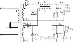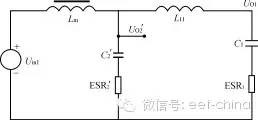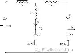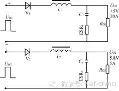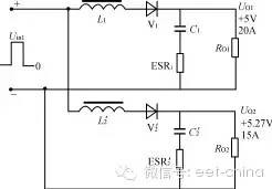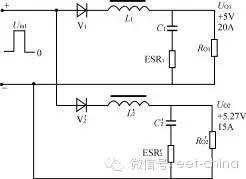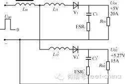 本文分析对比正激变换器多路输出滤波电感采用独立方式和耦合方式的不同特点,讨论了耦合电感的设计方法,给出了一个设计实例,并给出仿真及试验结果。 1、引言近年来高频开关电源在电子产品中得到广泛应用。正激式DC/DC变换器以其输出纹波小、对开关管的要求较低等优点而适合于低压、大电流、功率较大的场合。但正激变换器对输出电感的设计有较高要求,特别在多路输出的情况。本文分析对比正激变换器多路输出滤波电感采用独立方式和耦合方式的不同特点,讨论了耦合电感的设计方法,给出了一个设计实例,并给出仿真及试验结果。2、正激变换器普通多路输出的分析图1所示为180W正激变换器的变压器及输出部分。两路输出分别采用无耦合的滤波电感。其一路输出UO1为:UO1=(Uin1-UV1a)D-UV1b(1-D)=Uin1D-UV1b(1)式(1)中,D为初级开关脉冲的占空比,UV1a、UV1b分别为整流二极管和续流二极管的压降,并假设它们相等。该电路L的最小值一般由所需维持最小负载电流的要求决定,而电感L中的电流又分连续和不连续两种工作情况。如果负载电流IO逐步降低,L中的波动电流最小值刚好为0时,即定义为临界情况。在控制环中,连续状况的传递函数有两个极点,不连续状况只有一个极点。因而在临界点上下,传递函数是突变的。图1电路的Uin1,Uin2绕组通常都为紧耦合状态,而每一路LC滤波器的串联谐振频率不相同,这一情况将使控制环在连续状况时传递函数增加新的极点。在多路输出时,如果辅助输出电压要保持在一定的稳定范围内,则主输出的电感必须一直超过临界值,即一直处于连续状态。从性能上讲,L过大限制了输出电流的最大变化率,而且带直流电流运行的大电感造价昂贵。在图1所示的电路中,当UO1保持5V不变时,随着UO2负载上的突然变化,其15.8V的电压有可能突变4V~5V,且在经过数十至数百毫秒后才能恢复。 图1独立滤波电感两路输出正激变换器 图2耦合滤波电感的两路输出正激变换器 图3 图4 图3电路的归一化电路 图5 图4电路的重新排列为了简化设计,通常都使电感电流工作于连续状态。当负载电流变化较大时,甚至在出现负载电流为零的场合下为使电路仍可以正常工作,则可在每路输出接入一固定负载。3、多路输出正激变换器耦合滤波电感的分析对照图1和图2电路,图2电路的L1、L2为绕在同一磁芯上的电感,且匝数比与Uin1、Uin2的匝数比相同,同名端如图所示。设:UV1a=UV1b=UV1=0.6VUV2a=UV2b=UV2=1.0VD=0.4UO1=5Vn=N2/N1=3:1则有:Uin1=(UO1+UV1)/D=5.6V/0.4=14Vp瞤(2)Uin2=Uin1·n=14×3=42Vp瞤(3)UO2=Uin2·D-UV2=42×0.4-1.0=15.8V在初级开关管导通时UL1=Uin1-UV1-UO1=14-0.6-5=8.4V(4)UL2=Uin2-UV2-UO2=42-1.0-15.8=25.2V(5)在初级开关管截止时UL1=-UD1-UV1=-0.6-5=-5.6V(6)UL2=-UD2-UV2=-1.0-15.8=-16.8V(7)注意:不论初级开关管导通还是截止,应保证UL2/UL1总是为3∶1。如果耦合电感L2、L1的匝数比不能保证为3∶1,则在UO1和UO2之间存在附加的电流流动,从而在其输出产生很大的输出纹波。〔3〕为了便于分析,将图2中主变压器的两个输出绕组用两个脉冲电压源所取代,则可简化如图3所示。再将图3电路归一化,如图4所示。图4电路中,N2′=N2/n=N1Uin2′=Uin2/n=Uin1UV2′=UV2/n=1/3=0.33VUO2′=UO2/n=15.8/3=5.27VIO2′=IO2·n=5×3=15AL2′=L2/n2C2′=C2·n2ERS2′=ERS2/n2图2至图5的归一化简化分析适用于独立电感和耦合电感的情况。对于耦合电感电路,图5中的L1和L2′在同一个磁芯上有相同的归一化匝数,因此它有相同的归一化互感值及相同的感应电压/匝数比。因此L1和L2′可合成一个互感Lm,如图6所示。 图6电路的互感、漏感等效电路 纹波电流进入U02‘的情况 图8 图7电路的归一化小信号模型图9电感无耦合和有耦合的两路输出结果的仿真对比由于电感的耦合不是百分之百,总存在漏感及外部电路的引线电感。这种影响可用L11和L12′表示。实际上Lm比L11或L12′大得多。即使在开关频率上,Lm的阻抗值比输出电容(包括ESR)的阻抗值也大得多。所以,归一化纹波电流总的大小由Lm决定。而进入各路输出的纹波电流则由L11和L12′决定。换言之,归一化纹波电流可以不同的比例分别流入不同的输出,甚至可以一路的归一化纹波电流为0,这完全取决于图6电路中L11和L12′的值。如果希望纹波电流大部分流入高压输出UO2′这一路,则要求L12′比L11小得多。归一化电路如图7所示。对耦合电感进行特殊的工艺设计,就可以达到以上的目的。为了使低压输出UO1的漏感较大,可使UO1的滤波绕组位于电感的内层,而UO2的绕组位于外层,就可达到以上的目的。对于EE型铁氧体磁芯,漏感量通常小于互感量的10%,如果两个绕组双线并绕,该值约为2%。图8为图7电路的归一化小信号模型。由于L12′较L11小得多,为简化分析,可忽略L12′,并假设UV1、UV2为0。在图8中,互感Lm和C2′组成主LC滤波器,而由L11和C1组成附加的LC滤波器。而如果附加的L11、C1滤波器的Q值大于1,控制环可能产生不稳定。特别是如果选定15V输出(UO2)作反馈环,虽然15V输出控制稳定,5V输出(UO1)有可能在L11-C1的谐振频率上产生自激。所以应使L11、C1滤波器Q值小于1。如果选定5V(UO1)作反馈环,则电路为两级LC电路控制,有可能产生180°的相移。由于Lm较大,采用电流控制方式时,将使第一节LC电路远离90°的相移,对系统的稳定性十分有利。4、仿真结果对无耦合和有耦合电感的两路输出正激变换器的仿真电路分别按图1、图2进行。为便于观察,设UO1为5V、10A,UO2也为5V、10A