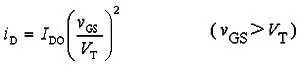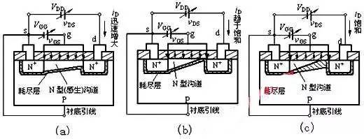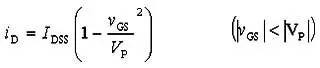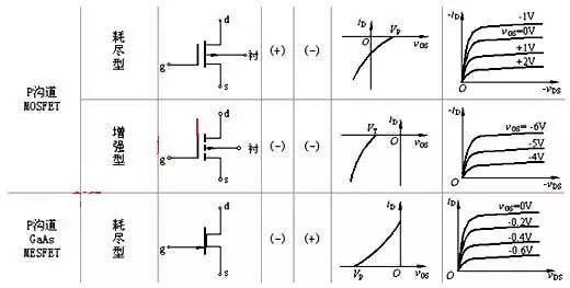 如图(a)所示,当vGS>VT且为一确定值时,漏源电压vDS对导电沟道及电流iD的影响与结型场效应管相似。漏极电流iD沿沟道产生的电压降使沟道内各点与栅极间的电压不再相等,靠近源极一端的电压最大,这里沟道最厚,而漏极一端电压最小,其值为VGD=vGS-vDS,因而这里沟道最薄。但当vDS较小(vDS<vGS–VT)时,它对沟道的影响不大,这时只要vGS一定,沟道电阻几乎也是一定的,所以iD随vDS近似呈线性变化。 随着vDS的增大,靠近漏极的沟道越来越薄,当vDS增加到使VGD=vGS-vDS=VT(或vDS=vGS-VT)时,沟道在漏极一端出现预夹断,如图2(b)所示。再继续增大vDS,夹断点将向源极方向移动,如图2(c)所示。由于vDS的增加部分几乎全部降落在夹断区,故iD几乎不随vDS增大而增加,管子进入饱和区,iD几乎仅由vGS决定。 N沟道增强型MOS管的特性曲线、电流方程及参数(1)特性曲线和电流方程 1)输出特性曲线N沟道增强型MOS管的输出特性曲线如图1(a)所示。与结型场效应管一样,其输出特性曲线也可分为可变电阻区、饱和区、截止区和击穿区几部分。 2)转移特性曲线 转移特性曲线如图1(b)所示,由于场效应管作放大器件使用时是工作在饱和区(恒流区),此时iD几乎不随vDS而变化,即不同的vDS所对应的转移特性曲线几乎是重合的,所以可用vDS大于某一数值(vDS>vGS-VT)后的一条转移特性曲线代替饱和区的所有转移特性曲线。3)iD与vGS的近似关系 与结型场效应管相类似。在饱和区内,iD与vGS的近似关系式为 式中IDO是vGS=2VT时的漏极电流iD。 (2)参数 MOS管的主要参数与结型场效应管基本相同,只是增强型MOS管中不用夹断电压VP ,而用开启电压VT表征管子的特性。 N沟道耗尽型MOS管的基本结构 (1)结构: N沟道耗尽型MOS管与N沟道增强型MOS管基本相似。 (2)区别: 耗尽型MOS管在vGS=0时,漏源极间已有导电沟道产生,而增强型MOS管要在vGS≥VT时才出现导电沟道。 (3)原因: 制造N沟道耗尽型MOS管时,在SiO2绝缘层中掺入了大量的碱金属正离子Na+或K+(制造P沟道耗尽型MOS管时掺入负离子),如图1(a)所示,因此即使vGS=0时,在这些正离子产生的电场作用下,漏源极间的P型衬底表面也能感应生成N沟道(称为初始沟道),只要加上正向电压vDS,就有电流iD。 如果加上正的vGS,栅极与N沟道间的电场将在沟道中吸引来更多的电子,沟道加宽,沟道电阻变小,iD增大。反之vGS为负时,沟道中感应的电子减少,沟道变窄,沟道电阻变大,iD减小。当vGS负向增加到某一数值时,导电沟道消失,iD趋于零,管子截止,故称为耗尽型。沟道消失时的栅-源电压称为夹断电压,仍用VP表示。与N沟道结型场效应管相同,N沟道耗尽型MOS管的夹断电压VP也为负值,但是,前者只能在vGS<0的情况下工作。而后者在vGS=0,vGS>0,VP<vGS<0的情况下均能实现对iD的控制,而且仍能保持栅源极间有很大的绝缘电阻,使栅极电流为零。这是耗尽型MOS管的一个重要特点。图(b)、(c)分别是N沟道和P沟道耗尽型MOS管的代表符号。 (4)电流方程: 在饱和区内,耗尽型MOS管的电流方程与结型场效应管的电流方程相同,即: 各种场效应管特性比较 P沟MOS晶体管金属氧化物半导体场效应(MOS)晶体管可分为N沟道与P沟道两大类,P沟道硅MOS场效应晶体管在N型硅衬底上有两个P+区,分别叫做源极和漏极,两极之间不通导,柵极上加有足够的正电压(源极接地)时,柵极下的N型硅表面呈现P型反型层,成为连接源极和漏极的沟道。改变栅压可以改变沟道中的电子密度,从而改变沟道的电阻。这种MOS场效应晶体管称为P沟道增强型场效应晶体管。如果N型硅衬底表面不加栅压就已存在P型反型层沟道,加上适当的偏压,可使沟道的电阻增大或减小。这样的MOS场效应晶体管称为P沟道耗尽型场效应晶体管。统称为PMOS晶体管。 P沟道MOS晶体管的空穴迁移率低,因而在MOS晶体管的几何尺寸和工作电压绝对值相等的情况下,PMOS晶体管的跨导小于N沟道MOS晶体管。此外,P沟道MOS晶体管阈值电压的绝对值一般偏高,要求有较高的工作电压。它的供电电源的电压大小和极性,与双极型晶体管晶体管逻辑电路不兼容。PMOS因逻辑摆幅大,充电放电过程长,加之器件跨导小,所以工作速度更低,在NMOS电路(见N沟道金属氧化物半导体集成电路)出现之后,多数已为NMOS电路所取代。只是,因PMOS电路工艺简单,价格便宜,有些中规模和小规模数字控制电路仍采用PMOS电路技术。 PMOS集成电路是一种适合在低速、低频领域内应用的器件。PMOS集成电路采用-24V电压供电。如图5所示的CMOS-PMOS接口电路采用两种电源供电。采用直接接口方式,一般CMOS的电源电压选择在10~12V就能满足PMOS对输入电平的要求。 MOS场效应晶体管具有很高的输入阻抗,在电路中便于直接耦合,容易制成规模大的集成电路。 各种场效应管特性比较 ![]() |