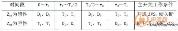 作为转换器家族的新成员之一,谐振型的DC-DC变换器目前推出了串联、并联等多种不同的新种类,正在逐渐的被应用在工业、光伏变电等领域中。这种转换器在工作中可以实现ZVS、ZCS条件,从而能够适应不同环境的工作要求。本文将会就谐振型转换器ZVS、ZCS的实现因素入手,来看一下谐振电路ZVS、ZCS的实现都需要哪些条件。 通常情况下,在谐振型的转换器电路设置中,当开关管互补对称驱动且并联电容与主电路谐振电容数值相差较大时,谐振变换器实现ZVS和ZCS条件基本上可以由谐振网络输入阻抗的性质确定,如下图所示: 图1 谐振电路ZVS、ZCS 条件各时间段导通开关管如下图所示: 图2 谐振全桥变换器开关管导通情况 从图1和图2的参数比对分析中我们可以比较明显的看出,当谐振网络输入阻抗Zin为感性时,输入电流ir滞后于输入电压角度φ,在主开关管被驱动之前,其寄生二极管已经导通,主开关管两端电压被箝位至零,故主开关管为ZVS,而驱动信号被撤走时,主开关管中还流过电流,故为硬关断。当谐振网络输入阻抗Zin为容性(如图1中b图所示)时,输入电流ir超前于输入电压vs角度φ,在主开关被驱动之前,由于同一桥臂另一开关管的寄生二极管已经导通,主开关管两端电压被箝位至输入电压Vin,故为硬开通,而驱动信号被撤走时,主开关管中电流为零,谐振电流流过寄生(反并)二极管,故主开关管为ZCS。由于主开关管实现ZVS或ZCS的条件仅由谐振网络输入电压和电流的相位关系确定,故只要谐振电流ir为与输入电压vs同频率的周期信号,以上结论就成立。 在以上的结论分析研究中,尽管谐振电流参数ir仅含基波成分,但该结论依旧同样适用于谐振电流ir中除了含基波分量以外,也含有3、5、7……次谐波的情况(如多谐振变换器等)。由于当变换器负载一定时,谐振网络输入阻抗Zin的性质是确定的,因此,通常情况下谐振变换器不能同时实现ZVS和ZCS,要同时实现ZVS和ZCS,往往需要在副方增加一些辅助电路,这样会增加电路的复杂性。在该过程中,Zin的性质主要由Zin的虚部决定,当Im[Zin(jws)]>0时,Zin(jws)为感性;当Im[Zin(jws)]<0时,Zin(jws)为容性;当Im[Zin(jws)]=0时,Zin(jws)为纯阻性。