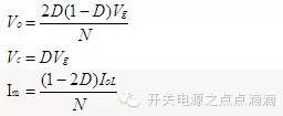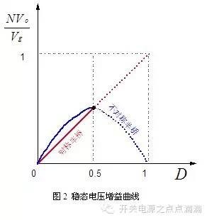 不对称半桥变换器的工作原理: ![]() 图1是不对称驱动半桥变换器的原理图,与对称驱动半桥变换器的差别是,隔直电容Cc与变压器原边串联,开关S1和S2采用互补驱动。在有源开关S1导通、S2截止时,无源开关D1因正偏而导通,无源开关D2因反偏而截止,此时输入给电容Cc充电、并经变压器和二极管D1给输出滤波电感储能(或激磁),和向负载提供能量,输入电压与电容Cc上的电压差也同时给变压器原边的激磁电感激磁;当有源开关S1截止、S2导通时,无源开关D2因正偏导通,无源开关D1因反偏而截止,此时电容Cc上的电压给变压器原边的激磁电感去磁,并经变压器和D2给输出滤波电感提供部分去磁能量;输出滤波电容主要用来限制输出电压上的开关频率纹波分量,使之远远小于稳态的直流输出电压。 在忽略输出电压、电容Cc上电压的开关纹波及输出滤波电感电流、原边激磁电感电流的开关纹波后,我们可利用电感电压伏秒平衡定律、电容电流的安秒平衡定律,推得不对称驱动半桥变换器的稳态关系为(推导过程见方框内): ![]() ![]() 虽然从不对称半桥变换器的演绎过程来看,也可以将它看成是Buck变换器的隔离版本,但它与Buck变换器的稳态关系且有很大的不同。 ![]() 图2是不对称半桥变换器的归一化稳态电压增益曲线(蓝色),它与对称半桥变换器的归一化稳态电压增益曲线(红色)不同,是一种抛物线形状的降压关系。在占空比等于0.5时,稳态电压增益为最大,当占空比小于0.5时,稳态电压增益随占空比增加而增加;当占空比大于0.5时,稳态电压增益随占空比增加而减小。考虑到可稳定的闭环工作,其稳态电压增益的范围必须落在正斜率段,也即占空比必须小于0.5。因为当占空比大于0.5时,只要输出电压一有减小的趋势,负反馈电路就会增加占空比,控制的结果会使输出电压进一步减小,然后再使占空比增加,最后导致输出电压变为零,所以稳态电压增益的负斜率段是无法稳定工作的。在实际设计中,不对称半桥变换器的最大占空比一般取为0.45~0.48。在对称半桥变换器中,由于对称驱动的原因,其最大占空比也必须小于0.5,所以这两种变换器的可工作电压增益为图2中的实线部分。当最大占空比小于0.5时,不对称半桥变换器同样可看作为一种降压变换器。因此从这个意义上,还是可以将其看成Buck变换器的隔离版本。 在不对称半桥变换器中,两个原边开关的稳态电流应力、两个副边二极管的稳态电压及电流应力都是不对称的,这使得不对称半桥变换器的应用受到限制,一般宜用在输入电压范围不是太宽的场合。另一个与对称半桥变换器所不同的是,其原边激磁电感有一个直流激磁,大小与输入电压有关,在输入高限/满载时为最大。这要求不对称半桥变换器中的变压器,必须开有气隙,以避免磁饱和。 在不对称半桥变换器中,可以利用变压器原边的激磁电流,实现原边两个开关的零电压开通,这能减小高压输入时的开关损耗,提高变换器的效率。不对称半桥的一个突出优点是其副边电压波形无死区,可以直接对MOSFET进行自驱动,因此不对称半桥是低压大电流输出开关电源的优选变换器之一。 另外它的动态小信号特性因为原边激磁电感和隔直电容的存在而变差,一般只能用在对动态要求不是很高的场合。 不对称驱动半桥变换器具有优越的稳态特性,但其动态小信号特性较差,目前主要用在中小功率开关电源产品中的第二级(前级为PFC)和输入电压范围不太宽的低压大电流DC-DC中。