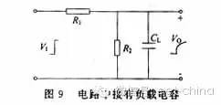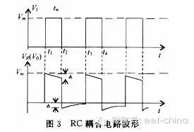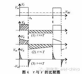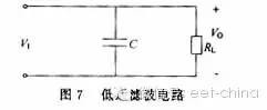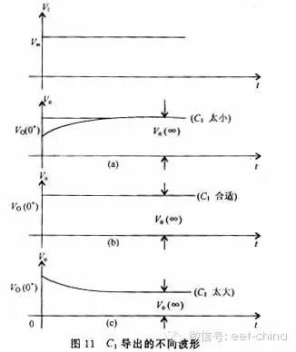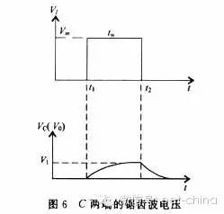 RC电路在模拟电路、脉冲数字电路中得到广泛的应用,由于电路的形式以及信号源和R,C元件参数的不同,因而组成了RC电路的各种应用形式:微分电路、积分电路、耦合电路、滤波电路及脉冲分压器。关键词:RC电路。微分、积分电路。耦合电路。在模拟及脉冲数字电路中,常常用到由电阻R和电容C组成的RC电路,在些电路中,电阻R和电容C的取值不同、输入和输出关系以及处理的波形之间的关系,产生了RC电路的不同应用,下面分别谈谈微分电路、积分电路、耦合电路、脉冲分压器以及滤波电路。1、RC微分电路 如图1所示,电阻R和电容C串联后接入输入信号VI,由电阻R输出信号VO,当RC数值与输入方波宽度tW之间满足:RC<<tW,这种电路就称为微分电路。在R两端(输出端)得到正、负相间的尖脉冲,而且发生在方波的上升沿和下降沿,如图2所示。 ![]() ![]() 在t=t1时,VI由0→Vm,因电容上电压不能突变(来不及充电,相当于短路,VC=0),输入电压VI全降在电阻R上,即VO=VR=VI=Vm。随后(t>t1),电容C的电压按指数规律快速充电上升,输出电压随之按指数规律下降(因VO=VI-VC=Vm-VC),经过大约3τ(τ=R×C)时,VC=Vm,VO=0,τ(RC)的值愈小,此过程愈快,输出正脉冲愈窄。t=t2时,VI由Vm→0,相当于输入端被短路,电容原先充有左正右负的电压Vm开始按指数规律经电阻R放电,刚开始,电容C来不及放电,他的左端(正电)接地,所以VO=-Vm,之后VO随电容的放电也按指数规律减小,同样经过大约3τ后,放电完毕,输出一个负脉冲。只要脉冲宽度tW>(5~10)τ,在tW时间内,电容C已完成充电或放电(约需3τ),输出端就能输出正负尖脉冲,才能成为微分电路,因而电路的充放电时间常数τ必须满足:τ<(1/5~1/10)tW,这是微分电路的必要条件。由于输出波形VO与输入波形VI之间恰好符合微分运算的结果[VO=RC(dVI/dt)],即输出波形是取输入波形的变化部分。如果将VI按傅里叶级展开,进行微分运算的结果,也将是VO的表达式。他主要用于对复杂波形的分离和分频器,如从电视信号的复合同步脉冲分离出行同步脉冲和时钟的倍频应用。2、RC耦合电路图1中,如果电路时间常数τ(RC)>>tW,他将变成一个RC耦合电路。输出波形与输入波形一样。如图3所示。 (1)在t=t1时,第一个方波到来,VI由0→Vm,因电容电压不能突变(VC=0),VO=VR=VI=Vm。(2)t1<t<t2时,因τ>>tW,电容C缓慢充电,VC缓慢上升为左正右负,VO=VR=VI-VC,VO缓慢下降。(3)t=t2时,VO由Vm→0,相当于输入端被短路,此时,VC已充有左正右负电压Δ[Δ=(VI/τ)×tW],经电阻R非常缓慢地放电。(4)t=t3时,因电容还来不及放完电,积累了一定电荷,第二个方波到来,电阻上的电压就不是Vm,而是VR=Vm-VC(VC≠0),这样第二个输出方波比第一个输出方波略微往下平移,第三个输出方波比第二个输出方波又略微往下平移,…,最后,当输出波形的正半周“面积”与负半周“面积”相等时,就达到了稳定状态。也就是电容在一个周期内充得的电荷与放掉的电荷相等时,输出波形就稳定不再平移,电容上的平均电压等于输入信号中电压的直流分量(利用C的隔直作用),把输入信号往下平移这个直流分量,便得到输出波形,起到传送输入信号的交流成分,因此是一个耦合电路。以上的微分电路与耦合电路,在电路形式上是一样的,关键是tW与τ的关系,下面比较一下τ与方波周期T(T>tW)不同时的结果,如图4所示。在这三种情形中,由于电容C的隔直作用,输出波形都是一个周期内正、负“面积”相等,即其平均值为0,不再含有直流成份。①当τ>>T时,电容C的充放电非常缓慢,其输出波形近似理想方波,是理想耦合电路。②当τ=T时,电容C有一定的充放电,其输出波形的平顶部分有一定的下降或上升,不是理想方波。③当τ<<T时,电容C在极短时间内(tW)已充放电完毕,因而输出波形为上下尖脉冲,是微分电路。 3、RC积分电路如图5所示,电阻R和电容C串联接入输入信号VI,由电容C输出信号V0,当RC(τ)数值与输入方波宽度tW之间满足:τ>>tW,这种电路称为积分电路。在![]() ![]() 电容C两端(输出端)得到锯齿波电压,如图6所示。 (3)t=t2时,VI由Vm→0,相当于输入端被短路,电容原先充有左正右负电压VI(VI<Vm)经R缓慢放电,VO(VC)按指数规律下降。这样,输出信号就是锯齿波,近似为三角形波,τ>>tW是本电路必要条件,因为他是在方波到来期间,电容只是缓慢充电,VC还未上升到Vm时,方波就消失,电容开始放电,以免电容电压出现一个稳定电压值,而且τ越大,锯齿波越接近三角波。输出波形是对输入波形积分运算的结果,他是突出输入信号的直流及缓变分量,降低输入信号的变化量。4、RC滤波电路(无源)在模拟电路,由RC组成的无源滤波电路中,根据电容的接法及大小主要可分为低通滤波电路(如图7)和高通滤波电路(如图8)。![]() ![]() (1)在图7的低通滤波电路中,他跟积分电路有些相似(电容C都是并在输出端),但他们是应用在不同的电路功能上,积分电路主要是利用电容C充电时的积分作用,在输入方波情形下,来产生周期性的锯齿波(三角波),因此电容C及电阻R是根据方波的tW来选取,而低通滤波电路,是将较高频率的信号旁路掉(因XC=1/(2πfC),f较大时,XC较小,相当于短路),因而电容C的值是参照低频点的数值来确定,对于电源的滤波电路,理论上C值愈大愈好。(2)图8的高通滤波电路与微分电路或耦合电路形式相同。在脉冲数字电路中,因RC与脉宽tW的关系不同而区分为微分电路和耦合电路;在模拟电路,选择恰当的电容C值,就可以有选择性地让较高频的信号通