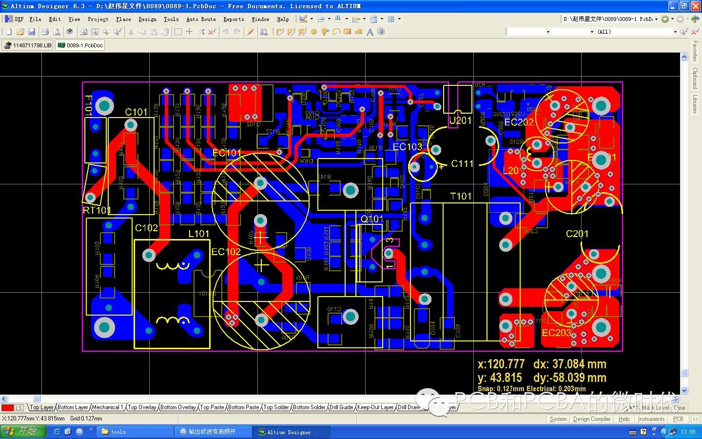 一、 从原理图到PCB的设计流程 建立元件参数->输入原理网表->设计参数设置->手工布局->手工布线->验证设计->复查->CAM输出。 二、 参数设置 相邻导线间距必须能满足电气安全要求,而且为了便于操作和生产,间距也应尽量宽些。最小间距至少要能适合承受的电压,在布线密度较低时,信号线的间距可适当地加大,对高、低电平悬殊的信号线应尽可能地短且加大间距,一般情况下将走线间距设为8mil。焊盘内孔边缘到印制板边的距离要大于1mm,这样可以避免加工时导致焊盘缺损。当与焊盘连接的走线较细时,要将焊盘与走线之间的连接设计成水滴状,这样的好处是焊盘不容易起皮,而是走线与焊盘不易断开。 三、 元器件布局 实践证明,即使电路原理图设计正确,PCB电路板设计不当,也会对电子设备的可靠性产生不利影响。例如,如果PCB电路板两条细平行线靠得很近,则会形成信号波形的延迟,在传输线的终端形成反射噪声;由于电源、地线的考虑不周到而引起的干扰,会使产品的性能下降,因此,在设计PCB电路板的时候,应注意采用正确的方法。 ![]() 每一个开关电源都有四个电流回路: (1). 电源开关交流回路 (2). 输出整流交流回路 (3). 输入信号源电流回路 (4). 输出负载电流回路 输入回路通过一个近似直流的电流对输入电容充电,滤波电容主要起到一个宽带储能作用;类似地,输出滤波电容也用来储存来自输出整流器的高频能量,同时消除输出负载回路的直流能量。所以,输入和输出滤波电容的接线端十分重要,输入及输出电流回路应分别只从滤波电容的接线端连接到电源;如果在输入/输出回路和电源开关/整流回路之间的连接无法与电容的接线端直接相连,交流能量将由输入或输出滤波电容并辐射到环境中去。电源开关交流回路和整流器的交流回路包含高幅梯形电流,这些电流中谐波成分很高,其频率远大于开关基频,峰值幅度可高达持续输入/输出直流电流幅度的5倍,过渡时间通常约为 50ns。这两个回路最容易产生电磁干扰,因此必须在电源中其它印制线布线之前先布好这些交流回路,每个回路的三种主要的元件滤波电容、电源开关或整流器、电感或变压器应彼此相邻地进行放置,调整元件位置使它们之间的电流路径尽可能短。 建立开关电源布局的最好方法与其电气设计相似,最佳设计流程如下: ●放置变压器 ●设计电源开关电流回路 ● 设计输出整流器电流回路 ●连接到交流电源电路的控制电路 ●设计输入电流源回路和输入滤波器 设计输出负载回路和输出滤波器根据电路的功能单元,对电路的全部元器件进行布局时,要符合以下原则: (1) 首先要考虑PCB电路板的尺寸大小。PCB尺寸过大时,印制线条长,阻抗增加,抗噪声能力下降,成本也增加;过小则散热不好,且邻近线条易受干扰。PCB电路板的最佳形状矩形,长宽比为3:2或4:3,位于其边缘的元器件,离电路板边缘一般不小于2mm。 (2) 放置器件时要考虑以后的焊接,不要太密集. (3) 以每个功能电路的核心元件为中心,围绕它来进行布局。元器件应均匀、 整齐、紧凑地排列在PCB电路板上,尽量减少和缩短各元器件之间的引线和连接, 去耦电容尽量靠近器件的VCC (4) 在高频下工作的电路,要考虑元器件之间的分布参数。一般电路应尽可能使元器件平行排列。这样,不但美观,而且装焊容易,易于批量生产。 (5) 按照电路的流程安排各个功能电路单元的位置,使布局便于信号流通,并使信号尽可能保持一致的方向。 (6) 布局的首要原则是保证布线的布通率,移动器件时注意飞线的连接,把有连线关系的器件放在一起。 (7) 尽可能地减小环路面积,以抑制开关电源的辐射干扰。 四、 布线 开关电源中包含有高频信号,PCB电路板上任何印制线都可以起到天线的作用,印制线的长度和宽度会影响其阻抗和感抗,从而影响频率响应。即使是通过直流信号的印制线也会从邻近的印制线耦合到射频信号并造成电路问题(甚至再次辐射出干扰信号)。因此应将所有通过交流电流的印制线设计得尽可能短而宽,这意味着必须将所有连接到印制线和连接到其他电源线的元器件放置得很近。印制线的长度与其表现出的电感量和阻抗成正比,而宽度则与印制线的电感量和阻抗成反比。长度反映出印制线响应的波长,长度越长,印制线能发送和接收电磁波的频率越低,它就能辐射出更多的射频能量。根据印制线路板电流的大小,尽量加租电源线宽度, 减少环路电阻。同时、使电源线、地线的走向和电流的方向一致,这样有助于增强抗噪声能力。接地是开关电源四个电流回路的底层支路,作为电路的公共参考点起着很重要的作用,它是控制干扰的重要方法。因此,在布局中应仔细考虑接地线的放置,将各种接地混合会造成电源工作不稳定。 ![]() 在地线设计中应注意以下几点: 正确选择单点接地通常,滤波电容公共端应是其它的接地点耦合到大电流的交流地的唯一连接点,同一级电路的接地点应尽量靠近,并且本级电路的电源滤波电容也应接在该级接地点上,主要是考虑电路各部分回流到地的电流是变化的,因实际流过的线路的阻抗会导致电路各部分地电位的变化而引入干扰。在本开关电源中,它的布线和器件间的电感影响较小,而接地电路形成的环流对干扰影响较大,因而采用一点接地,即将电源开关电流回路 (中的几个器件的地线都连到接地脚上,输出整流器电流回