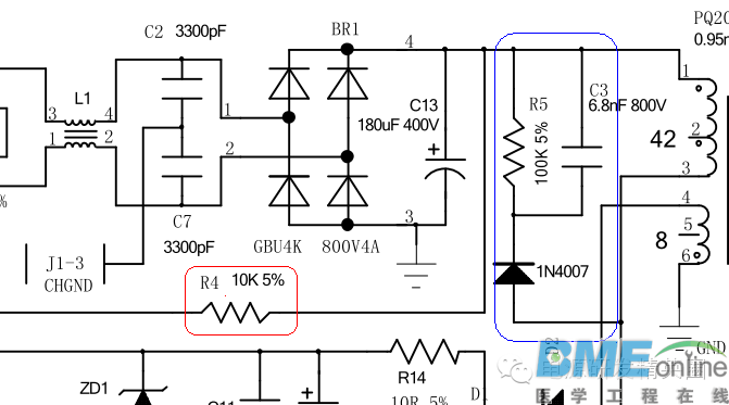 开关电源元器件选型保险丝 ![]() 第一个安规元件保险管 ![]() 1作用: 安全防护。在电源出现异常时,为了保护核心器件不受到损坏。2技术参数: 额定电压V、额定电流I、熔断时间I^2RT。3分类: 快断、慢断、常规 1、0.6为不带功率因数校正的功率因数估值2、Po输出功率3、η 效率(设计的评估值)4、Vinmin 最小的输入电压5、2为经验值,在实际应用中,保险管的取值范围是理论值的1.5~3倍。6、0.98 PF值开关电源元器件选型热敏电阻 ![]() NTC的作用 ![]() NTC是以氧化锰等为主要原料制造的精细半导体电子陶瓷元件。电阻值随温度的变化呈现非线性变化,电阻值随温度升高而降低。利用这一特性,在电路的输入端串联一个负温度系数热敏电阻增加线路的阻抗,这样就可以有效的抑制开机时产生的浪涌电压形成的浪涌电流。当电路进入稳态工作时,由于线路中持续工作电流引起的NTC发热,使得电阻器的电阻值变得很小,对线路造成的影响可以完全忽略。 NTC的选择公式 ![]() 对上面的公式解释如下: 1. Rt 是热敏电阻在T1温度下的阻值; 2. Rn是热敏电阻在Tn常温下的标称阻值; 3. B是材质参数;(常用范围2000K~6000K) 4. exp是以自然数 e 为底的指数( e =2.{{71828:0}} ); 5. 这里T1和Tn指的是K度即开尔文温度,K度=273.15(绝对温度)+摄氏度. 开关电源元器件选型压敏电阻 ![]() 压敏电阻的作用 1、压敏电阻是一种限压型保护器件。利用压敏电阻的非线性特性,当过电压出现在压敏电阻的两极间,压敏电阻可以将电压钳位到一个相对固定的电压值,从而实现对后级电路的保护。 2、主要作用:过电压保护、防雷、抑制浪涌电流、吸收尖峰脉冲、限幅、高压灭弧、消噪、保护半导体元器件等。 3、主要参数有:压敏电压、通流容量、结电容、响应时间等。 4、压敏电阻的响应时间为ns级,比空气放电管快,比TVS管(瞬间抑制二极管)稍慢一些,一般情况下用于电子电路的过电压保护其响应速度可以满足要求。 选取压敏电阻的方法 压敏电阻虽然能吸收很大的浪涌电能量,但不能承受毫安级以上的持续电流,在用作过压保护时必须考虑到这一点。压敏电阻的选用,一般选择标称压敏电压V1mA和通流容量两个参数。 ![]() 1、a 为电路电压波动系数,一般取值1.2. 2、Vrms 为交流输入电压有效值。 3、b 为压敏电阻误差,一般取值0.85. 4、C 为元件的老化系数,一般取值0.9. 5、√2 为交流状态下要考虑峰峰值。 6、V1mA 为压敏电阻电压实际取值近似值 7、通流容量,即最大脉冲电流的峰值是环境温度为25℃情况下,对于规定的冲击电流波形和规定的冲击电流次数而言,压敏电压的变化不超过± 10%时的最大脉冲电流值。 选取压敏电阻的方法 结合前面所述,来看一下本电路中压敏电阻的型号所对应的相关参数。 ![]() ![]() 开关电源元器件选型EMI电路 ![]() EMI电路 根据IEC {{60384:0}}-14,安规电容器分为X电容及Y电容:X电容是指跨与L-N之间的电容器, Y电容是指跨与L-G/N-G之间的电容器. 安规电容之--X电容 1、X电容多选用耐纹波电流比较大的聚脂薄膜类电容。这种类型的电容,体积较大,但其允许瞬间充放电的电流也很大,而其内阻相应较小。 2、X电容容值选取是uF级,此时必须在X电容的两端并联一个安全电阻,用于防止电源线拔插时,由于该电容的充放电过程而致电源线插头长时间带电。 安全标准规定,当正在工作之中的机器电源线被拔掉时,在两秒钟内,电源线插头两端带电的电压(或对地电位)必须小于原来额定工作电压的30%。 3、作为安全电容之一的X电容,也要求必须取得安全检测机构的认证。X电容一般都标有安全认证标志和耐压AC250V或AC275V字样,但其真正的直流耐压高达2000V以上,使用的时候不要随意使用标称耐压AC250V或者DC400V之类的的普通电容来代用。 4、X电容主要用来抑制差模干扰 5、安全等级 峰值脉冲电压 等级(IEC664) 6、X1 >2.5kV ≤4.0kV Ⅲ 7、X2 ≤2.5kV Ⅱ 8、X3 ≤1.2kV 9、X电容没有具体的计算公式,前期选择都是依据经验值,后期在实际测试中,根据测试结果做适当的调整。 10、经验:若电路采用两级EMI,则前级选择0.47uF,后级采用0.1uF电容。若为单级EMI,则选择0.47uF电容。(电容的容量大小跟电源功率没有直接关系) ![]() 安规电容之--Y电容 1、交流电源输入分为3个端子:火线(L)/零线(N)/地线(G)。在火线和地线之间以及在零线和地线之间并接的电容, 这两个Y电容连接的位置比较关键,必须需要符合相关安全标准, 以防引起电子设备漏电或机壳带电,容易危及人身安全及生命。它们都属于安全电容,从而要求电容值不能偏大,而耐压必须较高。 2、Y电容主要用于抑制共模干扰 3、Y电容的存在使得开关电源有一项漏电流的电性指标。工作在亚热带的机器,要求对地漏电电流不能超过0.7mA;工作在温带机器,要求对地漏电电流不能超过0.35mA。因此,Y电容的总容量一般都不能超过4700PF(472)。 Y电容的作用及取值经验 Y电容底下又分为Y1, Y2, Y3,Y4, 主要差別在于: 1. Y1耐高压大于8 kV,属于双重绝缘或加强绝缘|额定电压范围≥ 250V 2. Y2耐高压大于5 kV,属于基本绝缘或附加绝缘|额定电压范围≥150V ≤250V 3. Y3耐高压 ≥2.5KV ≤5KV 属于基本绝缘或附加绝缘|额定电压范围≥150V ≤250V 4. Y4耐高压大于2.5 kV属于基本绝缘或附加绝缘|额定电压范围<150VGJB151中规定Y电容的容量应不大于0.1uF。Y电容除符合相应的电网电压耐压外,还要求这种电容器在电气和机械性能方面有足