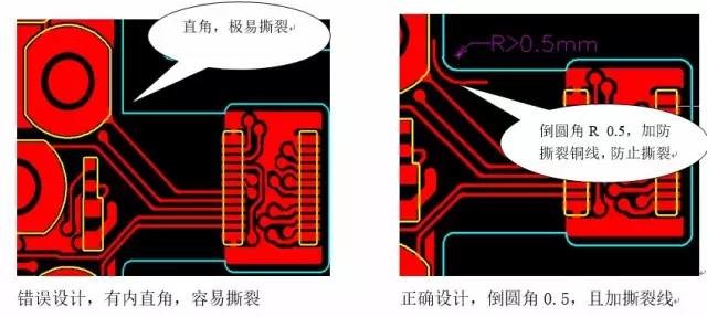 禁忌6、弯折区只有0.5的角度,分板时容易造成撕裂现。不做加强。