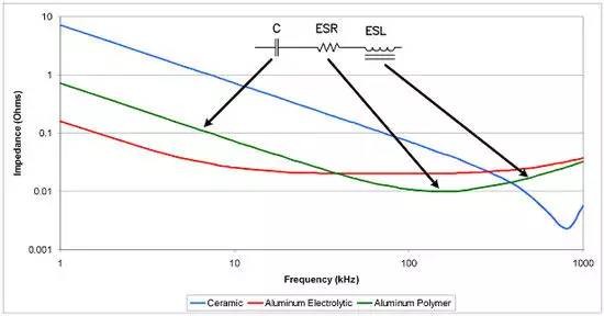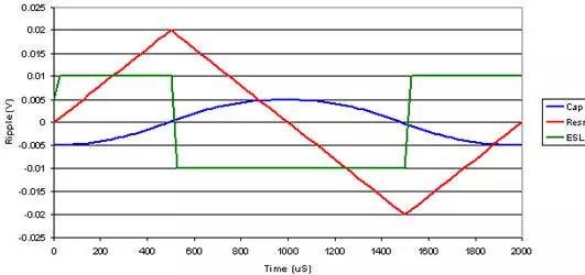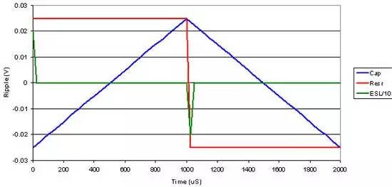 电源纹波和瞬态规格会决定所需电容器的大小,同时也会限制电容器的寄生组成设置。图1显示一个电容器的基本寄生组成,其由等效串联电阻(ESR)和等效串联电感(ESL)组成,并且以曲线图呈现出三种电容器(陶瓷电容器、铝质电解电容器和铝聚合物电容器)的阻抗与频率之间的关系。表1显示了用于生成这些曲线的各个值。这些值为低压(1V~2.5V)、中等强度电流(5A)同步降压电源的典型值。 ![]() 表1:三种电容器比较情况,各有优点。 低频下,所有三种电容器均未表现出寄生分量,因为阻抗明显只与电容相关。但是,铝电解电容器阻抗停止减小,并在相对低频时开始表现出电阻特性。这种电阻特性不断增加,直到达到某个相对高频为止(电容器出现电感)。铝聚合物电容器为与理想状况不符的另一种电容器。有趣的是,它拥有低ESR,并且ESL很明显。陶瓷电容器也有低ESR,但由于其外壳尺寸更小,它的ESL小于铝聚合物和铝电解电容器。 ![]() 图1:寄生对陶瓷、铝和铝聚合物电容器阻抗的改变不同 图2显示运作在500kHz下的连续同步调节器模拟的电源输出电容器波形。它使用图1所示三种电容器的主要阻抗:陶瓷电容;铝ESR;铝聚合物ESL. 红色线条为铝电解电容器,其由ESR主导。因此,纹波电压与电感纹波电流直接相关。蓝色线条代表陶瓷电容器的纹波电压,其拥有小ESL和ESR.这种情况的纹波电压为输出电感纹波电流的组成部分。由于纹波电流为线性,因此这导致一系列时间平方部分,并且外形看似正弦曲线。 最后,绿色线条代表纹波电压,其电容器阻抗由其ESL主导,例如:铝聚合物电容器等。在这种情况下,输出滤波器电感和ESL形成一个分压器。这些波形的相对相位与我们预计的一样。ESL主导时,纹波电压引导输出滤波器电感电流。ESR主导时,纹波与电流同相,而电容主导时,其延迟。现实情况下,输出纹波电压并非仅包含来自这些元件中之一的电压。相反,它是所有三个元件电压之和。因此,在纹波电压波形中都能看到其某些部分。 ![]() 图2:电容器及其寄生要素在连续同步降压调节器中形成不同的纹波电压 图3显示了一个深度连续反激或者降压调节器的波形,其输出电容器电流可以为正和负,而具体状态会不断快速变化。红色线条清楚表明了这种情况,其电压由这种电流乘以ESR得出,结果则为一种方波。电容器元件的电压为方波的组成部分。它导致线性充电和放电,如蓝色三角波形所示。最后,仅当电流在过渡期间变化时,电容器ESL的电压才明显。这种电压会非常高,取决于输出电流升时间。请注意,在这种情况下,绿色线条需除以10(假设25 nS电流过渡)。这些大电感尖峰就是在反激或降压电源中经常出现双级滤波器的众多原因之一。 ![]() 图3:波形随连续反激或者降压输出电流而变化 总之,输出电容器的阻抗有助于提高纹波和瞬态性能。随着电源频率升高,寄生问题的影响更大、更不应忽视。在20kHz附近,铝电解电容器的ESR大到足以主导电容阻抗。在100kHz时,一些铝聚合物电容表现出电感。电源进入兆赫兹开关频率时,请注意所有三种电容器的ESL.