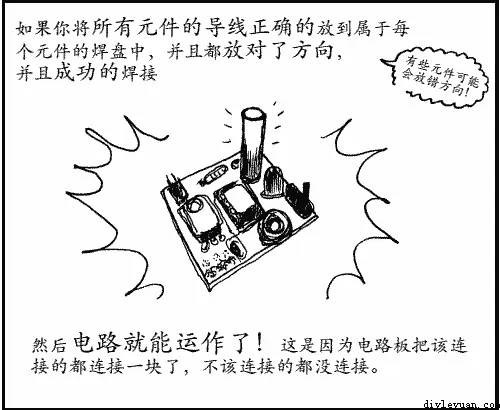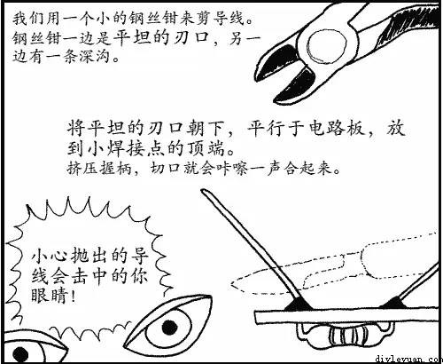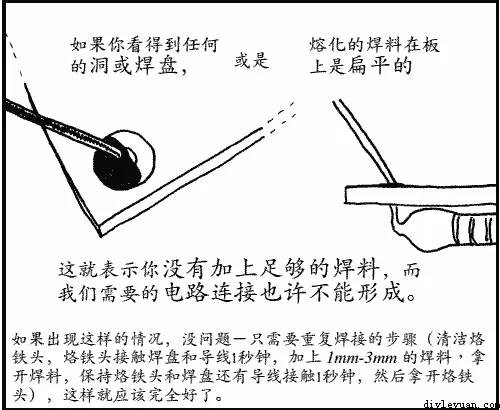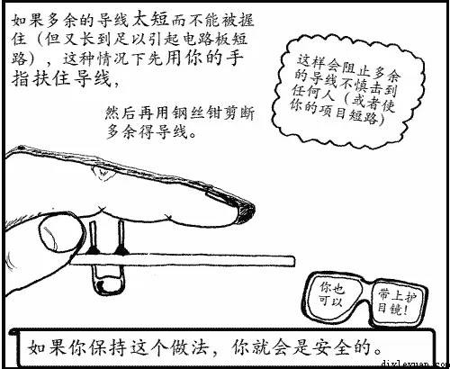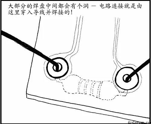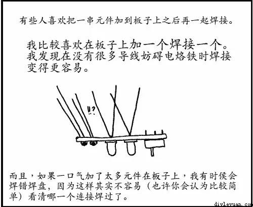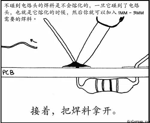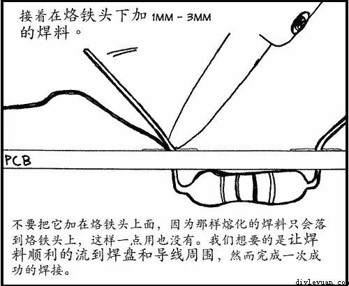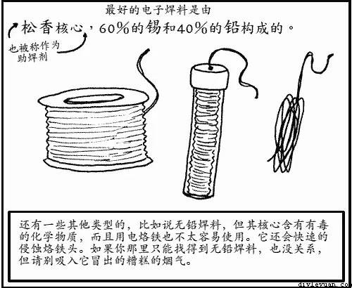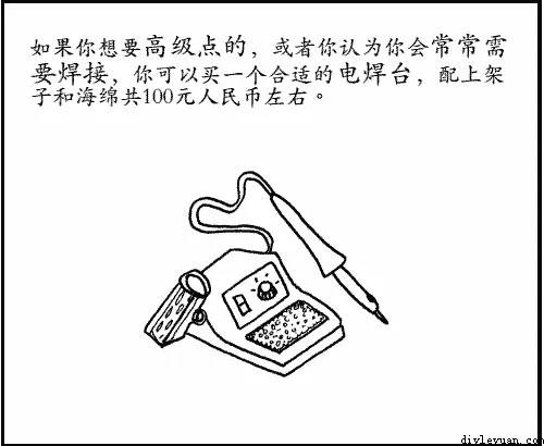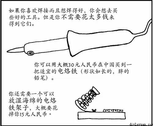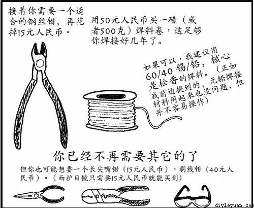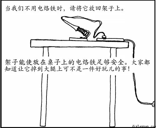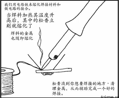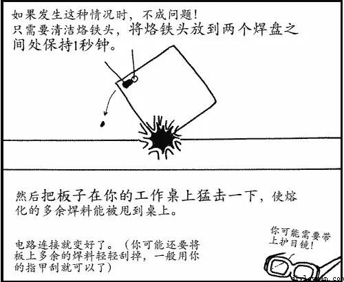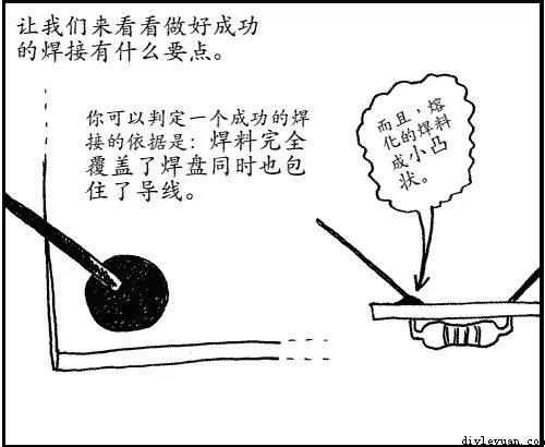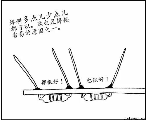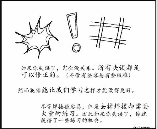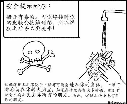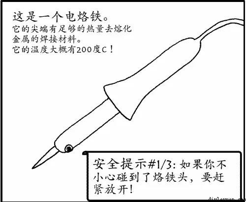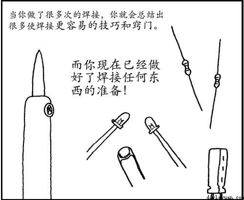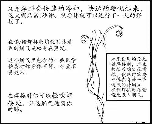 ![]() 确实是很有用的技能。 也是非常容易的!是真的! ![]() 这是一个电烙铁。 它的尖端有足够的热量去熔化金属的焊接材料。它的温度大概有200度C! ![]() 这是焊料。 一般是用锡或铅这两种金属做的。 ![]() 我们用电烙铁来熔化焊接材料和做电路的接合。 当焊料加热其温度升高后,其中的松香立刻就熔化了 ![]() 最好的电子焊料是由松香为心,60%的锡和40%的铅构成的 ![]() 铅是有毒的。当你焊接时你的皮肤会接触到铅,所以焊接之后务必要洗手! ![]() 电子电路是由电子元件连接在一起构成的。 ![]() 印刷电路板让焊接变得简单是因为它带有每个元件的焊盘 ![]() 所有的元件都有露出线端 ![]() 大部分的焊盘中间都会有个洞 - 电路连接就是由这里穿入导线并焊接的! ![]() 如果你将所有元件的导线正确的放到属于每个元件的焊盘中,并且都放对了方向,并且成功的焊接 ![]() 让我们一起来做第一次的焊接吧! ![]() 我们就从一个电阻开始学习焊接。 ![]() 对于大部分印刷电路板来说,所有的元件都要安放到有印刷的那面(我们称之为板子的上端),然后我们要焊接所有板子的底部上的焊盘。 ![]() 需要将印刷电路板反过来才能焊接两个焊盘。 ![]() 如我之前所说,电烙铁加热後足以熔化金属。这意味着烙铁头过热後会快速氧化,也就是说它暴露在空气中会氧化变脏!氧化物是隔热的,因此为了让热量能很好的传导,使我们能做好的焊接工作,在每次焊接前我们都需要先将烙铁头上的氧化物清除掉。 ![]() 记得在每次焊接前都像这样清理一下烙铁头 -它氧化得很快!只有当烙铁头如磨过般银闪闪的,你才能做很好的焊接。 ![]() 用你惯用的手握住电烙铁,就像拿只铅笔一样。 ![]() 用干净的烙铁头同时去接触焊盘和你想焊接元件的导线。在那里放1秒,让一切都顺利的升温。 ![]() 接着在烙铁头下加 1mm - 3mm的焊料。 ![]() 不碰到电烙头的焊料是不会熔化的,一旦它碰到了电烙头,也就是它熔化的时候,然后你就可以加入 1mm - 3mm需要的焊料。 ![]() 保持电烙头在焊盘和导线上的时间多加1秒钟 ![]() 注意焊料会快速的冷却,快速的硬化起来。这大概只需1秒钟。然后你就可以进行下一处的焊接了。 ![]() 当我们不用电烙铁时,请将它放回架子上。 ![]() 让我们来看看做好成功的焊接有什么要点。 ![]() 没有加上足够的焊料 ![]() 太多的焊料 ![]() 两个焊点连接在一起了 ![]() 焊料多点儿少点儿都可以。 ![]() 我比较喜欢在板子上加一个焊接一个。我发现在没有很多导线妨碍电烙铁时焊接变得更容易。 ![]() 在焊接完所有元件的导线之后,就是剪掉多余导线的时候了。 ![]() 我们用一个小的钢丝钳来剪导线。 ![]() 每次剪导线时都务必用一只手握住要剪的导线,然后用另一只手剪断导线。 ![]() 如果多余的导线太短而不能被握住(但又长到足以引起电路板短路),这种情况下先用你的手指扶住导线,然后再用钢丝钳剪断多余得导线。这样会阻止多余的导线不慎击到任何人(或者使你的项目短路) ![]() 有些导线已经很短,比如IC插座,就不需要修剪-它的导线太短了不能够弯曲而导致短路。 ![]() 尽管焊接很容易,但是去掉焊接却需要大量的练习。因此如果你失误了,你就获得了一些练习的机会。 ![]() 当你做了很多次的焊接,你就会总结出很多使焊接更容易的技巧和窍门。 ![]() 你可以用大概30元人民币在中国买到一把适宜的电烙铁 ![]() 你可以买一个合适的电焊台 ![]() 接着你需要一个适合的钢丝钳 享受焊接的乐趣吧!