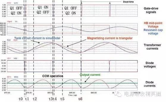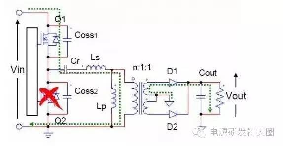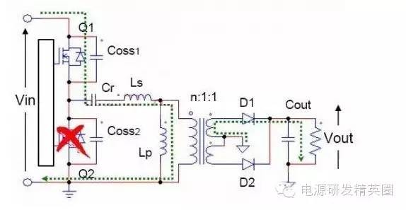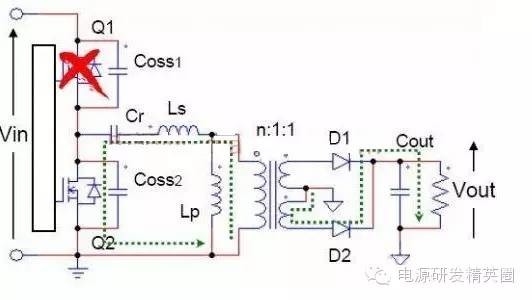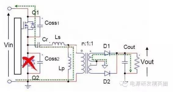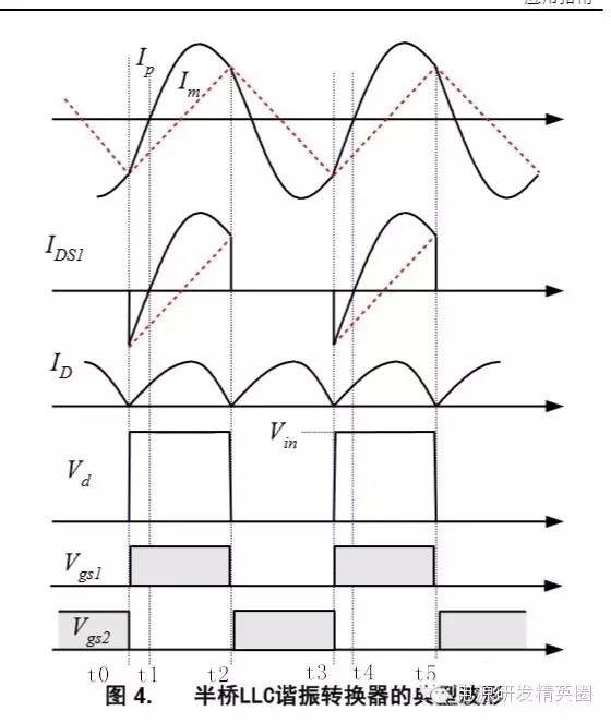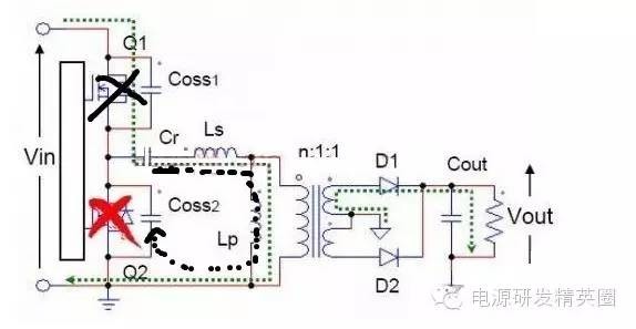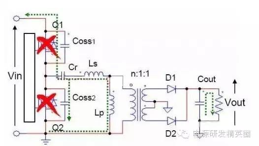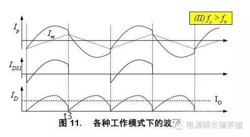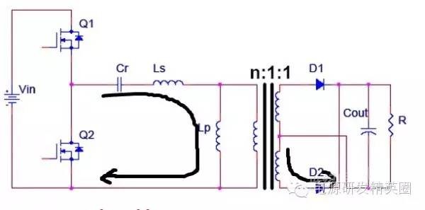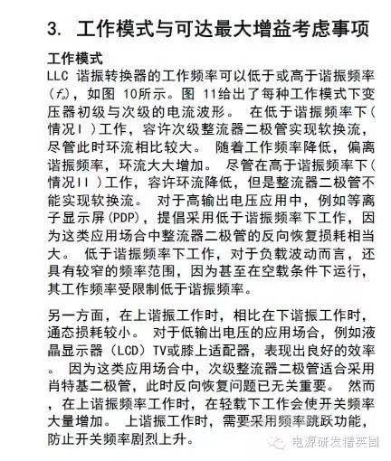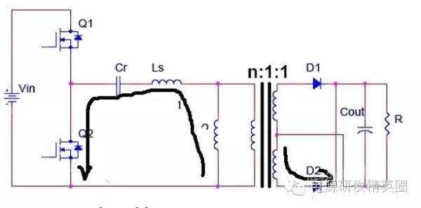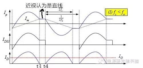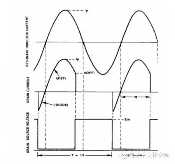 初学者到底该怎样去学习和研发开关电源?--让小编来告诉你 看了网上的大师,以及仙童的LLC计算权威几篇文章,看完之后还是有很多点理解不透,在这里我想通过这几遍文章自己讲解,加深自己对LLC的理解,我想很多想学LLC的兄弟们刚开始也有跟我一样的心情吧 自己也做了一款L6563+L6599的200W电源,调试已完成,会通过实测波形结合自己的讲解。 欢迎新手探讨,高手吐槽,我已准备好 首先要知道为什么要用LLC,因为我们普通的拓补,开关管在开通与关断是没有办法在瞬间完成的,这就有了所谓的开通损耗和关断损耗,看下面图,应该更形象 ![]() 图1 ![]() 图2 大家从下面的波形能看出什么,刚开始看的时候我觉得这个我都有点费劲,看了半天。 第一个波形是谐振波形 第二个波形是MOS管电流波形 第三个是MOS管DS波形 从MOS管DS波形和MOS管电流波形可以看到,MOS管开通的时候,此时MOS管的电流还是在负半轴,这说明了MOS管的电压超前电流,所以谐振网络应该呈现感性 ![]() 图3 对于上面的2个谐振频率可以这样理解: 带载时,LP两端的电压被嵌位,此时谐振频率 空载时(当然后面会讲到死去区间也一样),LP两端的电压没被嵌位,此时谐振频率 ![]() 现在来讲讲谐振网络的工作过程,要想谐振网络呈感性,那么开关频率必须大于谐振频率,这样就有三种可能,fs=fr,fs>fr,fr2<fs<fr.第一种情况是最好理解的,我们就先讲fs=fr时各个点的波形 下面两个图都是fs=fr的时候,第一幅图清晰点,但没有标注时间点,死区时间也没有标出,第二附图有点不清晰,分析还是按照第二幅图来。(我把励磁电感电流从上到下定为正向,从下到上定为负向) ![]() 图4 ![]() 图5 从图上可以看到在t0时刻,此时Q2仍然是导通的,从图上可以看出谐振电流仍然大于励磁电流,谐振电流继续对励磁电流充电,励磁电流线性上升(我把励磁电流从上到下定为正,从下到上定为负) 那么此时副边到底是那个二极管导通呢,我相信刚开始接触LLC的朋友估计会有点纠结,我自己是这样判断的,(假如Q1导通,Q2截止,那么此时励磁电感肯定是上正下负)但此时是Q1截止,Q2导通,根据法拉第定律,此时应该是励磁电感是上负下正,再根据相位来判断 ,很显然这个时候应该是D2导通。图箭头标注的是谐振电流的流向 ![]() 图6 到t1时刻,谐振电流=励磁电流,此时励磁电感没有变化的电流,所以副边没有感应电流流过,此时谐振电流同时给COSS2充电,对COSS1放电(也可以说对COSS1反向充电)COSS1充满后,体二极管导通,此时开通Q1就可以实现ZVS(这里面把体二极管的压降忽略不计) ![]() 图7 下图是FS=fr 黄色是半桥中点的电压波形 紫色是下管的驱动波形 蓝色是谐振电流的波形 从波形可以看到,黄色开通之前,紫色波形是处于负半轴上,之前说过,励磁电流从上到下为正,从下到上为负,那么谐振电流在上管开通之前的方向应该是S-D ![]() 图8 Q1导通后,励磁电感极性变成上正下负,那么很显然此时次级时D1在导通。 Q1刚导通时,谐振电流在负半轴开始减少,此时的谐振电流方向仍然是从S-D,看图1 到T2时刻,谐振电流方向开始变化,由S-D变成D-S,看图2 ![]() 图9 ![]() 图10 t2-t3期间,谐振电流正向对励磁电流充电,在T3时刻,Q1关断,因为FR=FS的关系,此时谐振电流刚好下降到等于励磁电流,那么励磁电感没有变化的电流,次级也就没有感应电流,此时也就是所谓的死区时间(指t3-t4期间),但谐振电流的方向仍然是正向由D-S,(建议结合图5看,比较容易懂)见图1 在死区时间,谐振电流对coss1,coss2充电,由于谐振电流的方向,所以coss2很快被充满电,Q2体二极管导通,此时开通Q2,也就是t4时刻,见图2 ![]() 图11 ![]() 图12 Q2导通之后,在t4-t5区间谐振电流与励磁电流正向减少,此时电流方向仍然为正,很显然,副边感应电流的方向可以让D2导通,见图1 在t5时刻,谐振电流正向减少到0,之后开始负向增加,谐振电流又对励磁电流开始充电,励磁电流线性增加(负向),t5-t6时刻谐振电流的方向为负,见图2(图中2中大家会对次级时那个二极管导通又疑惑吗?我刚开始看的时候就有,我以为此时应该是D1导通,很迷茫,后来才明白,对于怎么判断是那个二极管导通,最好的办法是之前讲过,Q1导通的时候励磁电感是上正下负,Q2导通的时候励磁电感是上负下正,这样就好分析了) ![]() 图13 ![]() 图14 现在来讲讲fs>fr的情况,大部分跟fs=fr的情况,主要讲讲不同之处 不同之处主要在t3时刻,由于fs>fr,谐振周期大于开关周期,t3时刻Q1关断,但此时谐振电流仍然大于励磁电流,谐振电流迅速对励磁电流充电。在谐振电流下降到励磁电流之前,副边仍然有电流流过,励磁电感仍然被嵌位。谐振电感两端的电压是VC-NVO,那电流的下降斜率就是(VC-NVO)/LR。见图 ![]() 图15 接下来讲讲fr2<fs<fr,也主要讲讲在t3时刻的不同之处 由于fr2<fs<fr,谐振周期小于开关周期,在t3时刻谐振电流等于励磁电流,副边也就没有电流流过,励磁电感没有被嵌位,此时Q1还处于导通状态,LR,CR,LM共同谐振,那么根据公式1/2π√(LR+LM)*CR可知,相对fr而言此时的谐振频率比较低,那么此时的谐振周期就很大,所以在t3-t4期间可以近似的认为是线性的变化。见图 ![]() 图16 下图是用FHA等效法来计算RAC的阻抗,公式有些地方也没太懂,希望高手过来指点下 ![]() 图17 得到谐振槽的阻抗之后可以得到谐振电路的电压增益M. M=输出电压/输入电压=2nVO/VIN 式1 图中的公式是怎么得来的我也不清楚,所以也就没法解释了 ![]() 式2 从电压增益公