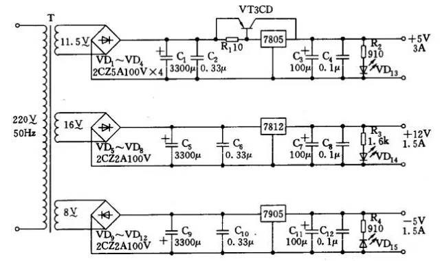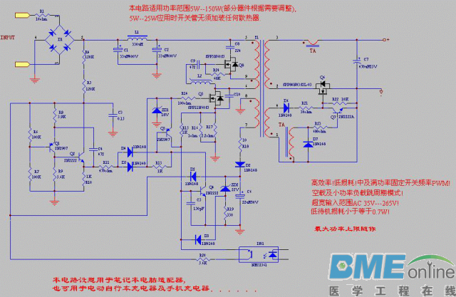 ![]() ![]() ![]() ![]() ![]() ![]() ![]() ![]() ![]() ![]() 开关电源电路图 一、主电路 从交流电网输入、直流输出的全过程,包括: 1、输入滤波器:其作用是将电网存在的杂波过滤,同时也阻碍本机产生的杂波反馈到公共电网。 2、整流与滤波:将电网交流电源直接整流为较平滑的直流电,以供下一级变换。 3、逆变:将整流后的直流电变为高频交流电,这是高频开关电源的核心部分,频率越高,体积、重量与输出功率之比越小。 4、输出整流与滤波:根据负载需要,提供稳定可靠的直流电源。 二、控制电路 一方面从输出端取样,经与设定标准进行比较,然后去控制逆变器,改变其频率或脉宽,达到输出稳定,另一方面,根据测试电路提供的资料,经保护电路鉴别,提供控制电路对整机进行各种保护措施。 三、检测电路 除了提供保护电路中正在运行中各种参数外,还提供各种显示仪表资料。 四、辅助电源 提供所有单一电路的不同要求电源。 开关控制稳压原理 开关K以一定的时间间隔重复地接通和断开,在开关K接通时,输入电源E通过开关K和滤波电路提供给负载RL,在整个开关接通期间,电源E向负载提供能量;当开关K断开时,输入电源E便中断了能量的提供。可见,输入电源向负载提供能量是断续的,为使负载能得到连续的能量提供,开关稳压电源必须要有一套储能装置,在开关接通时将一部份能量储存起来,在开关断开时,向负载释放。图中,由电感L、电容C2和二极管D组成的电路,就具有这种功能。电感L用以储存能量,在开关断开时,储存在电感L中的能量通过二极管D释放给负载,使负载得到连续而稳定的能量,因二极管D使负载电流连续不断,所以称为续流二极管。在AB间的电压平均值EAB可用下式表示: EAB=TON/T*E 式中TON为开关每次接通的时间,T为开关通断的工作周期(即开关接通时间TON和关断时间TOFF之和)。 由式可知,改变开关接通时间和工作周期的比例,AB间电压的平均值也随之改变,因此,随着负载及输入电源电压的变化自动调整TON和T的比例便能使输出电压V0维持不变。改变接通时间TON和工作周期比例亦即改变脉冲的占空比,这种方法称为“时间比率控制”(Time Ratio Control,缩写为TRC)。 按TRC控制原理,有三种方式: 一、脉冲宽度调制(Pulse Width Modulation,缩写为PWM) 开关周期恒定,通过改变脉冲宽度来改变占空比的方式。 二、脉冲频率调制(Pulse Frequency Modulation,缩写为PFM) 导通脉冲宽度恒定,通过改变开关工作频率来改变占空比的方式。 三、混合调制 导通脉冲宽度和开关工作频率均不固定,彼此都能改变的方式,它是以上二种方式的混合。