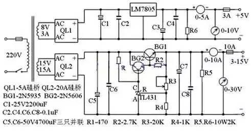 本文搜罗了稳压电源、DCDC转换电源、开关电源、充电电路、恒流源相关的经典电路资料,为工程师提供最新鲜的电路图参考资料。 一、稳压电源 1、3~25V电压可调稳压电路图 此稳压电源可调范围在3.5V~25V之间任意调节,输出电流大,并采用可调稳压管式电路,从而得到满意平稳的输出电压。 工作原理:经整流滤波后直流电压由R1提供给调整管的基极,使调整管导通,在V1导通时电压经过RP、R2使V2导通,接着V3也导通,这时V1、V2、 V3的发射极和集电极电压不再变化(其作用完全与稳压管一样)。调节RP,可得到平稳的输出电压,R1、RP、R2与R3比值决定本电路输出的电压值。 元器件选择:变压器T选用80W~100W,输入AC220V,输出双绕组AC28V。FU1选用1A,FU2选用3A~5A。VD1、VD2选用 6A02。RP选用1W左右普通电位器,阻值为250K~330K,C1选用3300μF/35V电解电容,C2、C3选用0.1μF独石电容,C4选用 470μF/35V电解电容。R1选用180~220Ω/0.1W~1W,R2、R4、R5选用10KΩ、1/8W。V1选用2N3055,V2选用 3DG180或2SC3953,V3选用3CG12或3CG80 ![]() 2、10A3~15V稳压可调电源电路图 无论检修电脑还是电子制作都离不开稳压电源,下面介绍一款直流电压从3V到15V连续可调的稳压电源,最大电流可达10A,该电路用了具有温度补偿特性的,高精度的标准电压源集成电路TL431,使稳压精度更高,如果没有特殊要求,基本能满足正常维修使用,电路见下图。 ![]() 其工作原理分两部分,第一部分是一路固定的5V1.5A稳压电源电路。第二部分是另一路由3至15V连续可调的高精度大电流稳压电路。第一路的电路非常简单,由变压器次级8V交流电压通过硅桥QL1整流后的直流电压经C1电解电容滤波后,再由5V三端稳压块LM7805不用作任何调整就可在输出端产生固定的5V1A稳压电源,这个电源在检修电脑板时完全可以当作内部电源使用。第二部分与普通串联型稳压电源基本相同,所不同的是使用了具有温度补偿特性的,高精度的标准电压源集成电路TL431,所以使电路简化,成本降低,而稳压性能却很高。图中电阻R4,稳压管TL431,电位器R3组成一个连续可调得恒压源,为BG2基极提供基准电压,稳压管TL431的稳压值连续可调,这个稳压值决定了稳压电源的最大输出电压,如果你想把可调电压范围扩大,可以改变R4 和R3的电阻值,当然变压器的次级电压也要提高。变压器的功率可根据输出电流灵活掌握,次级电压15V左右。桥式整流用的整流管QL用15-20A硅桥,结构紧凑,中间有固定螺丝,可以直接固定在机壳的铝板上,有利散热。调整管用的是大电流NPN型金属壳硅管,由于它的发热量很大,如果机箱允许,尽量购买大的散热片,扩大散热面积,如果不需要大电流,也可以换用功率小一点的硅管,这样可以做的体积小一些。滤波用50V4700uF电解电容C5和C7分别用三只并联,使大电流输出更稳定,另外这个电容要买体积相对大一点的,那些体积较小的同样标注50V4700uF尽量不用,当遇到电压波动频繁,或长时间不用,容易失效。最后再说一下电源变压器,如果没有能力自己绕制,有买不到现成的,可以买一块现成的200W以上的开关电源代替变压器,这样稳压性能还可进一步提高,制作成本却差不太多,其它电子元件无特殊要求,安装完成后不用太大调整就可正常工作。 二、开关电源 1、PWM开关电源集成控制IC-UC3842工作原理 UC3842工作原理 下图为UC3842 内部框图和引脚图,UC3842 采用固定工作频率脉冲宽度可控调制方式,共有8 个引脚,各脚功能如下:①脚是误差放大器的输出端,外接阻容元件用于改善误差放大器的增益和频率特性;②脚是反馈电压输入端,此脚电压与误差放大器同相端的2.5V 基准电压进行比较,产生误差电压,从而控制脉冲宽度;③脚为电流检测输入端, 当检测电压超过1V时缩小脉冲宽度使电源处于间歇工作状态;④脚为定时端,内部振荡器的工作频率由外接的阻容时间常数决定,f=1.8/(RT×CT);⑤脚为公共地端;⑥脚为推挽输出端,内部为图腾柱式,上升、下降时间仅为50ns 驱动能力为±1A ;⑦脚是直流电源供电端,具有欠、过压锁定功能,芯片功耗为15mW;⑧脚为5V 基准电压输出端,有50mA 的负载能力。 ![]() UC3842 内部原理框图 UC3842是一种性能优异、应用广泛、结构较简单的PWM开关电源集成控制器,由于它只有一个输出端,所以主要用于音端控制的开关电源。 UC3842 7脚为电压输入端,其启动电压范围为16-34V。在电源启动时,VCC﹤16V,输入电压施密物比较器输出为0,此时无基准电压产生,电路不工作;当 Vcc﹥16V时输入电压施密特比较器送出高电平到5V蕨稳压器,产生5V基准电压,此电压一方面供销内部电路工作,另一方面通过⑧脚向外部提供参考电压。一旦施密特比较器翻转为高电平(芯片开始工作以后),Vcc可以在10V-34V范围内变化而不影响电路的工作状态。当Vcc低于10V时,施密特比较器又翻转为低电平,电路停止工作。 当基准稳压源有5V基准电压输出时,基准电压检测逻辑比较器即达出高电平信号到输出电路。同时,振荡器将根据④脚外接Rt、Ct参数产生 f=/Rt.Ct的振荡信号,此信号一路直接加到图腾柱电路的输入端,另一路加到PWM脉宽市制RS触发器的置位端,RS型PWN脉宽调制器的R端接电流检测比较器输出端。R端为占空调节控制端,当R电压上升时,Q端脉冲加宽,同时⑥脚送出脉宽也加宽(占空比增多);当R端电压下降时,Q端脉冲变窄,同时 ⑥脚送出脉宽也变变窄(占空比减小)。UC3842各点时序如图所示,只有当E点为高电平时才有信号输出 ,并且a、b点全为