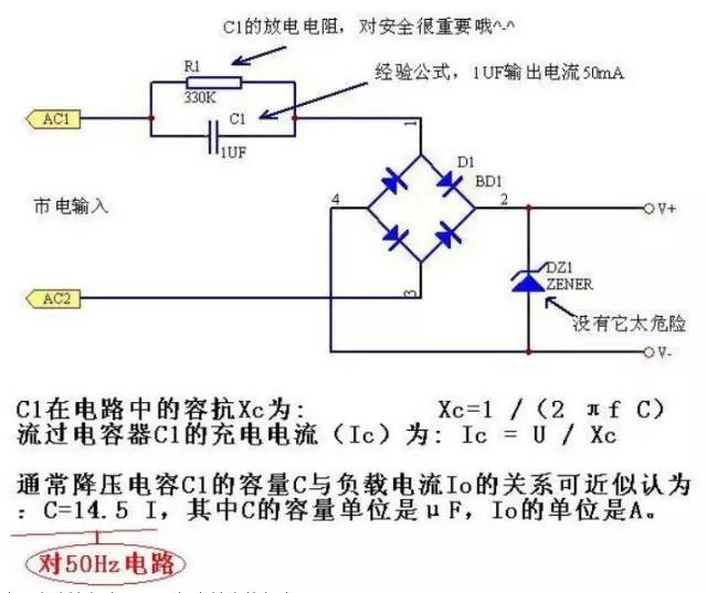 将交流市电转换为低压直流的常规方法是采用变压器降压后再整流滤波,当受体积和成本等因素的限制时,最简单实用的方法就是采用电容降压式电源。 一、电路原理 ![]() 电容降压式简易电源的基本电路如图1,C1为降压电容器,D2为半波整流二极管,D1在市电的负半周时给C1提供放电回路,D3是稳压二极管,R1为关断电源后C1的电荷泄放电阻。在实际应用时常常采用的是图2的所示的电路。当需要向负载提供较大的电流时,可采用图3所示的桥式整流电路。 整流后未经稳压的直流电压一般会高于30伏,并且会随负载电流的变化发生很大的波动,这是因为此类电源内阻很大的缘故所致,故不适合大电流供电的应用场合。 二、器件选择 1.电路设计时,应先测定负载电流的准确值,然后参考示例来选择降压电容器的容量。因为通过降压电容C1向负载提供的电流Io,实际上是流过C1的充放电电流Ic。C1容量越大,容抗Xc越小,则流经C1的充、放电电流越大。当负载电流Io小于C1的充放电电流时,多余的电流就会流过稳压管,若稳压管的最大允许电流Idmax小于Ic-Io时易造成稳压管烧毁. 2.为保证C1可靠工作,其耐压选择应大于两倍的电源电压。3.泄放电阻R1的选择必须保证在要求的时间内泄放掉C1上的电荷。 三、设计举例 图2中,已知C1为0.33μF,交流输入为220V/50Hz,求电路能供给负载的最大电流。 C1在电路中的容抗Xc为: Xc=1 /(2 πf C)= 1/(2*3.14*50*0.33*10-6)= 9.65K 流过电容器C1的充电电流(Ic)为: Ic = U / Xc = 220 / 9.65 = 22mA。 通常降压电容C1的容量C与负载电流Io的关系可近似认为:C=14.5I,其中C的容量单位是μF,Io的单位是A。 电容降压式电源是一种非隔离电源,在应用上要特别注意隔离,防止触电 阻容降压原理和计算公式 这一类的电路通常用于低成本取得非隔离的小电流电源。它的输出电压通常可在几伏到三几十伏,取决于所使用的齐纳稳压管。所能提供的电流大小正比于限流电容容量。采用半波整流时,每微法电容可得到电流(平均值)为:(国际标准单位) I(AV)=0.44*V/Zc=0.44*220*2*Pi*f*C =0.44*220*2*3.14*50*C=30000C =30000*0.000001=0.03A=30mA f为电源频率单位HZ;C为电容容值单位F法拉;V为电源电压单位伏V;Zc=2*Pi*f*C为阻抗阻值单位欧姆。 如果采用全波整流可得到双倍的电流(平均值)为: I(AV)=0.89*V/Zc=0.89*220*2*Pi*f*C =0.89*220*2*3.14*50*C=60000C =60000*0.000001=0.06A=60mA 一般地,此类电路全波整流虽电流稍大,但是因为浮地,稳定性和安全性要比半波整流型更差,所以用的更少。 使用这种电路时,需要注意以下事项: 1、未和220V交流高压隔离,请注意安全,严防触电! 2、限流电容须接于火线,耐压要足够大(大于400V),并加串防浪涌冲击兼保险电阻和并放电电阻。 3、注意齐纳管功耗,严禁齐纳管断开运行。电容降压原理 电容降压的工作原理并不复杂。他的工作原理是利用电容在一定的交流信号频率下产生的容抗来限制最大工作电流。例如,在50Hz的工频条件下,一个1uF的电容所产生的容抗约为3180欧姆。当220V的交流电压加在电容器的两端,则流过电容的最大电流约为70mA。虽然流过电容的电流有70mA,但在电容器上并不产生功耗,应为如果电容是一个理想电容,则流过电容的电流为虚部电流,它所作的功为无功功率。根据这个特点,我们如果在一个1uF的电容器上再串联一个阻性元件,则阻性元件两端所得到的电压和它所产生的功耗完全取决于这个阻性元件的特性。例如,我们将一个110V/8W的灯泡与一个1uF的电容串联,在接到220V/50Hz的交流电压上,灯泡被点亮,发出正常的亮度而不会被烧毁。因为110V/8W的灯泡所需的电流为8W/110V=72mA,它与1uF电容所产生的限流特性相吻合。同理,我们也可以将5W/65V的灯泡与1uF电容串联接到220V/50Hz的交流电上,灯泡同样会被点亮,而不会被烧毁。因为5W/65V的灯泡的工作电流也约为70mA。因此,电容降压实际上是利用容抗限流。而电容器实际上起到一个限制电流和动态分配电容器和负载两端电压的角色。 阻容降压电路什么样计算 我想做一个阻容降压电路,用电容和电阻把220VAC降压降到6VDC,以此来供LED工作,不用变压器。但是不知道什么样计算用多大阻值多大功率的电阻,用哪种的电容,电容的容量用多大。这些什么样计算出来? 问题补充:所求的是降压电容和降压电阻的容量和阻值大小和功率,还有用哪种种类的电容或电阻?另外滤波电容的容量什么算? 电容降压是恒流方式的,电压必须由齐纳管确定,也就是稳压管。如果你用它带动LED,必须要加与LED电压对应的稳压管。 半波整流方式计算应该是每uF电容量提供约30mA电流,这是在中国的50Hz220V线路上的参考。 全波整流时电流加倍,即每uF可提供60mA电流。 为了安全,最好不使用全波,因为它是悬浮地的。 我家里的LED夜灯就是我用电容降压自己接的,有兴趣可以与我交流一下。LED照明不是很简单的事情,我以前用变压器都烧坏过十来个LED了。白LED是静电敏感的,还有要良好的保护及防静电措施。 电容量(uf)=电流(mA)/15 限流电阻(Ω)=310/最大允许浪涌电流 放电电阻(KΩ)=500/电容(uf) 假如仅作指示灯的话,耐压400v 0.01uf的就可以(以前试过,直接串联,不过可能电容大小记得不是很清楚 太久了) 使用标准的容抗来等效计算 假如照明的话,涉及到一些因素,最好不要这样接。假如仅仅是为了体积的话可以使用专用的降压模块。 假如考虑成本的话,作小功率的开关电源也可以。 假如是阵列的话,直接串联