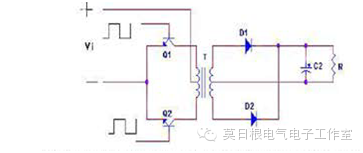 开关电源的推挽拓扑结构 ★新手入门拓扑结构推挽篇 推挽式开关电源设计中基础拓扑结构之一 推挽电路就是两个不同极性晶体管连接的输出电路。推挽电路采用两个参数相同的功率BJT管或MOSFET管,以推挽方式存在于电路中,各负责正负半周的波形放大任务,电路工作时,两只对称的功率管每次只有一个导通,所以导通损耗小效率高。推挽输出既可以向负载灌电流,也可以从负载抽取电流。 如果输出级有两个三极管,始终处于一个导通、一个截止的状态,也就是两个三极管推挽相连,这样的电路结构称为推挽式电路或图腾柱(Totem-pole)输出电路。 ![]() ![]() 上图为推挽变换器原理图。推挽变压器有两个三极管在交替开关,已达到比单管工作电路的输出功率,由于初级线圈的中心抽头接在输入电源的正极,这样当一边三极管导通时,另一边的三极管要承受耐压与两倍的电源电压,这对晶体管要求较高。 优点: 结构简单,开关变压器磁芯利用率高,推挽电路工作时,两只对称的功率开关管每次只有一个导通,所以导通损耗小。 缺点: 变压器带有中心抽头,而且开关管的承受电压较高;由于变压器原边漏感的存在,功率开关管关断的瞬间,漏感极会产生较大的电压尖峰,另外输入电流纹波较大,因而输入滤波器的体积较大。 ![]() ★主流IC SG3525是美国硅通用半导体公司推出的一种性能优良、功能齐全和通用性强的单片集成PWM控制芯片,它简单可靠、方便灵活,输出驱动我推拉输出形式,增加了驱动能力;内部含有欠压锁定电路、软启动控制电路、PWM锁存器,有过流保护功能,频率可调,同时能限制最大占空比。 IR2110是美国IR公司生产的一款驱动器。它兼有光耦隔离(体积小)和电磁隔离(速度快)的优点,是中小功率变换器装置中驱动器件的首选品种。 UC3846采用定频电流模式控制,改善了系统的线电压调节率和负载响应特性,简化了控制环路的设计。 IR2112S是IR公司一款推挽式驱动器,它是高电压、高放大率MOSFET和带独立的推挽放大器,为了自举工作方式,门驱动器供电范围从10V到20V。 ★工程师推荐:电流馈电推挽式逆变电路图设计 电流馈电推挽式逆变电路如图1所示,图中直流电压经电感L1送到变压器Tr的中心抽头,L1与跨接余Tr初级绕组两端的电容C2组成手续谐振电路,R1、R2、C1组成启动电路,其原理同图2,由于Np与Nb的正反馈作用,驱动VT1、VT2轮流交替导通。 ![]() 图一 在这个电路中,开关晶体管集电极所承受的最高电压约为直流电压VDC的π倍。对于市电压为110V/120V/127V的地区,采用这种电路是合适的。本电路晶体管输出亦为正弦电压。即使负载开路式短路,负载变化很大,逆变器任然可以连续工作,如图1、2中即使一个灯管失效,电路仍能正常工作。 Motorola公司1996年生产的一带二灯的电子整流器就是采用这种电路模式,器具体电路如图2所示。 ![]() 图中C1、R1及VD组成启动电路,高频逆变电路由VT1、VT2、变压器Tr、C2等组成,由变压器提供正反馈,使得VT1、VT2轮流交替导通与截止。