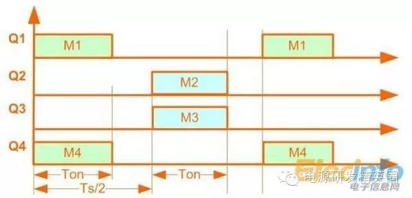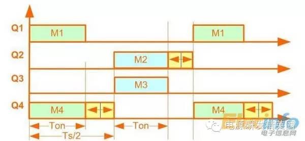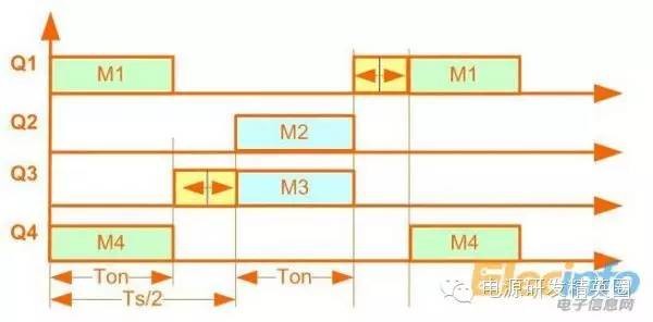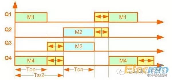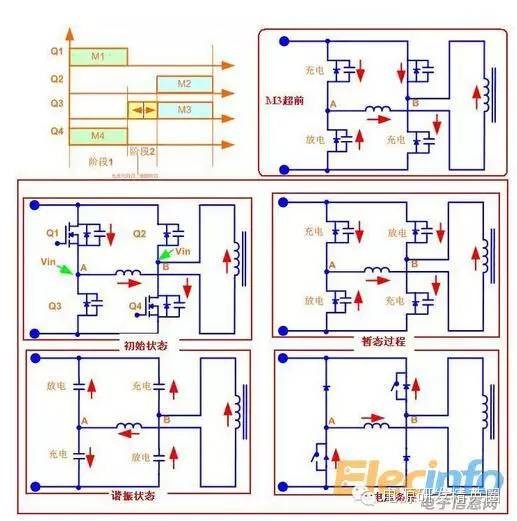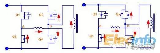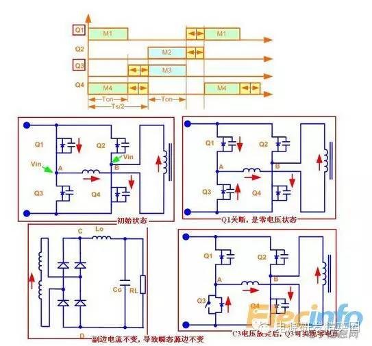 全桥是将四个二极管封装在一起形成连接好的桥式整流电路。由于全桥电路封闭性较强,不容易产生泄流;而半桥电路在振荡转换之间就很容易出现使电流波形变坏的情况,并且产生干扰。所以有些电源的设计就选择了全桥电路来进行产品的设计。本文主要介绍了全桥电路的基础拓扑结构,并且对通导时间做出了解释。 这里整理一下移相全桥电路的基础,基础的拓扑结构为: ![]() 其控制方法在《脉宽调制DC/DC全桥变换器的软开关技术》划分为9类,不过可综合成下面四种组态: ![]() 1.两臂固定导通时间 Ton=D×Ts/2; ![]() 2.Q1&Q3向前导通 Ton=(D×Ts/2+Tadd)~Ts/2,可调节; 【可细分为Ton=Ts/2和Ton<> ![]() 3.Q2&Q4向后导通Ton=(D×Ts/2+Tadd)~Ts/2,可调节; 【可细分为Ton=Ts/2和Ton<> ![]() 4.Q2&Q4向后导通并且Q1&Q3向前导通; Ton=(D×Ts/2+Tadd)~Ts/2,可调节; 【可细分为Ton1定义工作状态:】 ![]() 第一、+1状态: Q1, Q4同时导通,或d1,d4同时导通。a,b两点间电压Vab=+Vin。 第二、-1状态: Q3,Q2同时导通,或d3,d2同时导通。a,b两点间电压Vab =-Vin。 第三、0 状态: (Q1,Q4)&(d1,d4)不同时导通,并且(Q3,Q2)&(d3, d2)不同时导通。a,b两点间电压Vab=0。 三种切换方式1.+1=>-1^-1=>+1 分析过程: ![]() 初始时刻:Q1、Q4导通,向副边传输能量。 下一时刻,Q1、Q4同时关断。因为有C1,C4,Q1,Q4电压缓升,是零电压关断。在变压器原边漏感Lt的影响下,原边电流方向不变,该电流给C1,C4充电,C2,C3放电。 C1,C4充电至vin,C2,C3放电至0后,二极管D2,D3导通(Vab=-Vin) 。以上是暂态过程,实际持续的时间很短,但是由于存在一段时间(Doff),因此此时随着Ip的下降至零,开关管及其反并二极管都在关断状态,电容和漏感发生谐振,导致C2,C3在Q2,Q3开通的时候电压并不为零,因此电容的能量完全消耗在开关管上,这样无法实现软开关。因此+1=>-1时是无法实现软开关的。 2.+1=>0^-1=>0 ![]() 超前臂为Q1和Q3,Q1关断时C1电压为0,因此实现了零电压关断。Q1 关闭以后,由于副边电流不变,也不变,Ip导致C1成线性电压充电,线性电压放电。C3 C3电压放完后,D3导通,由此Q3可顺利实现零电压开通。Q3开通后,Vab=0,这就是所谓的+1=>0的过程。 零状态存在两种模式: 第一、Ip为很恒定电流(恒流模式) 第二、Ip为零(复位模式) ![]() 3.0=>+1^0 =>-1 漏感中仍存在电流 Q4 断时,电流从Q4网络充至C2和C4,C2的压降下降,C4的压降增加。当C2电压为零时,D2开通,Q2了顺利实现零电压开通。这种方式成为 0=>+1的过程。 但是漏感过小导致了C4的电压并不能一定增加到Vin,因此可能需要增加辅助网络。漏感已无电流Q4零电流关断,Q2也是零电流开通。以上所有的分析还需要仿真模型进行进一步的支持。 在成本方面,半桥电路的成本较低,电路也比较容易形成。而全桥电路的成本比较高,并且电路相对复杂。但是通过介绍我们也能看出全桥电路的某些特点也是半桥电路所不具备的。所以充分了解好两种电路的基础知识并且加以灵活的运用就能巧妙的弥补这两种电路缺点并且扬长避短。 往期文章 可控硅调光中的LED闪烁原因总结 教你计算电容寿命 基础讲解:有关电位器的那些注意事项 探讨开关电源中的RCD吸收设计 如何避免开关电源设计中PCB电磁干扰