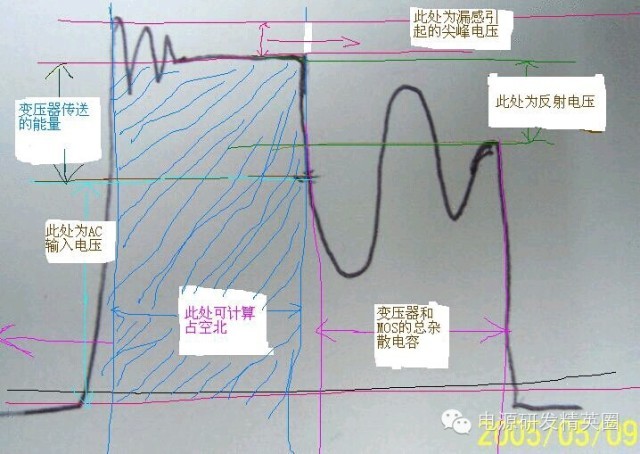 我看这样,我出一个简单的题,思考一下? ![]() 假设在一台数字示波器上只看到这一点波型,知道变压器电感量为1mH, 通过从示波器上测量和计算,得出下列数值(只讲解方法就行了) 1)大约的交流输入电压值 2)次级反到初级的电压 3)占空比 4)变压器漏感 5)变压器和MOS的总杂散电容 6)变压器传送的能量 明显反激,而且是断续模式 刚开始是漏感震荡,后来是电感和mosfet的电容震荡 前一个直流电压是Vin+(Np/Ns)(Vo+VF(二极管导通压降)) 后一个就是Vin 后一个震荡的周期可以算出Cds大小 高压时MOS的Cds很小,振荡的电容主体是变压器杂散电容.根据反射电压,反射电压持续时间,输入电压就可以计算导通时间,占空比也就出来了(伏特秒平衡),Vref*Tvref=Vin*Ton 4,5问如我上所说,只有一个大概的估算 参考大家的理解,谈谈我的看法: 当MOS管电压上升到A点时,输出整流管导通,初级励磁电感箝位于V1. 此时,漏感和杂散电容谐振, 由于变压器线圈存在直流和交流电阻,该振荡位阻尼振荡,消耗了漏感中的能量在B点时,励磁电感中电流下降为零,次级整流管自然截止,励磁电感上电压下降为零. 励磁电感和杂散电容谐振,MOS管的杂散电容Coss向励磁电感放电,Vds电压下降,可从波形中得到验证. 计算: 1.2.:如图所示,可以读出反射电压V1,和Vin(DC).则,交流输入电压约为Vin(DC)/sqrt(2),不带PFC. 3.由伏秒平衡可得,Vin(dc)*Ton=V1*T1,可求得,Ton.那么,占空比D=Ton/(Ton+T1+T2). 4.5:近似求解,从图中分别读出漏感、励磁电感同杂散电容谐振的频率,根据f=1/(2*pi*sqrt(L*c)),由励磁电感感量已知,为1mH,可求得杂散电容值.进一步就可求得漏感的感量.、 6.从波形中可以看出,此时该反激电路工作于断续模式,初级能量完全传送到次级. 根据Vin*Ton=Lp*Ip,其中,Lp为1mH,就可求得初级峰值电流Ip, 那么,该变压器在一个周期内传送的能量为:1/2*Lp*Ip^2. ![]() 其他波形: ![]() ![]() |