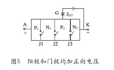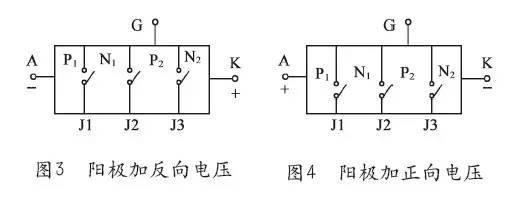 1 晶闸管(SCR) 晶体闸流管简称晶闸管,也称为可控硅整流元件(SCR),是由三个PN结构成的一种大功率半导体器件。在性能上,晶闸管不仅具有单向导电性,而且还具有比硅整流元件更为可贵的可控性,它只有导通和关断两种状态。 晶闸管的优点很多,例如:以小功率控制大功率,功率放大倍数高达几十万倍;反应极快,在微秒级内开通、关断;无触点运行,无火花、无噪声;效率高,成本低等。因此,特别是在大功率UPS供电系统中,晶闸管在整流电路、静态旁路开关、无触点输出开关等电路中得到广泛的应用。 晶闸管的弱点:静态及动态的过载能力较差,容易受干扰而误导通。 晶闸管从外形上分类主要有:螺栓形、平板形和平底形。 2 普通晶闸管的结构和工作原理 晶闸管是PNPN四层三端器件,共有三个PN结。分析原理时,可以把它看作是由一个PNP管和一个NPN管所组成,其等效图解如图1(a)所示,图1(b)为晶闸管的电路符号。 ![]() 2.1 晶闸管的工作过程 晶闸管是四层三端器件,它有J1、J2、J3三个PN结,可以把它中间的NP分成两部分,构成一个PNP型三极管和一个NPN型三极管的复合管。 当晶闸管承受正向阳极电压时,为使晶闸管导通,必须使承受反向电压的PN结J2失去阻挡作用。每个晶体管的集电极电流同时就是另一个晶体管的基极电流。因此是两个互相复合的晶体管电路,当有足够的门极电流Ig流入时,就会形成强烈的正反馈,造成两晶体管饱和导通。 设PNP管和NPN管的集电极电流分别为IC1和IC2,发射极电流相应为Ia和Ik,电流放大系数相应为α1=IC1/Ia和α2=IC2/Ik,设流过J2结的反相漏电流为ICO,晶闸管的阳极电流等于两管的集电极电流和漏电流的总和: ![]() 若门极电流为Ig,则晶闸管阴极电流为:Ik=Ia+Ig。 因此,可以得出晶闸管阳极电流为: ![]() 硅PNP管和硅NPN管相应的电流放大系数α1和α2随其发射极电流的改变而急剧变化。当晶闸管承受正向阳极电压,而门极未接受电压的情况下,式(1)中Ig=0,(α1+α2)很小,故晶闸管的阳极电流Ia≈ICO,晶闸管处于正向阻断状态;当晶闸管在正向门极电压下,从门极G流入电流Ig,由于足够大的Ig流经NPN管的发射结,从而提高放大系数α2,产生足够大的集电极电流IC2流过PNP管的发射结,并提高了PNP管的电流放大系数α1,产生更大的集电极电流IC1流经NPN管的发射结,这样强烈的正反馈过程迅速进行。 当α1和α2随发射极电流增加而使得(α1+α2)≈1时,式(1)中的分母1-(α1+α2)≈0,因此提高了晶闸管的阳极电流Ia。这时,流过晶闸管的电流完全由主回路的电压和回路电阻决定,晶闸管已处于正向导通状态。晶闸管导通后,式(1)中1-(α1+α2)≈0,即使此时门极电流Ig=0,晶闸管仍能保持原来的阳极电流Ia而继续导通,门极已失去作用。在晶闸管导通后,如果不断地减小电源电压或增大回路电阻,使阳极电流Ia减小到维持电流IH以下时,由于α1和α2迅速下降,晶闸管恢复到阻断状态。 2.2 晶闸管的工作条件 由于晶闸管只有导通和关断两种工作状态,所以它具有开关特性,这种特性需要一定的条件才能转化,此条件见表1。 (1)晶闸管承受反向阳极电压时,无论门极承受何种电压,晶闸管都处于关断状态。 (2)晶闸管承受正向阳极电压时,仅在门极承受正向电压的情况下晶闸管才导通。 (3)晶闸管在导通情况下,只要有一定的正向阳极电压,无论门极电压如何,晶闸管保持导通,即晶闸管导通后,门极失去作用。 (4)晶闸管在导通情况下,当主回路电压(或电流)减小到接近于零时,晶闸管关断。 3 晶闸管的伏安特性和主要参数 3.1 晶闸管的伏安特性 晶闸管阳极A与阴极K之间的电压与晶闸管阳极电流之间关系称为晶闸管伏安特性,如图2所示。正向特性位于第一象限,反向特性位于第三象限。 (1) 反向特性 当门极G开路,阳极加上反向电压时(见图3),J2结正偏,但J1、J2结反偏。此时只能流过很小的反向饱和电流,当电压进一步提高到J1结的雪崩击穿电压后,同时J3结也击穿,电流迅速增加,如图2的特性曲线OR段开始弯曲,弯曲处的电压URO称为“反向转折电压”。此后,晶闸管会发生永久性反向击穿。 (2) 正向特性 当门极G开路,阳极A加上正向电压时(见图4),J1、J3结正偏,但J2结反偏,这与普通PN结的反向特性相似,也只能流过很小电流,这叫正向阻断状态,当电压增加,如图2的特性曲线OA段开始弯曲,弯曲处的电压UBO称为“正向转折电压”。 ![]() 由于电压升高到J2结的雪崩击穿电压后,J2结发生雪崩倍增效应,在结区产生大量的电子和空穴,电子进入N1区,空穴进入P2区。进入N1区的电子与由P1区通过J1结注入N1区的空穴复合。同样,进入P2区的空穴与由N2区通过J3结注入P2区的电子复合,雪崩击穿后,进入N1区的电子与进入P2区的空穴各自不能全部复合掉。这样,在N1区就有电子积累,在P2区就有空穴积累,结果使P2区的电位升高,N1区的电位下降,J2结变成正偏,只要电流稍有增加,电压便迅速下降,出现所谓负阻特性,见图2中的虚线AB段。这时J1、J2、J3三个结均处于正偏,晶闸管便进入正向导电状态通态,此时,它的特性与普通的PN结正向特性相似,如图2的BC段。 ![]() (3) 触发导通 在门极G上加入正向电压时(如图5所示),因J3正偏,P2区的空穴进入N2区,N2区的电子进入P2区,形成触发电流IGT。在晶闸管的内部正反馈作用(如图2)的基础上,加上IGT的作用,使晶闸管提前导通,导致图2中的伏安特性OA段左移,IGT越大,特性左移越快。 ![]() 3.2 晶闸管的主要参数 (1)断态重复峰值电压UD
