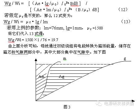 反激电源中各个型号的磁芯到底能做多大功率?有的人知道怎么算出来,有的人可以根据经验来选取,不会AP法求又没经验怎么办?福利来了,小编为你介绍几个大公司给出的磁性型号对应的频率可设计的功率范围列表!另外还有对于反激变压器问题的几点思考。 A、InternationalRectifier公司--56KHz 输出功率推荐磁芯型号 0---10W EFD15 SEF16 EF16 EPC17 EE19 EF(D)20 EPC25 EF(D)25 10-20W EE19 EPC19 EF(D)20 EE,EI22 EF(D)25 EPC25 20-30W EI25 EF(D)25 EPC25 EPC30 EF(D)30 ETD29 EER28(L) 30-50W EI28 EER28(L) ETD29 EF(D)30 EER35 50-70WEER28L ETD34 EER35 ETD39 70-100W ETD34 EER35 ETD39 EER40 E21 B、ELYTONE公司---100KHz 型号 输出功率(W) <5 5-10 10-20 20-50 50-100 100-200 200-500 500-1K EI EI12.5 EI16 EI19 EI25 EI40 EI50 EI60 -- EE EE13 EE16 EE19 EE25 EE40 EE42 EE55 EE65 <5 5-10 10-20 20-50 50-100 100-200 200-500 500-1K EF EF12.6 EF16 EF20 EF25 EF30 EF32 -- -- EFD -- EFD12 EFD15 EFD20 EFD25 EFD30 -- -- EPC -- EPC13 EPC17 EPC19 EPC25 EPC30 -- -- EER EER9.5 EER11 EER14.5 EER28 EER35 EER42 EER49 -- ETD -- -- ETD29 ETD34 ETD44 ETD49 ETD54 -- EP EP10 EP13 EP17 EP20 -- -- -- -- RM RM4 RM5 RM6 RM10 RM12 RM14 -- -- POT POT1107 POT1408 POT1811 POT2213 POT3019 POT3622 POT4229 -- PQ -- -- -- PQ2016 PQ2625 PQ3230 PQ3535 PQ4040 EC -- -- -- -- -- EC35 EC41 EC70 C、Fairchild Semiconductor公司--67KHz Output Power EIcore EE core EPC core EER core 0-10W EI12.5 EE8 EPC10 EI16 EE10 EPC13 EI19 EE13 EPC17 EE16 10-20W EI22 EE19 EPC19 20-30W EI25 EE22 EPC25 EER25.5 30-50W EI28 EE25 EPC30 EER28 EI30 50-70W EI35 EE30 EER28L 70-100W EI40 EE35 EER35 100-150W EI50 EE40 EER40 EER42 150-200W EI60 EE50 EER49 EE60 The core quickselection table For universal input range, fs=67kHz and 12Vsingleoutput Transformer Design Consideration for off-lineFlybackTMConverters usingFairchild Power Switch (FPS) D、单端反激式变压器磁芯的选择公式 Ve =5555 * P / f 式中:Ve为磁芯的体积:Ve=Ae*Le;单位为:毫米立方; P为输入功率;单位为:瓦; f为开关频率;单位为:千赫兹; 本公式假设:Bm=0.3T, Lg/Le=0.5%=气隙长度/磁芯等效长度; 如果Lg/Le=气隙长度/磁芯等效长度=1%时,又如何计算呢?(请考虑) 输出功率、磁芯截面积和开关频率决定气隙,因为在反激式开关电源中气隙的体积大小决定储能的多少,频率决定能量传输的快慢; 如:EI25Ve=2050mm3,Ae=42平方毫米,Le=49.4mm;f=40KHz;η=0.75; Lg= 0.005*49.4 = 0.247mm---气隙长度 Pin =Ve*F/5555 = 2050*40/5555 =14.76W; Pout =η*Pin= 0.75 * 14.76 = 11.07W; 若:f=100KHz 则: Pout= 11.07W *(100/40) = 27.675W; 反激式开关电源设计的思考一 对一般变压器而言,原边绕组的电流由两部分组成,一部分是负载电流分量,它的大小与副边负载有关;当副边电流加大时,原边负载电流分量也增加,以抵消副边电流的作用。另一部分是励磁电流分量,主要产生主磁通,在空载运行和负载运行时,该励磁分量均不变化。 励磁电流分量就如同抽水泵中必须保持有适量的水一样,若抽水泵中无水,它就无法产生真空效应,大气压就无法将水压上来,水泵就无法正常工作;只有给水泵中加适量的水,让水泵排空,才可正常抽水。在整个抽水过程中,水泵中保持的水量又是不变的。这就是,励磁电流在变压器中必须存在,并且在整个工作过程中保持恒定。 正激式变压器和上述基本一样,初级绕组的电流也由励磁电流和负载电流两部分组成;在初级绕组有电流的同时,次级绕组也有电流,初级负载电流分量去平衡次级电流,激励电流分量会使磁芯沿磁滞回线移动。而初次级负载安匝数相互抵消,它们不会使磁芯沿磁滞回线来回移动,而励磁电流占初级总电流很小一部分,一般不大于总电流10%,因此不会造成磁芯饱和。 反激式变换器和以上所述大不相同,反激式变换器工作过程分两步: 第一:开关管导通,母线通过初级绕组将电能转换为磁能存储起来; 第二:开关管关断,存储的磁能通过次级绕组给电容充电,同时给负载供电。 可见,反激式变换器开关管导通时,次级绕组均没构成回路,整个变压器如同仅有一个初级绕组的带磁芯的电感器一样,此时仅有初级电流,转换器没有次级安匝数去抵消它。初级的全部电流用于磁芯沿磁滞回线移动,实现电能向磁能的转换;这种情况极易使磁芯饱和。 磁芯饱和时,很短的时间内极易使开关管损坏。因为当磁芯饱和时,磁感应强度基本不变,dB/dt近似为零,根据电磁感应定律,将不会产生自感电动势去抵消母线电压,初级绕组线圈的电阻很小,这样母线电压将几乎全部加在开关管上,开关管会瞬时损坏。 由上边分析可知,反激式开关电源的设计,在保证输出功率的前提下,首要解决的是磁芯饱和问题。如何解决磁芯饱和问题?磁场能量存于何处?将在下一篇文章:反激式开关电源变压器设计的思考二中讨论。 反激式开关电源设计的思考二---气隙的作用 “反激式开关电源设计的思考一”文中,分析了反激式变换器的特殊性防止磁芯和的重要性,那么如何防止磁芯的饱和呢?大家知道增加气隙可在相同ΔB的情况下,ΔIW的变化范围扩大许多,为什么气隙有此作用呢?由全电流定律可知: 由上例可知,同一个磁芯在电流不变的条件下,仅增加 图1表示一个磁芯长为lm,气隙长为lg,截面积为Ae的磁芯,在其上绕N匝线圈,当输入电压为Ui时,输入功率为Wi:![]() 6式右边的积分为图2中阴影部分面积A,即就是说: 磁场能量的大小等于磁化曲线b和纵轴所围成的面积大小。图1中,假定磁路各部分的面积相等,磁芯各部分的磁场强度为Hm,气隙部分的磁场强度为Hg,由全电流定律得: ![]() 11式右边第一项是磁芯中的磁场能量,第