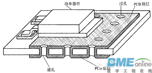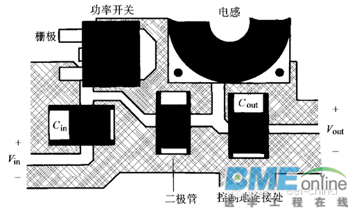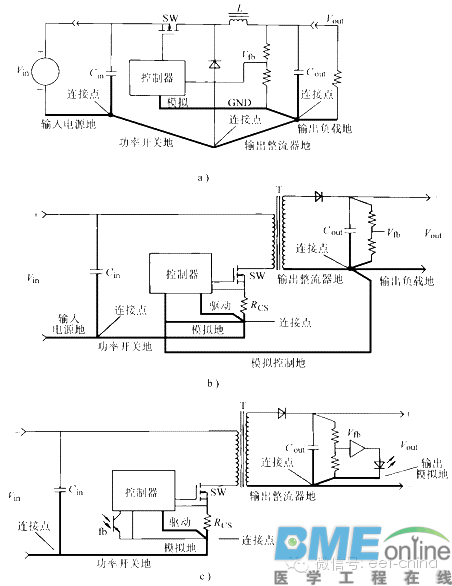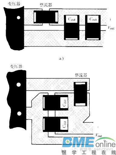 印制电路板的制作 所有开关电源设计的最后一步就是印制电路板(PCB)的线路设计。如果这部分设计不当,PCB也会使电源工作不稳定,发射出过量的电磁干扰(EMI)。设计者的作用就是在理解电路工作过程的基础上,保证PCB设计合理。 开关电源中,有些信号包含丰富的高频分量,因而任何一条PCB引线都可能成为天线。引线的长和宽影响它的电阻和电感量,进而关系到它们的频率响应。即使是传送直流信号的引线,也会从邻近的引线上引入RF(射频)信号,使电路发生故障,或者把这干扰信号再次辐射出去。所有传送交流信号的引线要尽可能短且宽。这意味着任何与多条功率线相连的功率器件要尽可能紧挨在一起,以减短连线长度。引线的长度直接与它的电感量和电阻量成比例,它的宽度则与电感量和电阻量成反比。引线长度就决定了其响应信号的波长,引线越长,它能接收和传送的干扰信号频率就越低,它所接收到的RF(射频)能量也越大。主要电流环路每一个开关电源内部都有四个电流环路,每个环路要与其他环路分开。由于它们对PCB布局的重要性,下面把它们列出来:1.功率开关管交流电流环路。2.输出整流器交流电流环路。3.输入电源电流环路。4.输出负载电流环路。图1 a、b、c画出了三种主要开关电源拓扑的环路。 通常输入电源和负载电流环路并没有什么问题。这两个环路上主要是在直流电流上叠加了一些小的交流电流分量。它们一般有专门的滤波器来阻止交流噪声进入周围的电路。输入和输出电流环路连接的位置只能是相应的输入 输出电容的接线端。输入环路通过近似直流的电流对输入电容充电,但它无法提供开关电源所需的脉冲电流。输入电容主要是起到高频能量存储器的作用。类似地,输出滤波电容存储来自输出整流器的高频能量,使输出负载环能以直流方式汲取能量。因此,输入和输出滤波电容接线端的放置很重要。如果输入或输出环与功率开关或整流环的连接没有直接接到电容的两端,交流能量就会从输入或输出滤波电容上流进流出,并通过输入和输出电流环“逃逸”到外面环境中。功率开关和整流器的交流电流环路包含非常高的PWM开关电源典型的梯形电流波形。这些波形含有延展到远高于基本开关频率的谐波。这些交流电流的峰值有可能是连续输入或输出直流电流的2~5倍。典型的转换时间大约是50ns,因而这两个环路最有可能产生电磁干扰(EMI)。在电源PCB制作中,这些交流电流环路的布线要在其他引线之前布好。每个环路由三个主要器件组成:滤波电容、功率开关管或整流器、电感或变压器。它们的放置要尽可能靠近。这些器件的方向也要确定好,以使它们之间的电流通路尽可能短。图60就是关于Buck(或降压)变换器功率部分布局的一个很好的例子。 图2 这些电流环路的布线,对变换器效率测量也会产生影响。如果这些引线上的电压降比较大,变换器效率就显得比较低,这是因为它工作时的电压降低了(因而电流要增大)。但是,如果用数字电压表(DVM)或仪器来测量效率,输入电压端上测得的值比它实际的大,从而得出一个错误的比较大的Ⅵ乘积结果。 开关电源内部的接地电源地代表的是上面介绍的电流环路底下的支路。电源地作为电路的共同电位参考点,在电路中起着非常重要的作用,因而在布置PCB的时候,电源地的安排要十分小心。把这些地混淆的话,会引起电源工作不稳定。另外,要考虑的一个地是连接控制集成电路和与之相关的无源器件的地,即控制地。这个地非常敏感,因而要在其他的交流电流环路都布置好后再放置。控制地与其他地要通过一些特定的点连接,总的来说,这个连接点是产生控制IC所要检测的小电压的所有器件的公共连接点。它包括电流型变换器电流检测电阻的公共接点和输出端电阻分压器的下端。这样的目的是减小检测部分与电压误差或电流放大器敏感的输入端之间的连接而引入的噪声。如果控制地接到其他位置,主电路那些环路产生的噪声会加到控制信号上,影响控制IC的正常工作。 主要变换拓扑的地线安排见图3。 每条大电流的地线要短而宽。作为一般的规则,除控制地外,输入滤波电容的公共端应作为其他交流电流地的唯一接点。交流电压节点每个开关电源中都有一个交流电压最大的节点,这个节点就是功率开关漏极(或集电极)。无隔离DC-DC变换器中,这个节点与电感和续流二极管相连。变压器隔离拓扑中,变压器有多少个绕组,就有多少个交流节点。但从电气上看,它们代表同一个节点,只是经变压器映射成这么多节点。对每一个交流节点都要单独进行仔细考虑。交流节点会引起特有的问题,交流电压在发射EMI的同时,很容易通过电容方式耦合到不同层上邻近的引线上。更为不利的是,这部分引线要作为功率开关管和整流器的散热部分,特别是在表面贴装的电源中。从电气上考虑,要求这些引线越窄越好,但从热方面考虑,要越宽越好。表面贴片设计中,比较好的折中方法是:让PCB顶层和底层一样,将它们通过一些过孔(或通孔)连接,见图62。 图4这种方法可以使散热体积和表面面积增大两倍多,并大大减小与其他引线之间的容性耦合。使用过孔时,其他的信号和地要与这些高压引线和它的散热部分隔开。离线式变换器中,大地的地会通过散热器(用绝缘体与漏极隔开)从这些节点获取能量,并通过交流电源插头从产品