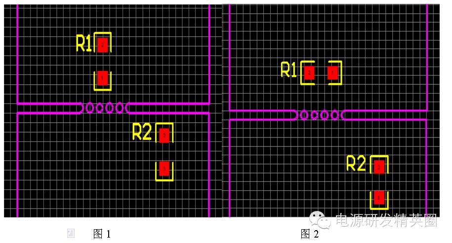 图2为上等位置设计(注意到这个细节的工程师不是很多) 当然电阻的焊盘设计也是很重要的,对于使用波峰焊接的(焊接面主要在电极边缘和线路板接头的地方),一般使用标准库就成,对应使用焊膏回流焊接的焊盘(回流焊接面主要位于电阻电极的下方)比标准的要小20%-30%左右,毕竟焊锡也是要钱的啊。 对于电源设计来说,一般电阻不建议使用超过1M的电阻,电路板上的污染,温度及湿度等会造成电阻阻值的明显变化,同样不建议使用尺寸小于0603的电阻。 |