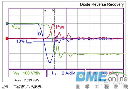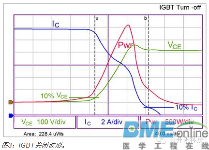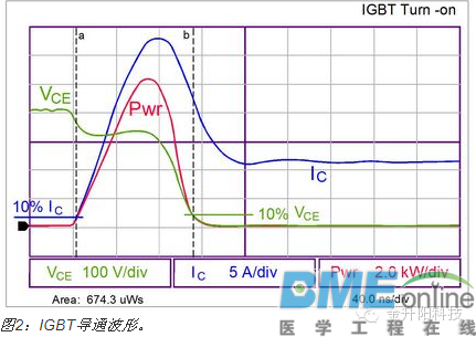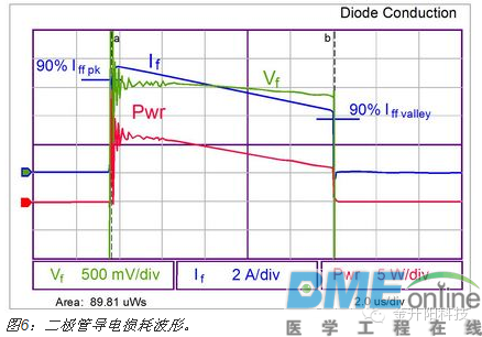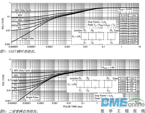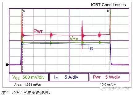 大多数半导体组件结温的计算过程很多人都知道。通常情况下,外壳或接脚温度已知。量测裸片的功率耗散,并乘以裸片至封装的热阻(用theta或θ表示),以计算外壳至结点的温升。这种方法适用于所有单裸片封装,包括双极结晶体管(BJT)、MOSFET、二极管及晶闸管。但对多裸片绝缘栅双极晶体管(IGBT)而言,这种方法被证实不足以胜任。 某些IGBT是单裸片组件,要么结合单片二极管作,要么不结合二极管;然而,大多数IGBT结合了联合封装的二极管。大多数制造商提供单个θ值,用于计算结点至外壳热阻抗。这是一种简化的裸片温度计算方法,会导致涉及到的两个结点温度分析不正确。对于多裸片组件而言,θ值通常不同,两个裸片的功率耗散也不同,各自要求单独计算。此外,每个裸片互相提供热能,故必须顾及到这种交互影响。 本文将阐释怎样量测两个组件的功率耗散,使用IGBT及二极管的θ值计算平均结温及峰值结温。 ![]() 功率计算 电压与电流波形必须相乘然后作积分运算以量测功率。虽然电压和电流简单相乘就可以给出瞬时功率,但无法使用这种方法简单地推导出平均功率,故使用了积分来将它转换为能量。然后,使用不同损耗的能量之和以计算波形的平均功率。 在开始计算之前定义导通、导电及关闭损耗的边界很重要,因为如果波形的某些区域遗漏了或者是某些区域被重复了,它们可能会给量测结果带来误差。本文的分析中将使用10%这个点;然而,由于这是一种常见方法,也可以使用其他点,如5%或20%,只要它们适用于损耗的全部成分。 正常情况下截取的是正在形成的正弦波的峰值波形。这就是峰值功率耗散。平均功率是峰值的50%(平均电压是峰值电压除以√2,平均电流是峰值电流除以√2)。 一般而言,在电压波形的峰值,IGBT将导电,而二极管不导电。为了量测二极管损耗,要求像电机这样的无功负载,且需要捕获电流处于无功状态(如被馈送回电源)时的波形。 ![]() 导通时,应当量测起于IC电平10%终于10% VCE点的损耗。这些电平等级相当标准,虽然这样说也有些主观性。如果需要的话,也可以使用其他点。无论选择何种电平来量测不同间隔,重要的是保持一致,使从不同 组件获取的数据能够根据相同的条件来比较。功率根据示波器波形来计算。由于它并非恒定不变,且要求平均功率,就必须计算电源波形的积分,如波形迹线的底部 所示,本案例中为674.3 μW(或焦耳)。 ![]() 与之类似,关闭损耗的量测如下图所示。 ![]() 导电损耗的量测方式类似。它们应当起于导通损耗终点,终于关闭损耗起点。这可能难于精确量测,因为导电损耗的时间刻度远大于开关损耗。 ![]() 必须获取在开关周期的部分时段(此时电流为无功模式使二极管导电)时的二极管导通损耗资料。通常量测峰值、负及反向导电电流10%点的资料。 ![]() 二极管导电损耗是计算IGBT封装总损耗所要求的最后一个损耗成分。当计算出所有损耗之后,它们需要应用于以工作模式时长为基础的总体波形。当增加并顾及到这些能量之后,它们可以一起相加,并乘以开关频率,以获得二极管及IGBT功率损耗。 裸片温度计算 为了精确计算封装中 两个裸片的温度,重要的是计算两个裸片之间的自身发热导致的热相互影响。这要求3个常数:IGBT的θ值、IGBT的θ值,以及裸片交互影响ψ(Psi)。某些制造商会公布封装的单个θ值,其中裸片温度仅为估计值,实际上精度可能差异极大。 稳态θ值如图7及图8中的图表所示。IGBT的θ值为0.470 °C/W,二极管为1.06 °C/W。计算中还要求另一项热系数,即两个裸片之间的热交互影响常数ψ。测试显示对于TO-247、TO-220及类似封装而言,此常数约为0.15 °C/W,下面的示例中将使用此常数。 ![]() IGBT裸片温度 IGBT的裸片温度可以根据下述等式来计算: ![]() 假定下列条件: TC= 82°C RΘJC-IGBT= 0.470 °C/W PD-IGBT= 65 W PD-DIODE= 35 W Psi交互影响= 0.15°C/W IGBT的裸片温度就是: ![]() 二极管裸片温度 RΘJC-diode= 1.06°C/W ![]() 类似的是,二极管裸片温度为: ![]() 峰值裸片温度 上述分析中计算的温度针对的是平均裸片温度。此温度在开关周期内不断变化,而峰值裸片温度可以使用图7和图8中的热瞬时曲线来计算。为了计算,有必要从曲线 中读取瞬时信息。如果交流电频率为60 Hz,半个周期就是时长就是8.3 ms。因此,使用8.3 ms时长内的50%占空比曲线,就可以计算Psi值: IGBT 0.36 °C/W 二极管 0.70 °C/W ![]() IGBT裸片的峰值温度就会是: ![]() 二极管裸片峰值温度就是: ![]() 结论 评估多裸片封装内的半导体裸片温度,在单裸片组件适用技术基础上,要求更多的分析技术。有必要获得两个裸片提供的直流及瞬时热信息,以计算裸片温度。还有必要量测两个组件的功率耗散,分析完整半正弦波范围抽的损耗。此分析将增强用户信心,即系统中的半导体组件将以安全可靠的温度工作,提供最优的系统性能。