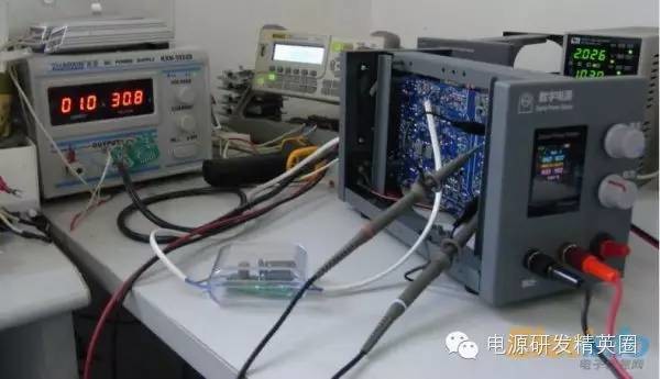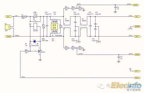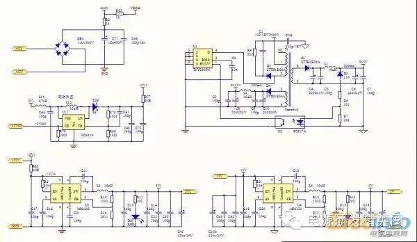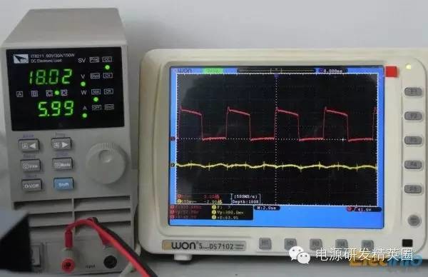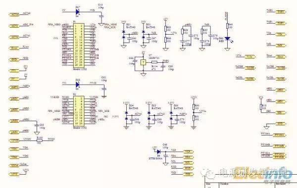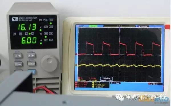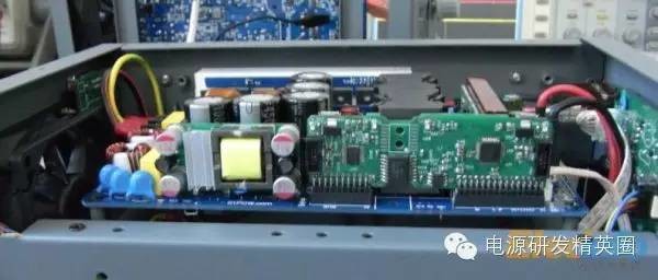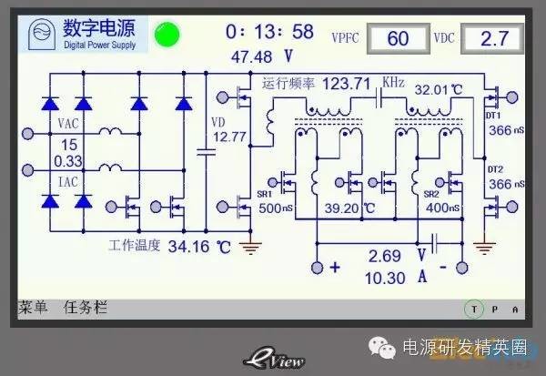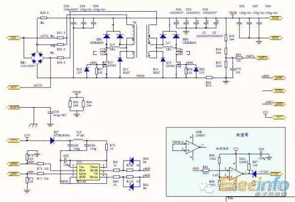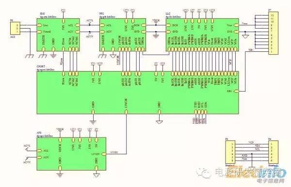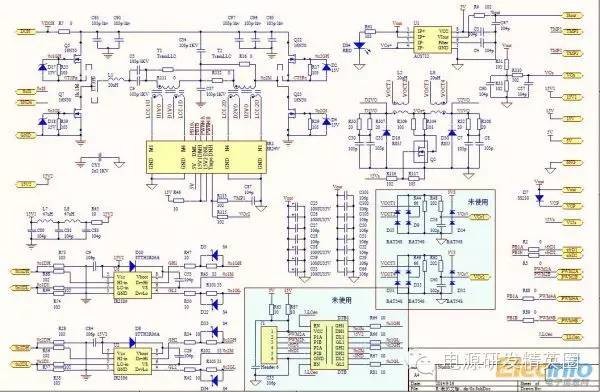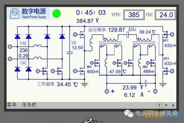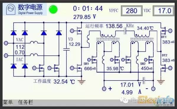 拓扑结构: 1.ACDC部分采用整流桥与双路PFC升压回路并联,PFC停止时,交流电通过整流桥转为直流电,PFC工作时升压回路在交流正负半周分别工作,整流桥下半部分参与,上半部反偏截止。称作无桥PFC,或半桥PFC。 2.DCDC部分采用全桥LLC拓扑,控制算法实现移相和LLC两种工作模式。负载从0到一个临界值之间工作在移相全桥模式,境界值到满载之间工作在LLC模式。全桥LLC拓扑在大部分负载条件下实现零电压转换(ZVS),只在空载和轻载谐振能量不足时,不能实现ZVS。两种模式结合克服了LLC空载电压漂高,移相全桥满载丢失周期的弊病,发挥了各自的优点。 3. 输出整流部分采用双变压器,四路同步整流结构。方便改善散热和布局。 ![]() 整机布局:外形:长190*宽105*高40mm。 ![]() 机箱外形: ![]() ![]() PFC波形:红色交流正半周,黄色负半周,Vgs,频率155KHz电压5V/格;时基2uS/格。 ![]() DCDC波形: 1. 左桥臂: 红色:上管Vgs;100V/格;时基2uS/格。 黄色:下管Vgs;5V/格;时基2uS/格。 ![]() 2. 右桥臂: 红色:上管Vgs;100V/格;时基2uS/格。 黄色:下管Vgs;5V/格;时基2uS/格。 ![]() 同步整流与纹波:红色同步整流Vds;20V/格;时基2uS/格。 黄色输出纹波:Vpp:220mV;500mV/格;时基2uS/格。 ![]() 全桥移相模式:频率:166KHz ![]() LLC模式:频率:133KHZ左右 ![]() 触摸屏显示主要参数:电源供电:隔离110V/200VA ![]() 这是低压测试的图片。电源测试直接上高压好怕怕,先来个低压的, ![]() 直流30V输入到电源中,FPC设定到60V,输出2~5V ![]() 2.7V/10.3A输出时PFC电压从60V降到47V,顶不住了,室温28度,电源温度34度,同步整流39度 ![]() 电子负载显示2.026V/10.30A,线损2.69-2.026V。 ![]() 电源侧面图:左边待机电源,右边控制板,主控TI的F28027,高压侧ST的F030,中间的是数字隔离 ![]() 3.7V/6A是波形,CH1红色底边可以看到同步整流的凸台,高压时见不到 ![]() 组件垂直安装在主板上 ![]() 总图 ![]() EMI图,交流两相分别采样,DSP合成完整波形 ![]() 触摸屏校准页面,交流输入电流IAC不准,220V准了,110V又不准。 原理图继续贴: PFC部分 ![]() 这是工程图。 整流桥边几个电阻时0ohm跳线,可以组合有桥,无桥,双相交错TOP FBLLC部分 ![]() 待机电源 ![]() 原边AC220V -> 15V -> 5V 付边AC220V -> 隔离15V -> 5V DSP接口 ![]() 以上是电源板全部原理图 电源正在运行中,晒晒监控画面 ![]() 运行状态数据全在图中,电源运行45分钟,最高温度在同步整流板,47度,还要加大散热片,室内温度28度电子负载只有160W,输出功率没调太大。 本文转自:电源网,不代表“”观点