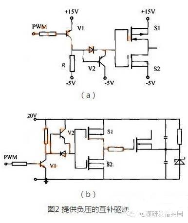 功率器件MOSFET是目前应用频率最高的电子元件之一,也是很多电子工程师在入门学习时的重点方向。如果设计得当,MOSFET驱动电路可以帮助工程师快速、高效、节能的完成电路系统的驱动设计,本文在这里将会分享一种比较常见的MOSFET驱动电路设计方案,该方案尤其适用于小功率电路系统的采用。下图中,图1(a)所展示的是一种目前业内比较常用的小功率MOSFET驱动电路,这一电路系统的特点是简单可靠,且设计成本比较低,尤其适用于不要求隔离的小功率开关设备。图1(b)所示驱动电路开关速度很快,驱动能力强,为防止两个MOSFET管直通,通常串接一个0.5一1Ω小电阻用于限流,该电路适用于不要求隔离的中功率开关设备。这两种电路结构都非常简单,比较适合新人工程师的采用和学习。 在电路系统的应用过程中,由于功率MOSFET属于一种电压型控制器件,因此只要其本身的栅极和源极之间施加的电压超过其阂值电压,则电路就会导通。由于MOsFET存在结电容,关断时其漏源两端电压的突然上升将会通过结电容在栅源两端产生干扰电压。而目前常用的互补驱动电路的关断回路阻抗小,关断速度较快,但它不能提供负压,故其抗干扰性较差。因此,为了提高电路的抗干扰性,可在此种驱动电路的基础上增加一级由v1、v2、R组成的电路,产生一个负压,其电路原理图如图2(a)所示。