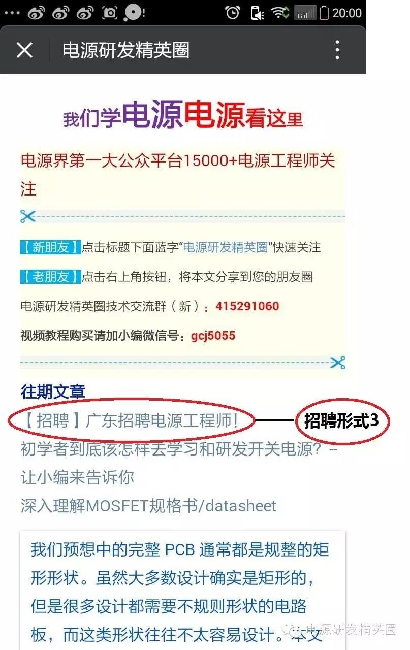 往期文章 【招聘】最新招聘信息! 跳槽季来了很多电源企业也求贤若渴。 电源企业如何快速招到电源工程师? 快请入驻《》吧,本平台来帮你招兵买马: 《》 开关电源行业第一自媒体,微信平台粉丝18000+人员!![]() 怎么入驻“”?如下: 会员制 首批:200元/终身会员(2016.03.01前入驻为首批) 第二批:260元/终身会员(2016.04.01前入驻为第二批) 会员优势1:可给会员企业免费发布三个月招聘信息,每周可更新职位统一晚上发布! 会员优势2:可享受平台后期的其他优惠政策(待叙) 注1:一个会员只针对一家企业或机构 注2 :必须是与开关电源相关的企业 招聘形式1:(如下图) 公众号直接发布招聘信息 ![]() 招聘形式2:(如下图) 公众号菜单发布招聘信息 ![]() 招聘形式3:(如下图) 招聘信息插入每天的往期文章 ![]() 入驻请联系并注明来意(如下): 微信号:gcj5055 手机号1:13397322620 手机号2:15367940710 qq号1:2500497218 qq号1:332006635