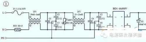图1 注:不管有没有强制要求,不管PCB板进出线是端子连接还是导线连接,请给L、N、PE等端口做好清晰、正确的丝印。 先从输入电路①开始,从头至尾来讲一下。 输入滤波电路也很难进行精确计算。某些看起来并不太科学(或者并不流行)的设计思路,很多时候往往会非常有用。 图2 F1:保险管的寿命受输入浪涌电压和浪涌电流的双重影响,应该尽可能采用慢恢复型保险管,一般是按照最大输入电流的两至三倍选取。AC输入时,浪涌电压的影响可能要严重些。电池输入(低压),如果输入端抑制不足,浪涌电流对保险管的影响可能要严重些。AC输入时,在工业场合,浪涌电压也远比民用场合严重,这时防雷器件(参数及结构配置)的设计对保险管的影响尤其突出,必要时还要采用双(三)保险。相关设计过程可以参考专门针对防雷电路、浪涌电流抑制电路的设计文献。单保险管要接在L线上,且玻璃管引线封装最好增加一层热缩套管,并且在PCB板上标明容量。 RT1:热敏电阻的主要作用是抑制输入浪涌电流,RT1过大,发热严重。RT1过小,可能会影响到保险管和输入电解电容的寿命。输入冲击电流一般是硬性指标,选择RT1时一定要仔细的核实最大冲击电流限制值,如果没有给出这项要求,可以参考同等功率级别的其他类型产品。在全密封条件下,RT的发热可能会非常严重。另外,如果产品要求低温启动测试,RT阻值会变得相当大,很可能导致产品无法正常起机。 X电容:60W的产品,采用0.47uF的X电容,比较保险。换句话说,30W的产品,应该采用0.22uFX电容,120W的产品采用1uF的X电容。尽管这种方法没有什么科学依据,但是确实屡试不爽。如果喜欢比较有挑战性的工作,那就另当别论了。X电容与Y电容不同,X电容容量大一点也不会让其他地方变得更加恶劣。在成本不是主要因素的情况下,对自己好一点,多留条活路。另外,在图2中,绝大部分人并不认可C4作用,此处存在了很大争议性。 Y电容:Y电容的配置有两个的,也有四个的;有102的,也有222、472的,有串磁珠的,也有串电阻的,只要EMI都能过,只要泄露电流没超就都OK.总之五花八门,千奇百怪。这也反映出人们内心对于Y电容充满深深的恐惧。其实Y电容并没有错,性能也较为优良,罪魁祸首都在于磁性材料(共模电感、变压器)及接地方式,后续分析。 MOV1:压敏电阻的计算方式并没有统一标准,一旦对实际情况估算错误(击穿电压偏低),反而会对产品造成严重的危害。在防雷要求不高的民用产品中,一般采用14K471居多,工业场合一般都在500V以上,如14K511,14K561等等。如果你不了解产品的真实用电环境(非居民小区用电),要尽量避免使用500V以下的压敏电阻。不同的行业,采取的防雷措施不尽相同,这一点一定要认真仔细的研究,特别是与多个保险管的配置方面。另外,配置防雷管后,耐压测试时往往会出现误动作,这也是让人头痛的问题。MOV1需要增加热缩套管。 DB1:小功率产品,选型比较简单。从散热的角度考虑,宽范围60W产品,整流器的最低规格不应该低于2A.在成本不苛刻的条件下,一般采用4A即可。 对于某些特殊场合,如存在瞬态高浪涌电压,整流器的规格应该进一步增大。有种情况很少见(但确实有存在),有部分工程师选择输入电解电容时,会选择超大的容量(可能是量不大,又是自家用),而浪涌抑制(热敏)电阻的规格却特别小。这时候强大的冲击电流会对保险管和整流器形成致命的威胁。专业的电源制造公司不会出现这种情况,而非专业制造商,在开发系统配套产品时,由于开发人员经验不足,又缺乏严谨的测试规范,而忽略这些潜在的隐患。 共模电感:上面分别给出了三种配置: 方案①,这种配置比较多。我们经常看到的情况是:前级一个¢8~¢16的小磁环(30~1000uH),后级采用一个¢20~¢25的大磁环(15~30mH),前级作用在高频,后级低频,高低搭配刚好合适。 方案②,这种情况也较为常见,前后两个一模一样的共模线圈,非常美观。采用这种配置时,为了保证较好的滤波效果(降低分布电容),每一级的电感量(匝数)不能太高。这样不仅会降低共模电感的分布电容,绕制工艺也会相对简单,而且美观,就是成本较高。 方案③,一般对EMI要求较低的产品较多使用,低成本EE型共模电感最为常见。部分对成本要求苛刻的产品中,不少人也会采用单个¢18~25左右的磁环来设计,这需要开发人员具备足够的经验及技巧。共模电感的材质、形状、绕制工艺对滤波效果影响较大,而且EMI滤波元件配置与整机结构也有很大的关系。很多人不知道如何去计算共模电感值,下面是一种参考方法(适用于中小功率)。 100KHZ30mH 1.0MHZ3.0mH 10MHZ300uH 100MHZ30uH 5.0MHZ600uH 30MHZ100uH 在传导测试时,3*F、1MHZ、5MHZ、20~30MHZ这四个点容易出问题。 注: 1、这种方法,只具有规律性,而没有科学性; 2、共模电感的材质、形状、绕制工艺对其滤波效果影响非常大; 3、共模电感不会饱和(对称绕制),但会产生较高的浪涌电压; 4、共模磁环,最好只绕两层,在磁环绕制工艺方面建议多下点功夫; 5、共模滤波的设计原则是如何让其更有效; 压敏电阻的计算需要考虑到输入阻抗(热敏电阻、差模电感、共模电感)、保险管容量、CIN大小等等多种因素。(特别是很多产品的保险管并不是单纯的熔丝,而且压敏电阻也并不一定是刚好在FUSE之后。而且L-N与L、N-PE测试时,需要分别考虑其影响。) EMC中的四级只是一个测试标准,没办法去量化计算,符不符合要求,应该取决