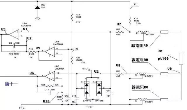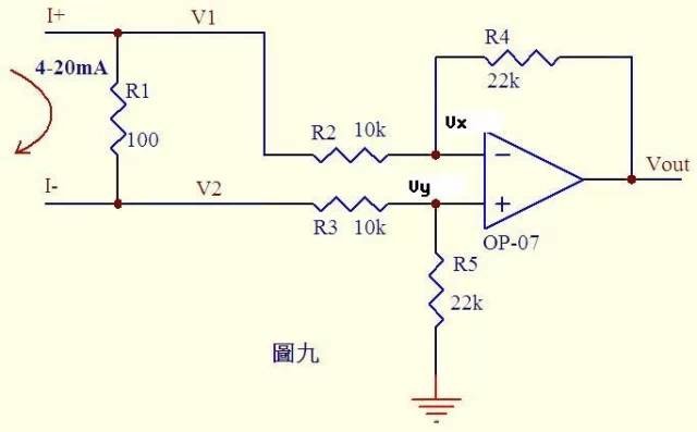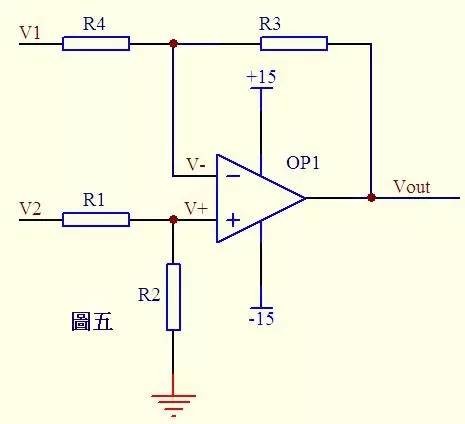 图3图三中,由虚短知:V-=V+=0……a由虚断及基尔霍夫定律知,通过R2与R1的电流之和等于通过R3的电流,故(V1–V-)/R1+(V2–V-)/R2=(V-–Vout)/R3……b代入a式,b式变为V1/R1+V2/R2=Vout/R3如果取R1=R2=R3,则上式变为-Vout=V1+V2,这就是传说中的加法器了。4)加法器2: 图4请看图四。因为虚断,运放同向端没有电流流过,则流过R1和R2的电流相等,同理流过R4和R3的电流也相等。故(V1–V+)/R1=(V+-V2)/R2……a(Vout–V-)/R3=V-/R4……b由虚短知:V+=V-……c如果R1=R2,R3=R4,则由以上式子可以推导出V+=(V1+V2)/2V-=Vout/2故Vout=V1+V2也是一个加法器,呵呵!5)减法器 图5图五由虚断知,通过R1的电流等于通过R2的电流,同理通过R4的电流等于R3的电流,故有(V2–V+)/R1=V+/R2……a(V1–V-)/R4=(V--Vout)/R3……b如果R1=R2,则V+=V2/2……c如果R3=R4,则V-=(Vout+V1)/2……d由虚短知V+=V-……e所以Vout=V2-V1这就是传说中的减法器了。6)积分电路: 图6图六电路中,由虚短知,反向输入端的电压与同向端相等,由虚断知,通过R1的电流与通过C1的电流相等。通过R1的电流i=V1/R1通过C1的电流i=C*dUc/dt=-C*dVout/dt所以Vout=((-1/(R1*C1))∫V1dt输出电压与输入电压对时间的积分成正比,这就是传说中的积分电路了。若V1为恒定电压U,则上式变换为Vout=-U*t/(R1*C1)t是时间,则Vout输出电压是一条从0至负电源电压按时间变化的直线。7)微分电路: 图7图七中由虚断知,通过电容C1和电阻R2的电流是相等的,由虚短知,运放同向端与反向端电压是相等的。则:Vout=-i*R2=-(R2*C1)dV1/dt这是一个微分电路。如果V1是一个突然加入的直流电压,则输出Vout对应一个方向与V1相反的脉冲。8)差分放大电路 图8由虚短知Vx=V1……aVy=V2……b由虚断知,运放输入端没有电流流过,则R1、R2、R3可视为串联,通过每一个电阻的电流是相同的,电流I=(Vx-Vy)/R2……c则:Vo1-Vo2=I*(R1+R2+R3)=(Vx-Vy)(R1+R2+R3)/R2……d由虚断知,流过R6与流过R7的电流相等,若R6=R7,则Vw=Vo2/2……e同理若R4=R5,则Vout–Vu=Vu–Vo1,故Vu=(Vout+Vo1)/2……f由虚短知,Vu=Vw……g由efg得Vout=Vo2–Vo1……h由dh得Vout=(Vy–Vx)(R1+R2+R3)/R2上式中(R1+R2+R3)/R2是定值,此值确定了差值(Vy–Vx)的放大倍数。这个电路就是传说中的差分放大电路了。9)电流检测: 图9分析一个大家接触得较多的电路。很多控制器接受来自各种检测仪表的0~20mA或4~20mA电流,电路将此电流转换成电压后再送ADC转换成数字信号,图九就是这样一个典型电路。如图4~20mA电流流过采样100Ω电阻R1,在R1上会产生0.4~2V的电压差。由虚断知,运放输入端没有电流流过,则流过R3和R5的电流相等,流过R2和R4的电流相等。故:(V2-Vy)/R3=Vy/R5……a(V1-Vx)/R2=(Vx-Vout)/R4……b由虚短知:Vx=Vy……c电流从0~20mA变化,则V1=V2+(0.4~2)……d由cd式代入b式得(V2+(0.4~2)-Vy)/R2=(Vy-Vout)/R4……e如果R3=R2,R4=R5,则由e-a得Vout=-(0.4~2)R4/R2……f图九中R4/R2=22k/10k=2.2,则f式Vout=-(0.88~4.4)V,即是说,将4~20mA电流转换成了-0.88~-4.4V电压,此电压可以送ADC去处理。注:若将图九电流反接既得Vout=+(0.88~4.4)V,10)电压电流转换检测: 图10电流可以转换成电压,电压也可以转换成电流。图十就是这样一个电路。上图的负反馈没有通过电阻直接反馈,而是串联了三极管Q1的发射结,大家可不要以为是一个比较器就是了。只要是放大电路,虚短虚断的规律仍然是符合的!由虚断知,运放输入端没有电流流过,则(Vi–V1)/R2=(V1–V4)/R6……a同理(V3–V2)/R5=V2/R4……b由虚短知V1=V2……c如果R2=R6,R4=R5,则由abc式得V3-V4=Vi上式说明R7两端的电压和输入电压Vi相等,则通过R7的电流I=Vi/R7,如果负载RL<<100KΩ,则通过Rl和通过R7的电流基本相同。11)传感器检测: 图11来一个复杂的,呵呵!图十一是一个三线制PT100前置放大电路。PT100传感器引出三根材质、线径、长度完全相同的线,接法如图所示。有2V的电压加在由R14、R20、R15、Z1、PT100及其线电阻组成的桥电路上。Z1、Z2、Z3、D11、D12、D83及各电容在电路中起滤波和保护作用,静态分析时可不予理会,Z1、Z2、Z3可视为短路,D11、D12、D83及各电容可视为开路。由电阻分压知,V3=2*R20/(R14+20)=200/1100=2/11……a由虚短知,U8B第6、7脚电压和第5脚电压相等V4=V3……b由虚断知,U8A第2脚没有电流流过,则流过R18和R19上的电流相等。(V2-V4)/R19=(V5-V2)/R18……c由虚断知,U8A第3脚没有电流流过,V1=V7……d在桥电路中R15和Z1、PT100及线电阻串联,PT100与线电阻串联分得的电压通过电阻R17加至U8A的第3脚,V7=2*(Rx+2R0)/(R15+Rx+2R0)…..e由虚短知,U8A第3脚和第2脚电压相等,V1=V2……f由abcdef得,(V5-V7)/100=(V7-V3)/2.2化简得V5=(102.2*V7-100V3)/2.2即V5=204.4(Rx+2R0)/(1000+Rx+2R0)–200/11……g上式输出电压V5是Rx的函数我们再看线电阻的影响。Pt100最下端线电阻上产生的电压降经过中间的线电阻、Z2、R22,加至U8C的第10脚,由虚断知,V5=V8=V9=2*R0/(R15+Rx+2R0)……a(V6-V10)/R25=V10/R26……b由虚短知,V10=V5……c由式abc得V6=(102.2/2.2)V5=204.4R0/[2.2(1000+Rx+2R0)]……h由式gh组成的方程组知,如果测出V5、V6的值,就可算出Rx及R0,知道Rx,查pt100分度表就知道温度的大小了。 |