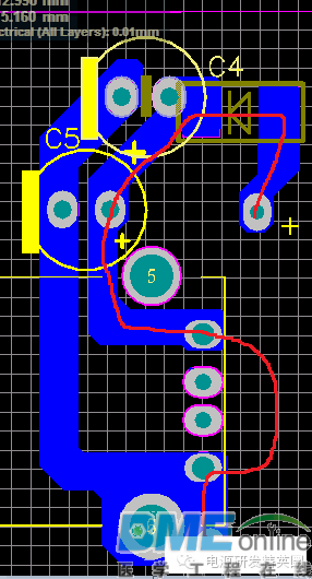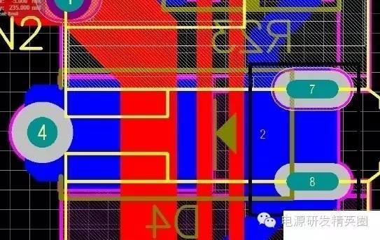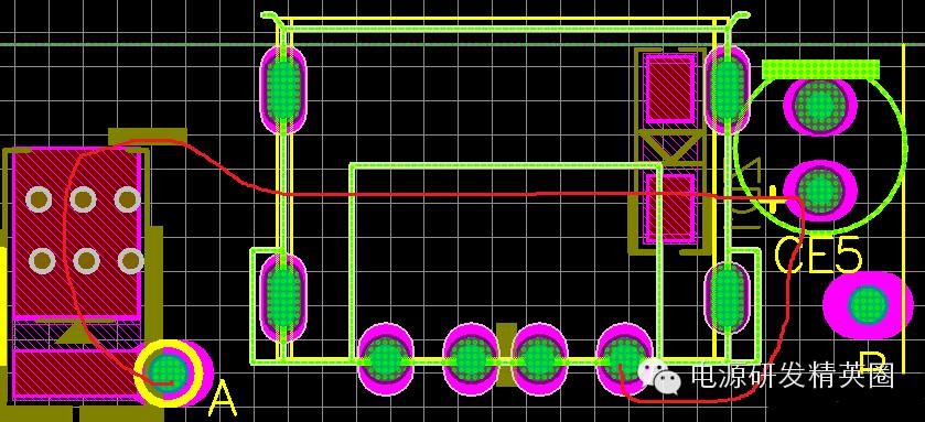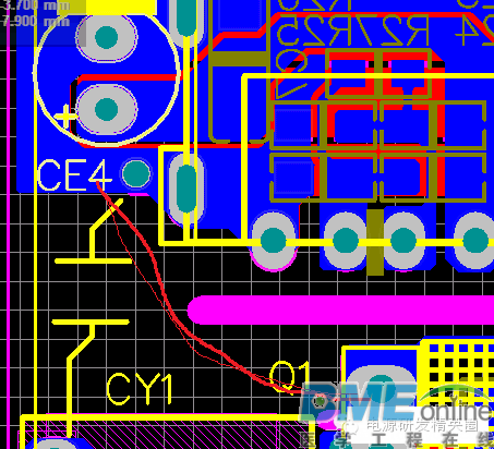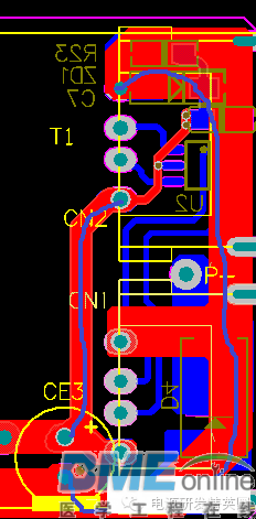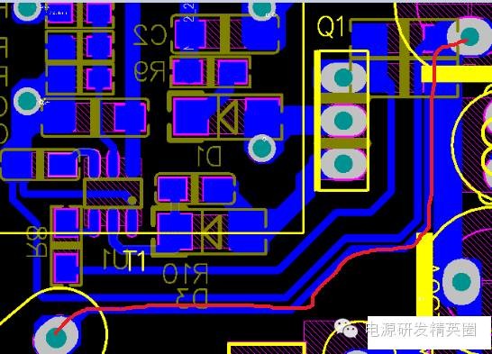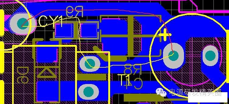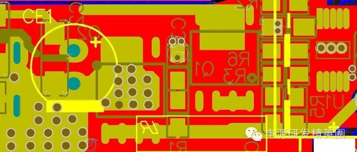 小弟起步比较低,没有什么系统的学习,以前以为了解器件,学好原理就行,后来开始自己Layout才发现,画板对开关电源的重要性,因为小弟Layout自学为主,碰到的实际问题比较多。 如今的电源市场,拼体积、拼价格、拼性能,如何做到这3点就需要一个经验丰富的Layout工程师。 1、静电打坏IC。1.1 VCC电容跟VCC脚越近越好。如下图VCC电容与IC脚太远,静电和耐压都会打坏IC,当然这还要看芯片的抗ESD能力。 3、纹波大家都知道影响这一点的就是减小电容的ESR,加大容量,加差模电感减小纹波电流组成π滤波。上面说到,降低成本,办法总比问题多,先检查板子。,先看下面这个板子,CN1纹波90mV,CN2纹波150mV。仔细看下面蓝色线勾勒出来的地方环路面积太大,把CE3放在2个USB的中间,纹波都降到100mV,实际有困难的话,可以在CN2端再加一个小电容。 4、EMI 日常中我们调试无非就是吸收,加共模,X电容,变压器屏蔽。其实画板也可以解决很多问题。4.1 MOS与变压器太近。传导NG,这很容易分辨,平均值很多地方超峰峰值也很多地方超。把MOS和LN 拉开距离基本就解决。 ![]() 线要跟半边距离大于0.8mm,给大家看一张图,几乎贴板了,实物成这样了只有0.4造成过电流能力不足。 ![]() |