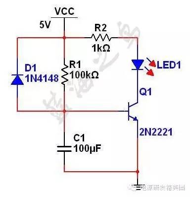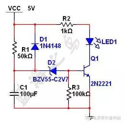 延时电路经常会用到,最简单的就是RC电路。 图一是最简单的RC延时电路,目的是延时点亮LED。R1给C1充电,等电容电压到达三极管基极导通电压大概0.7V时,三极管开通,LED点亮,二极管D1是让C1可以快速放电的作用。 延时时间 ,其中V1为电源电压,V0为电容初始时刻电压,Vt为t时刻电容电压。在这个电路里,V1=5V,V0=0V,Vt=0.7V。延时大概1.5S。 电路虽然结构简单,但是要实现较大的延时就要选用大容量的电容,而且充电电阻R1不能太大,否则三极管不能处于开关状态。 {C} 图一 图二再看图二,主要是多加了一个2.7V的稳压二极管D2,这时候情况就有所改观。可以看到,令三极管开通的电容电压提高了2.7V,也就是说Vt=0.7+2.7=3.4V。代入公式算得延时t=5.7S。本人在Multisim11.0中仿真结果不相上下。图二中R3电阻是为了把稳压二极管的反向漏电流导走,防止充电过程中三极管微导通。