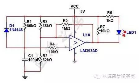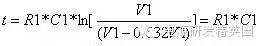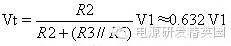图三 最后看图三,为了提高延时精度,使用了电压比较器。电容电压作为反相端输入,R3和R2对电源的分压作为同相端输入。初始状态时,V+ > V-,比较器输出高电平,LED不亮;当电容电压升高到Vt时,V- > V+,比较器输出低电平,LED被点亮。R5是正反馈电阻,可以有效消除输出抖动。要算出延时时间就要先算出Vt,初始状态下,比较器输出高电平,R5相当于与R3并联,于是算出 。代入公式 ,再代入R1和C1,得到延时为5S。 这里分压电阻R3和R2采用了特殊的比值,使得取ln刚好为1,这样延时时间仅仅由R1和C1来决定,给计算带来了简便,同时与电源电压V1也没有任何关系。这个电路可以用在延时精度较高的场合。 |