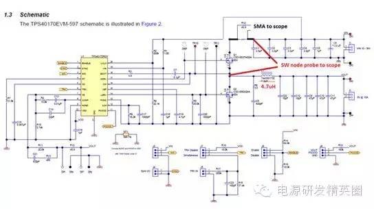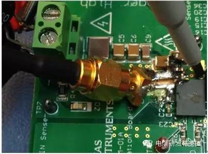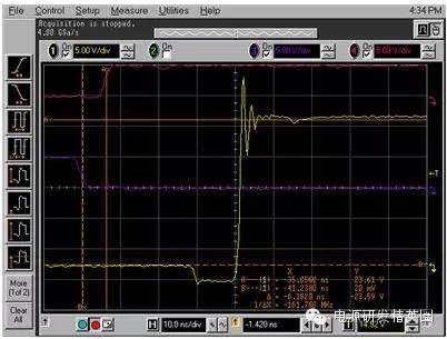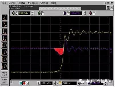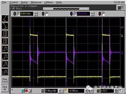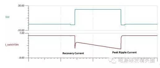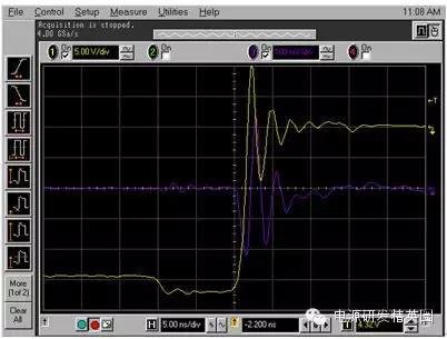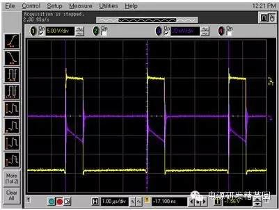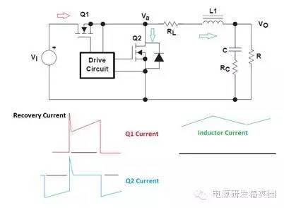 图2:反向恢复电流波形恢复的电荷,Qrr,被分为两个分量:恢复之前的Qa和恢复之后的Qb二极管在此时开始支持反向电压请见图3。你也许见过Qb与Qa一样的软恢复,这样的话,di/dt比较慢,或者说,你见过Qb很小,而di/dt很高的“活跃”二极管。当di/dt很高时(由二极管急变引起),桥式功率环路中寄生电感的响应方式是把它们储存的电能倾倒到寄生节点电容中;电压振铃会由于二阶响应而出现。这也是将输入功率级旁路电容器放置在输入级附近的原因。由于环路中用于快速恢复的电感较少,由寄生电容导致电压振铃的电能较少。 图3:已恢复的电荷我用常规的方法来计算反向恢复损耗:我使用的是数据表中的Qrr额定值,并将其乘以频率和输入电压(如果是降压转换器)或输出电压(如果是升压转换器)。二极管或MOSFET数据表通常指定一个反向恢复时间和一个反向恢复电荷。例如,CSD18563Q5A指定了一个49ns的反向恢复时间,trr,以及一个63nC的Qrr。方程式1计算在一个300kHz,24V->5V降压转换器中,由Qrr所导致的损耗一阶估算值:Qrr损耗 ~24V * 300kHz * 63nC = 454mW (1)请注意!Qrr通常是25°C温度下,针对特定Ifwd和di/dt的额定值。实际Qrr会在结温上升时,比如说125°C时加倍(或者更多)。di/dt和初始电流都会有影响(更高或更低)。对于活跃型二极管,这个功率的大部分在上部开关内被耗散。对于软恢复二极管,这个功率在上部开关和体二极管之间分离开来。如果di/dt和Ifwd条件与我的应用相类似,我将25°C温度下损耗的2倍作为与恢复相关损耗的估算值。那么,你打算拿这些损耗怎么办呢?实际电路中,由反向恢复导致的真实峰值电流是多少?你也许尝试用一个SPICE工具来仿真恢复,不过我还未在SPICE社区内发现比较好的针对二极管恢复的模型。图4显示的是一个TINA-TI? 仿真的结果;我用我们的24V/5V降压转换器的TPS40170产品文件夹对这个仿真进行了修改,从而显示出顶部开关内的开关节点电压 (SW) 和电流(负载电流加上反向恢复电流,以及用一个10mΩ分流电阻器感测到的开关节点电容电流)。 图4:TINA-TI 仿真:TPS540170注意到大约5A的峰值纹波电路,以及5A峰值反向恢复电流加上开关节点电容充电电流。我运行了这个仿真,并且将温度从27°C增加至125°C峰值恢复电流没有增加并且看起来好像SPICE没有对这个恢复进行正确建模。 接下来我们来看一看在一个真实电路中测量反向恢复的方法。测量一个同步降压转换器中的反向恢复不太容易。电流探头太大,并且会大幅增加功率级环路中的电感。而且电流探头的带宽也不够。使用一个分流电阻器怎么样?这听起来是可行的,不过你需要确保这个器件不会引入过大的环路电感。我找到了几个电阻值在10mΩ,并且具有“低电感”的电阻器。我很想把这个器件放在同步FET的源极上,不过会有两个问题:·分流电阻器上会出现栅极驱动电流,以及恢复和负载电流。·这个分流电阻器将增加电感,会由于高di/dt电流而影响到下桥栅极驱动。其中一个解决方案就是将分流电阻器放在上桥MOSFET的漏极内,这样的话,分流电阻器就不会影响到栅极驱动了。Vishay VCS1625/Y08500R01000F9R就具有这样的功能它内置有开尔文连接,并且具有能够减少电感的结构。请见图5。 图5:分流电阻器(Vishay公司生产)硅MOSFET恢复测量为了用一个硅MOSFET桥获得基线Qrr测量值,我掏出一把切割刀,在TPS40170EVM-597上为分流电阻器辟出了一个安全岛,并将这个分流电阻器放置其中。我使用的是一条50Ω SMA至BNC电缆,将信号传送到这个示波器(与50Ω的电阻值端接)。我串联了一个50Ω的电阻器,这样的话,我得到一半的信号值,不过没有振铃。注意在同时使用不同类型的探头时要进行失真调节!需要注意的一点是,当分流电阻器位于顶端时,这个示波器被接地至正输入电压轨。这意味着电源正输出被接地(负电源接至降压转换器),任何其它测试设备,比如说负载测试器,一定不能使流经示波器连线的电源短路。图6显示的是经修改的评估模块 (EVM) 电路原理图。 图6:用于反向恢复测量的经修改的硅桥图7显示了插入分流电阻器后的TPS40170 EVM。 图7:EVM探测技术图8显示的是开关节点,以及300kHz, 24VIN, 5VOUT 和4AOUT 时的分流波形。 图8:硅桥开关波形在图8中,黄色是软件节点,而紫色表示的是顶部FET漏极电流。电流平均值的“三角”波形与4A负载完美匹配 -> 20mV = 4A。在图9中,针对TPS40170/硅MOSFET的高亮反向恢复电荷用红色显示(使用的是CSD185363A)。峰值恢复电流为18A左右 (90mV),据我估算,对于24V*300KHz*100nC = <720mW的损耗,Qrr大约小于100nC。需要注意的是,这个电流在“红色区域”内的部分在开关节点上升时流入负载,所以估算值也许会比Qrr高一点。 图9:硅桥反向恢复想象一下这种情况!每3.3μs从输入电源汲取一个18A、12ns宽的电流脉冲。高di/dt将导致所有功率级中的环路电感产生出电压,并且有可能造成运行问题。幸运的是,TPS40170EVM-597具有一个可以缓解这些问题的极佳布局布线―实际上,这些问题并不会一直出现。进入GaN,恢复在哪?我使用了同样的技术来测量LMG5200 GaN(氮化镓)EVM。我首先当LMG5200EVM在负载为4A,将24V驱动为5V时,抓取了一个LMG5200EVM开关节点电压的参考示波器波形图。我使用的是一台安捷伦33220A,在300kHz时,将一个固定的21%左右的占空比驱动至LMG5200 PWM输入。请见图10,通道1显示的是开关节点波形。 图10:LMG5200 GaN开关波形我将高/低驱动信号包括在内,作为