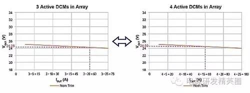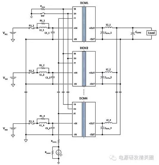 图1:一种均流方法是在每个电源输出使用较低数值的镇流电阻器,但由于电阻相关的耗散和整体效率,这种方式也存在问题。这个“OR”那个?针对直连困扰的看似“简单”的一个解决方案是只在每个电源和所有电源的公共连接点之间使用二极管连接,该技术通常称为二极管ORing(图2)。ORing二极管对防止电源吸入(sinking)连接点的电流非常有效,但通常不足以解决有独立误差放大器的电源中的均流误差,因为二极管的导通特性曲线比较陡,以致电源设定值的参数差异仍然会导致严重的均流问题。 图2:原则上可以通过使用二极管组合多个直流电源输出来隔离一个电源与另一个电源,但这种配置有很多有关负载平衡和均流的性能问题。二极管ORing对于其输出可以同时吸入和流出电流(双象限工作)的电源独立运行来说一般是必需的。相对单象限电源来说,如果没有ORing二极管,直接并联这种电源的效果更糟糕。单象限电源只有负载均流误差,但双象限电源的调节会产生竞争性输出电压控制。这将导致超过负载电流的大电流在阵列中的电源间循环流动,并可能立即导致一个或多个电源过载。此外,如果二极管的导通阈值是负温度系数,这实际上将会促使阵列中的电流错乱(hogging)。采用正温度系数的整流肖特基二极管,或是通过使用在有源ORing实现中采用FET和整流器构建的类似二极管的功能是减少该问题的一个方法,但由于二极管正向压降,效率将会降低,并且有源ORing会增加成本和复杂性。在某些情况下,二极管ORing仍然可以改善系统级的可靠性。感兴趣的主要情况是其中的一个电源出现输出FET或者电容短路,这可能危及共同输出电压轨。ORing二极管会快速将该短路电源与输出隔开,从而提高可靠性和系统鲁棒性。谁来负责?为了在阵列中实现可靠和可预见的工作,电源一般必须专门针对并联工作来设计。我们必须全面考虑启动同步、故障保护协调,以及控制回路的稳定性。对于一个可为负载提供更高水平可用电流的并联阵列电源来说,需要采用针对阵列使用的某种类型的控制回路策略。一种流行的控制策略是运行没有内部稳压放大器的电源,但用一个由误差放大器控制的公共控制信号输入将它们组合在一起。这个误差放大器可调节系统的输出,然后其单反馈信号被分发到系统中的所有电源。这种流行控制策略的主要优点是输出电压的调节很好,而均流误差由部件间的调制器增益的偏差所决定。不利的方面是,使用单个误差放大器和单线控制母线可能会产生单点失效,这对某些类型的高可靠性系统可能是个问题。另外,调制器增益的参数误差难以控制,这往往导致制造商权衡良率来控制共享误差。对于单控制回路的方法,如果电源对其控制节点输入具有很小的容限,那么均流误差可降到最低。如果共享误差很大,那么要么必须降低阵列的额定功率,以避免由于共享失衡造成阵列中任何单个电源过载,要么需要采用具体处理措施。用于改善由于不同部件间的差异所造成的均流误差的技术包括在生产中针对输出误差进行校准(这种方法昂贵),或者在阵列中每个电源附近增加电流控制环来消除该误差(这会增加复杂性和器件)。这些本地回路的电流检测通常需要对电源增加分流电阻。对于控制节点是参考初级侧的隔离DC-DC电源来说,会出现第二种障碍:初级侧和次级侧隔离边界的误差放大器输出信号的传输问题。根据所使用的隔离元件,隔离技术经常会增加成本,占用宝贵的空间,而且会对可靠性带来不利影响。第二种允许在阵列中采用单独电源并联的控制回路策略是使用负载线来效仿镇流电阻器方法中的路径上的电阻。通过实施所谓的“降压均流(droop-share)”的负载均流方法,每个电源都有单独的参考和集成的误差放大器,但随着负载电流的增加,参考电压被有意处理为线性减少,从而使得输出电压降低一定值。并联电源可能会对瞬态响应和负载调节带来消极影响。降压均流方法刻意使用了负的负载调节方式将负载分布到阵列中的模块。因此,对于降压均流阵列,负载调节往往比用传统单误差放大器创建的阵列差。可以在降压均流阵列周围使用一个外部控制回路,以有效抵消负的负载调节方式。因为外部回路本身就是一个误差积分器,由此产生的静态调节误差与传统误差放大器情况相同。电源设计可以简化,而增强并联配置电源供应商可以采取步骤来应对并联挑战。例如,采用转换器级封装(ChiP)的Vicor的DCM DC-DC转换器采用一条内置负斜率负载线;因此,随着负载的增加,DCM的内部稳压器仅略微降低输出电压。这实际上就像小镇流电阻器的实现方法,但并没有用任何实际的电阻器(图3),而且具有其他几个关键特性。 图3:采用ChiP封装的Vicor的DCM适用于通过简单将其输出连接在一起的并联;不需要二极管、镇流电阻器,或其他负载平衡元件。首先,它是一种实现镇流电阻器的不同方法,因为没有物理电阻器,也没有V×I生成的热量,不涉及热能浪费。第二个区别涉及动态响应,因为频率高达数百千赫,由于没有高频寄生问题,在其I-V传递函数曲线中,真正的电阻器可以被认为具有无限的“带宽”。因此,电阻器上电压的任何瞬时变化都会导致电流的相应变化。在DCM转换器中,负载线是通过数字/模拟转换器的离散时间调制器产生误差放大器的参考电压来实现的。正确的参考值主要是基于DCM输出