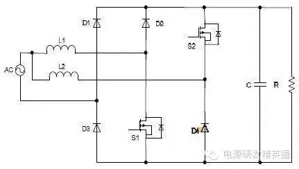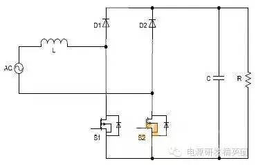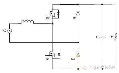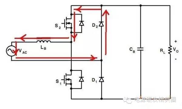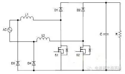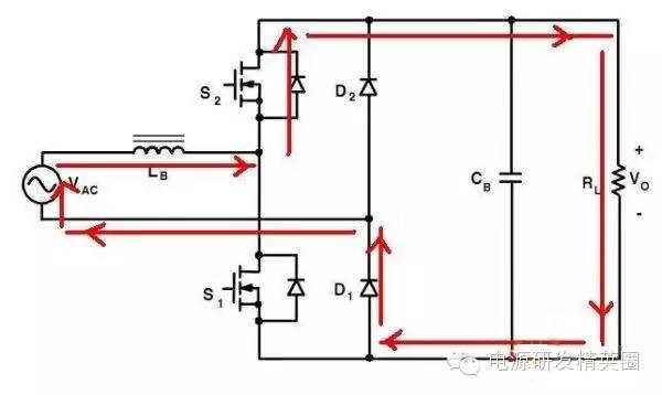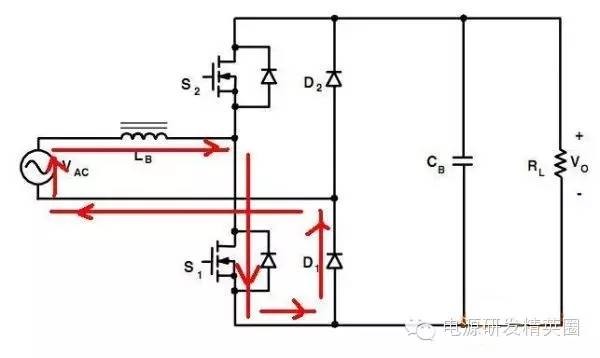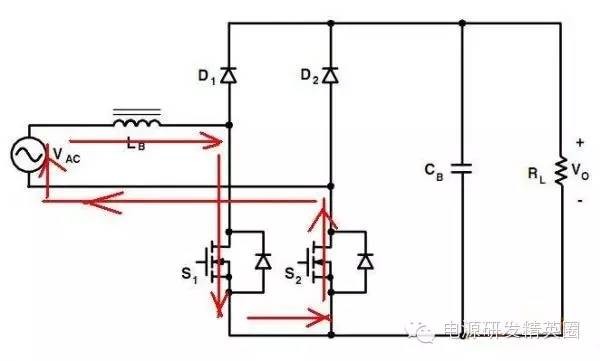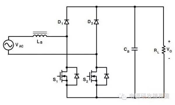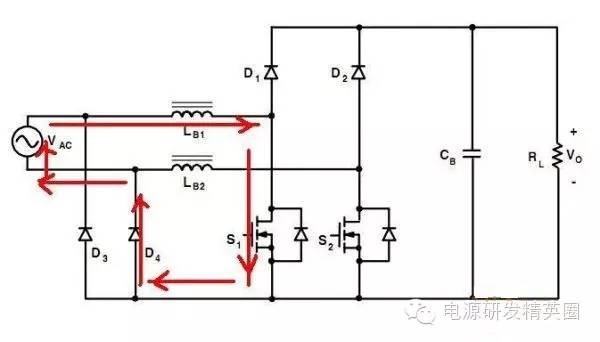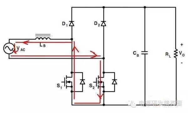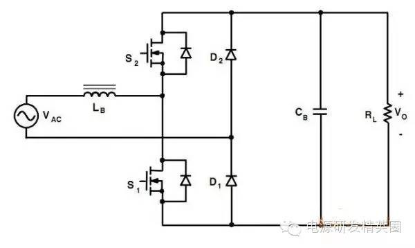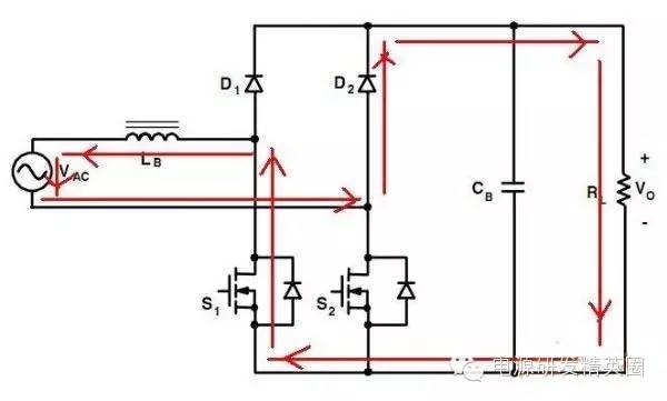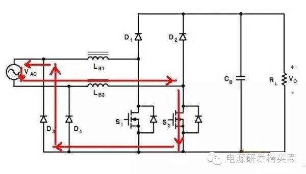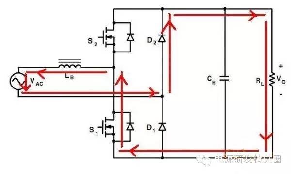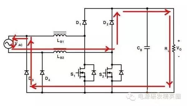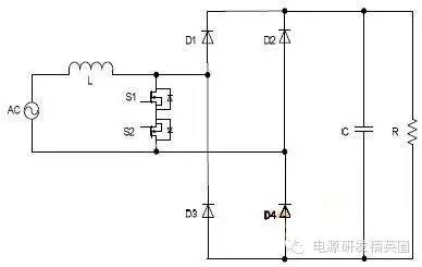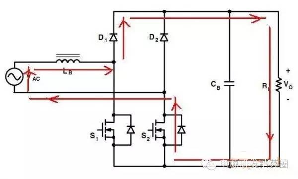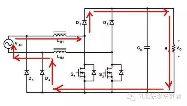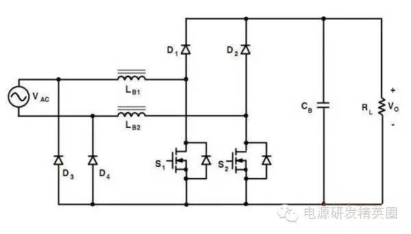 目前高效率的电源越来越多,大家追求的效率也越来越高,前些时听说华为已经做出了98%效率的AC-DC模块,在业界引起了轰动!相信再过几年都会有99%效率的电源出来了! 高效率的电源自然离不开无桥PFC,这次主要介绍各种无桥PFC常见拓扑以及其演变方式。 主要从几个大的方面讨论无桥PFC,涉及到以下几个问题: 1、目前较为流行的几种无桥PFC拓扑以及相互演变形式; 2、几种无桥PFC各自的优缺点; 3、PFC电压环为什么不能快? 4、CCM和CRM模式的优缺点及其设计方法; 5、关于PFC中的乘法器在什么时候可以不要? 6、无桥PFC的控制方式; 7、PFC中磁性器件的选择; 传统的PFC电路图如下,每次都有2个二极管(整流桥)导通,还有一个MOS管或者升压二极管导通,即每次导通3个功率器件,损耗大。 ![]() 为了解决损耗大的问题,于是有人提出了无桥PFC,下图就是无桥PFC的一种形式,每次只导通2个功率器件。 (注:此拓扑有较大的缺陷,先留一个悬念) ![]() 正半周,S1,S2同时导同,电感储存能量; ![]() 之后断开S1,D1导通,S2导通,电感释放能量! ![]() 同理,负半周的时候,S1,S2同时导通,电感储存能量; ![]() 之后断开S2,D2导通,S1导通,电感释放能量! ![]() ![]() 这幅图就是经典的图腾柱式无桥PFC。 正半周,S1,D1同时导同,电感储存能量; ![]() S1断开后,S2和D1导通,电感向负载释放能量; ![]() 在负半周,D2,S2同时导通,电感储存能量; ![]() S2断开后,D2和S1导通,电感向负载释放能量; ![]() 前面也说过,第一种无桥PFC有较大的缺点,就是EMC干扰很大,而图腾柱式的无桥PFC就没有这个问题。 在正半周,S2一直是导通状态,相当于N线直接连到了GND上面;而在负半周,N线连到了一个高频(开关频率)跳动的点上,这样会带来很大的干扰。 ![]() D3,D4就是额外增加的二极管! 交流输入正半周,S1,D4导通,电感LB1储能; ![]() 之后S1断开,D1和D4导通,电感LB1释放能量; ![]() 交流输入负半周,S2,D3导通,电感LB2储能; ![]() 之后S2断开,D2和D3导通,电感LB2释放能量; ![]() 其实有五种无桥PFC拓扑 其中有三种EMI比较小 ![]() ![]() ![]() 这仨要么有额外的元件(1和3) 要么现有器件无法实现(2) 这俩EMI问题比较严重 ![]() ![]() 这些拓扑在电感储能和释放能量的时候电流的路径都经过2个功率元件 因此导通损耗都应该差不多.... 顺便讲讲CCM的PFC计算步骤。 CCM的计算一般可以分为以下几个步骤: 1、计算最大输入功率:最大输入功率Pin=Po/η; 2、计算最大输入电流有效值:输入电流最大有效值Iinrms(max)=Pin/Umin,以及输入电流峰值为1.414*Iinrmsmax; 3、由于是CCM模式PFC,纹波电流一般选取输入电流峰值的10%-20%,这里取20%,那么delta I=0.2*Iinrmsmax; 4、有效值叠加纹波电流后,输入电感电流最大峰值为:Ipk=Iinrmsmax+0.5*delta I; 5、最后根据公式计算一个比较重要的参数,即PFC电感量L,电感最小值为Lmin=Vo/4*delta I*fk),这里fk指PFC的工作频率,Vo指PFC输出电压; 6、电感材质的选择:由于是CCM模式的PFC,偏置电流比较大,一般选择B值比较大的粉芯类材质,例如铁硅铝,铁硅,MPP,high flux等等; 7、输出母线电容大小的选择:Cmin=Io/(2*π*fac*Vpk-pk),此处,Io为输出电流大小,可以根据输出功率和输出电压计算出来,fac指交流电压频率,一般为50HZ,Vpk-pk为输出电压的峰峰值纹波。 算一个900W的!效率按照90%计算; CCM的计算一般可以分为以下几个步骤: 1、计算最大输入功率:最大输入功率Pin=Po/η=900/0.9=1000w; 2、计算最大输入电流有效值:输入电流最大有效值Iinrms(max)=Pin/Umin=1000/85=11.76,以及输入电流峰值为1.414*Iinrmsmax=1.414*11.76=16.6; 3、由于是CCM模式PFC,纹波电流一般选取输入电流峰值的10%-20%,这里取20%,那么delta I=0.2*Iinrmsmax=0.2*11.76=2.35; 4、有效值叠加纹波电流后,输入电感电流最大峰值为:Ipk=Iinrmsmax+0.5*delta I=11.76+0.5*2.35=12.94; 5、最后根据公式计算一个比较重要的参数,即PFC电感量L,电感最小值为Lmin=Vo/(4*delta I*fk)=400/(4*2.35*50khz)=851uH,这里fk指PFC的工作频率,Vo指PFC输出电压; 6、电感材质的选择:由于是CCM模式的PFC,偏置电流比较大,一般选择B值比较大的粉芯类材质,例如铁硅铝,铁硅,MPP,high flux等等; 7、输出母线电容大小的选择:Cmin=Io/(2*π*fac*Vpk-pk),此处,Io为输出电流大小,可以根据输出功率和输出电压计算出来,fac指交流电压频率,一般为50HZ,Vpk-pk为输出电压的峰峰值纹波。