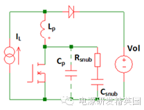 图3 MOSFET开关关断瞬变时的电压过冲 在实际电路中,开关应力要高得多,因为存在寄生电感(Lp)和寄生电容(Cp),如图4所示。由于PCB布局与走线,Cp包含开关输出电容和杂散电容。Lp包含PCB路由寄生电感和MOSFET引线电感。这些来自功率器件的寄生电感和电容组成滤波器,并在关断瞬变发生后立即产生谐振,从而将过量电压振铃叠加到器件上,如图3所示。若要抑制峰值电压,可在开关上部署一个典型RC缓冲器,如图4所示。电阻值必须接近需减幅的寄生谐振阻抗值。缓冲器电容必须大于谐振电路电容,同时又必须足够小,以便将电阻功耗保持在最低水平。 图4: 电阻电容缓冲器配置 如果功耗并非关键因素,那么有一种方法可以快速设计RC缓冲器。由经验可知,选择缓冲器电容Csnub,使其等于开关输出电容值与安装电容估算值之和的两倍。选择缓冲器电阻Rsnub ,所以: Rsnub上的功耗可估算如下(给定开关频率fs): 当这一简单的经验设计不再限制峰值电压时,便可执行优化步骤。 优化RC缓冲器: 在那些功率损耗很重要的应用中,应当采用优化设计。 首先,测量MOSFET开关节点(SW)在关断时的振铃频率(Fring)。在MOSFET上焊接一个100 pF低ESR薄膜电容。增加电容,直到振铃频率为初始测量值的一半。现在,由于振铃频率与电路电感和电容乘积的平方根成反比,开关总输出电容(增加的电容与初始寄生电容之和)增加四倍。因此,寄生电容Cp为外部所增加电容值的1/3。现在,式通过下可获得寄生电感Lp: 一旦求出寄生电感Lp和寄生电容Cp,缓冲器电阻Rsnub和电容Csnub便可根据下列计算进行选择。 如果发现缓冲器电阻值过低,可对其进一步微调以降低振铃。 Rsnub上的功耗(给定开关频率fs)等于。 |