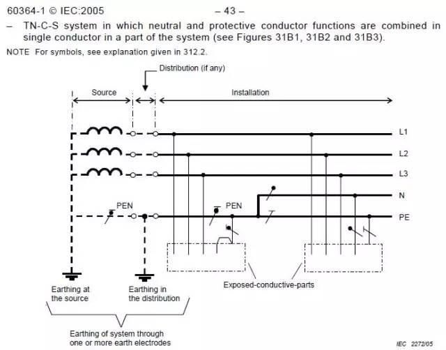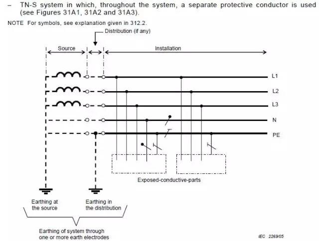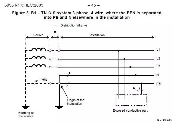 首先要明白什么叫做线制,也即三相四线制的定义。这个定义可以参见IEC 60364和GB 16895系列标准,标准的统一名称是“建筑物电气装置”。注意这里所指的系列标准,是因为此标准号下有几十个标准,例如IEC 60364.1、IEC 60364.2、……、等等。 三相我们很容易理解,就是发电机的三个绕组,它们之间的电角度是120度。“线”,按GB 16895中规定,指的是三相配电系统中在正常运行中有电流流过的导线叫做“线”。三条相线,在正常运行时是有电流流过的,它们当然属于线的范畴。中性线,在正常运行状态下,由于三相不一定平衡,因此中性线也有电流流过,因而也被称为“线”。那么接地线PE呢?它在正常运行时是没有电流流过的,因此接地线不叫做“线”。 1)如果电力变压器的中性点直接接地,然后把中性线N和接地线PE合在一起以PEN的型式接入电路,这在IEC 60364和GB 16895中被定义为TN-C系统。注意PEN的称呼,叫做保护中性线,或者叫做保护接地线。见下图: 此图是IEC 60364对TN-C的权威定义。我们看到三条相线L1、L2、L3,还有保护接地线PEN此图是IEC 60364对TN-C的权威定义。我们看到三条相线L1、L2、L3,还有保护接地线PEN注意:TN-C是三相四线制。请特别注意:PEN线在引入用电设备时,首先接到用电设备的外露导电部分,也即用电设备的金属外壳,然后才接到用电设备的中性线接入端子。这种接线方法有两重意义: 第一说明PEN线的功能以保护为优先, 第二说明PEN线具有中性线的特性。 在讨论接地系统时,保障人身安全永远是第一位的。因为PEN线是以保护为主要目的,但我们看到,当PEN线引入负载时在某处断线,则断点后侧的PEN线上的电压会因为负载不平衡而上升,最高可能会升至相电压。因此,IEC 60364和GB 16895规定:TN-C系统可用于三相不平衡的系统,但不得用于具有火灾隐患的场所。例如油库、矿山、港口等等。同时,还强制性地要求TN-C系统的PEN必须多点接地。 2)如果电力变压器的中性点直接接地,然后把中性线N和接地线PE分别引出,这在IEC60364和GB16895中被定义为TN-接地系统。见下图: 此图是IEC 60364对TN-S的权威定义。我们看到三条相线、一条中性线N和一条接地线PE此图是IEC 60364对TN-S的权威定义。我们看到三条相线、一条中性线N和一条接地线PE注意:TN-S是三相四线制,不是三相五线制!TN-S接地系统中,N和PE被分开了,两者的功能也单一化了。值得注意的是:PE线在负载侧是可以再次接地的。IEC 60364并没有限制PE线的接地次数。但是,PE线和N线不得再次合并,两者必须相互绝缘。利用PE线的重复接地,我们可以实现用电设备处的等电位连接技术。所谓等电位连接,是指把相关的若干用电设备的外露导电部分相互连接起来,再一点接地。当然,PE线在这里也被再次接地。这样的好处是:若发生了相线的碰壳事故,由于有了等电位连接的保护,人身安全得到了有效的保障。根据IEC 60364和GB 16895,根本就不存在所谓三相五线制这种说法。这种三相五线制的称呼是我们中国人自己发明的。一旦走出国门,甚至只是到了香港或者台湾,若我们对当地的电气工作者说三相五线制,会被别人耻笑!!!!!!!!!3)如果低压配电系统的接地系统是TN-C,但在电源入户前,把PEN再次接地,然后分开为PN和N,这种接地系统被IEC 60364或者GB 16895称为TN-C-S。见下图: 此图是IEC 60364对TN-C-S的权威定义。此图是IEC 60364对TN-C-S的权威定义。这种接线方式也是我们家中配电箱中的最主要接线方法。指的注意的是:PE和N一旦分开后,不得再次合并。PE和N两者之间必须绝缘。我们来看看什么叫做接地。接地有两类,一类叫做工作接地,一类叫做保护接地。例如TN-S系统下的变压器,我们看到变压器的中性点接地,它的用途是为变压器的中性点建立工作电位,所以叫做工作接地。再例如TN-S系统下的负载侧,我们看到它的外露导电部分与PE线接在一起,以此实现对人身的安全防护,所以这种接地叫做保护接地。低压配电系统的接地型式有IT、TT、TN等三种,其中TN又分为TN-S、TN-C和TN-C-S。TN的意思是:变压器中性点直接接地,负载的外露导电部分通过PE线或者PEN线接地。几个概念重复性地总结一下:第一,关于TN-C对于TN-C,我们从图中看到,它的PEN是合并的。这条PEN线的名称叫做保护中性线,也叫做零线。从零线的功能性来说,它的保护功能是第一位的,中性线功能是第二位的。因此当零线接入负载侧时,首先要接入保护端子,然后再引入到中性线端子。这一点,我们从IEC 60364的TN-C的负载侧图中可以明确地看到。TN-C因为少了一根线,在工程施工是具有很大的成本优势,因此为很多工程项目所采用。值得注意的是:若PEN线断线,则断点的前方其电位接近于零(要看线路长度),而断点后方的PEN线,其电位会迅速升高。其原因很简单,断点后方的PEN线电压等于负载侧三相电压的相量和。在极端情况下,断点后方的电压会上升到相电压。因此,TN-C接地系统的PEN线必须多点接地。同时,TN-C系统不允许用在有爆炸可能的环境中,例如煤矿、油库、危险品仓库等等。 第二,关于TN-C-S对于居家和办公用电当然可以使用TN-C接地系统。IEC 60364规定,当PEN线引到入户处时,必须接地,然后分开为PE线和N线。这就是TN-C-S接地系统。我们再次认真地看看TN-C-S接地系统,如下: 注意第一个负载接在TN-C系统中,所以PEN线首先引到负载的保护端子,然后再引到中性线端子;第二个负载接在TN-C-S系统中,所以PE线引到保护端子,