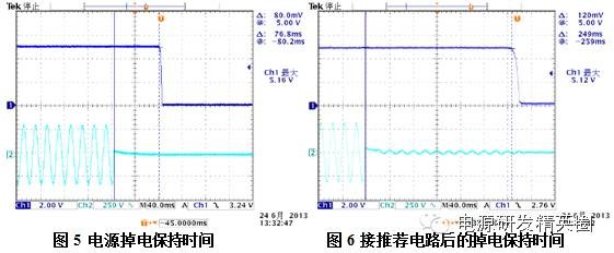 图2 ACDC开关电源原理框图 我们通过举例来说明决定掉电保持时间的因素。假设一款Vo=5V、Po=20W、效率为η=0.78的产品,DC-DC部分可正常工作的最低电压Vin_min=100V,电源内部输入滤波电容Cin=47uF。假设标称220Vac输入整流滤波后的电压为直流电压(实际有一定纹波),其值Vin_nor=308V,根据能量守恒有下式: 0.5*Cin*(Vin_mor2-Vin_min2)=⊿t*Po/η……(1) 代入数值可得:⊿t=77.9ms。 从上式可以看到,⊿t与输入电容、AC输入电压、产品效率成正比,而与输出功率、DC-DC部分最低工作电压成反比。 在实际的工程环境中,输入电压是固定的。对某一款具体的AC-DC电源产品来说,内部输入滤波电容Cin、DC-DC部分最低工作电压Vin_min、效率η都已无法改变,所以,电源本身的掉电保持时间无法改变。通过外围调整,也无法改变产品的Vin_min和η,唯一能调整的是在电源前端再接一级整流滤波,外接的滤波电容与电源内部的输入滤波电容是并联关系,等效增加了Cin,增加了掉电保持时间。 如果电源前端加的滤波电容取100uF/400V,则掉电保持时间在之前的基础上增加165.7ms。如果电源工作在半载条件,则掉电保持时间可以再增加一倍,如表1所示。 表1 掉电保持时间与输入电容、负载关系表 2 输出电容对掉电保持时间的影响 在上述条件下,我们再计算一下通过增加输出电容Co来延长掉电保持时间的效果。假设:输出电压精度是±2%,则输出电压下限Vo1=4.9V、Co=40000uF,则有: 0.5*Co*(Vo2-Vo12)=⊿t1*Po……(2) 代入数值可得:⊿t1=1ms。 我们发现,输出40000uF的电容延长掉电保持时间仅有1ms!由此可见增加输出电容对掉电保持时间的影响微乎其微。 3 推荐外围电路 如图3所示,外围电路的输入端接市电,输出可等效为直流电源,接在ACDC开关电源的L、N上。C1要根据实际负载、输入电压以及所需要的保持时间来确定,没有明确的推荐值。由于增加了C1,开机冲击电流会增大,R1可以用来减小该冲击电流,可以选择3W的绕线电阻,阻值大致在2~7.5欧姆之间。对于D1,可以选1000V、电流在1.5A及以上的整流桥,另外整流桥能承受的冲击电流(规格书中有说明)应大于实际电路中的冲击电流。 图3 外围推荐电路 4 试验结果与分析 为验证理论分析和计算的正确性,选取MORNSUN的LH25-10B05来进行测试。在输入电压220Vac,负载4A的条件下,LH25-10B05的掉电保持时间为76.8ms,波形如图5所示;按推荐电路外接100uF/400V输入滤波电容后,电源的掉电保持时间增加到249ms,波形如图6所示。试验结果与理论计算结果吻合。 5 结语 本文理论分析了开关电源掉电过程,推导出了掉电保持时间的计算公式;根据公式找到了通过外接电路来增加掉电保持时间的途径。通过实际测试,验证了理论计算的正确性。该方法实施简单,对增加掉电保持时间效果显著,具有很强的工程指导意义。 |