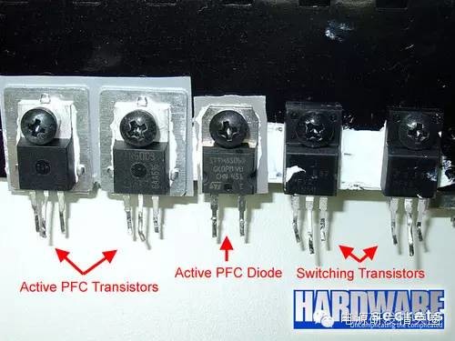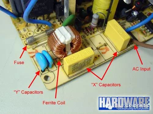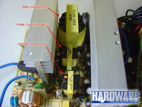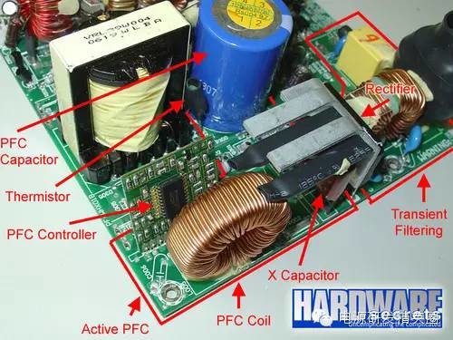 PC电源知多少 个人PC所采用的电源都是基于一种名为“开关模式”的技术,所以我们经常会将个人PC电源称之为开关电源(Switching Mode Power Supplies,简称SMPS),它还有一个绰号DC-DC转化器。本次文章我们将会为您解读开关电源的工作模式和原理、开关电源内部的元器件的介绍以及这些元器件的功能。 ●线性电源知多少 目前主要包括两种电源类型:线性电源(linear)和开关电源(switching)。线性电源的工作原理是首先将127 V或者220 V市电通过变压器转为低压电,比如说12V,而且经过转换后的低压依然是AC交流电;然后再通过一系列的二极管进行矫正和整流,并将低压AC交流电转化为脉动电压(配图1和2中的“3”);下一步需要对脉动电压进行滤波,通过电容完成,然后将经过滤波后的低压交流电转换成DC直流电(配图1和2中的“4”);此时得到的低压直流电依然不够纯净,会有一定的波动(这种电压波动就是我们常说的纹波),所以还需要稳压二极管或者电压整流电路进行矫正。最后,我们就可以得到纯净的低压DC直流电输出了(配图1和2中的“5”) ![]() 配图1:标准的线性电源设计图 ![]() 配图2:线性电源的波形 尽管说线性电源非常适合为低功耗设备供电,比如说无绳电话、PlayStation/Wii/Xbox等游戏主机等等,但是对于高功耗设备而言,线性电源将会力不从心。 对于线性电源而言,其内部电容以及变压器的大小和AC市电的频率成反比:也即说如果输入市电的频率越低时,线性电源就需要越大的电容和变压器,反之亦然。由于当前一直采用的是60Hz(有些国家是50Hz)频率的AC市电,这是一个相对较低的频率,所以其变压器以及电容的个头往往都相对比较大。此外,AC市电的浪涌越大,线性电源的变压器的个头就越大。 由此可见,对于个人PC领域而言,制造一台线性电源将会是一件疯狂的举动,因为它的体积将会非常大、重量也会非常的重。所以说个人PC用户并不适合用线性电源。 ●开关电源知多少 开关电源可以通过高频开关模式很好的解决这一问题。对于高频开关电源而言,AC输入电压可以在进入变压器之前升压(升压前一般是50-60 KHz)。随着输入电压的升高,变压器以及电容等元器件的个头就不用像线性电源那么的大。这种高频开关电源正是我们的个人PC以及像VCR录像机这样的设备所需要的。需要说明的是,我们经常所说的“开关电源”其实是“高频开关电源”的缩写形式,和电源本身的关闭和开启式没有任何关系的。 事实上,终端用户的PC的电源采用的是一种更为优化的方案:闭回路系统(closed loop system)负责控制开关管的电路,从电源的输出获得反馈信号,然后根据PC的功耗来增加或者降低某一周期内的电压的频率以便能够适应电源的变压器(这个方法称作PWM,Pulse Width Modulation,脉冲宽度调制)。所以说,开关电源可以根据与之相连的耗电设备的功耗的大小来自我调整,从而可以让变压器以及其他的元器件带走更少量的能量,而且降低发热量。 反观线性电源,它的设计理念就是功率至上,即便负载电路并不需要很大电流。这样做的后果就是所有元件即便非必要的时候也工作在满负荷下,结果产生高很多的热量。 看图说话:图解开关电源 下图3和4描述的是开关电源的PWM反馈机制。图3描述的是没有PFC(Power Factor Correction,功率因素校正) 电路的廉价电源,图4描述的是采用主动式PFC设计的中高端电源。 ![]() 图3:没有PFC电路的电源 ![]() 图4:有PFC电路的电源 通过图3和图4的对比我们可以看出两者的不同之处:一个具备主动式PFC电路而另一个不具备,前者没有110/220 V转换器,而且也没有电压倍压电路。下文我们的重点将会是主动式PFC电源的讲解。 为了让读者能够更好的理解电源的工作原理,以上我们提供的是非常基本的图解,图中并未包含其他额外的电路,比如说短路保护、待机电路以及PG信号发生器等等。当然了,如果您还想了解一下更加详尽的图解,请看图5。如果看不懂也没关系,因为这张图本来就是为那些专业电源设计人员看的。 ![]() 图5:典型的低端ATX电源设计图 你可能会问,图5设计图中为什么没有电压整流电路?事实上,PWM电路已经肩负起了电压整流的工作。输入电压在经过开关管之前将会再次校正,而且进入变压器的电压已经成为方形波。所以,变压器输出的波形也是方形波,而不是正弦波。由于此时波形已经是方形波,所以电压可以轻而易举的被变压器转换为DC直流电压。也就是说,当电压被变压器重新校正之后,输出电压已经变成了DC直流电压。这就是为什么很多时候开关电源经常会被称之为DC-DC转换器。 馈送PWM控制电路的回路负责所有需要的调节功能。如果输出电压错误时,PWM控制电路就会改变工作周期的控制信号以适应变压器,最终将输出电压校正过来。这种情况经常会发生在PC功耗升高的时,此时输出电压趋于下降,或者PC功耗下降的时,此时输出电压趋于上升。 在看下一页是,我们有必要了解一下以下信息: ★在变压器之前的所有电路及模块称为“primary”(一次侧),在变压器之后的所有电路及模块称为“secondary”(二次侧); ★采用主动式PFC设计的电源不具备110 V/ 220 V转换器,同时也没有电压倍压器; ★对于没有PFC电路的电源而言,如果110 V / 220 V被设定为110 V时,电流在进入整流桥之前,电源本身将会利用电压倍压器将110 V提升至220 V左右; ★PC电源上的开关管由一对功率MOSFET管构成,当然也有其他的组合