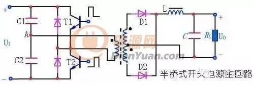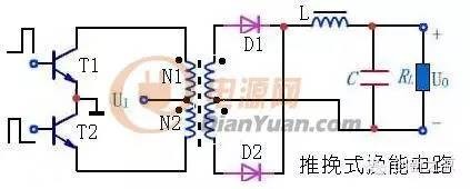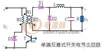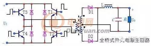 1、 单端正激式 单端通过一只开关器件单向驱动脉冲变压器; 正激脉冲变压器的原/付边相位关系,确保在开关管导通,驱动脉冲变压器原边时,变压器付边同时对负载供电。 该电路的最大问题是:开关管T交替工作于通/断两种状态,当开关管关断时,脉冲变压器处于“空载”状态,其中储存的磁能将被积累到下一个周期,直至电感器饱和,使开关器件烧毁。图中的D3与N3构成的磁通复位电路,提供了泄放多余磁能的渠道。 2、 单端反激式 反激式电路与正激式电路相反,脉冲变压器的原/付边相位关系,确保当开关管导通,驱动脉冲变压器原边时,变压器付边不对负载供电,即原/付边交错通断。脉冲变压器磁能被积累的问题容易解决,但是,由于变压器存在漏感,将在原边形成电压尖峰,可能击穿开关器件,需要设置电压钳位电路予以保护D3、N3构成的回路。从电路原理图上看,反激式与正激式很相象,表面上只是变压器同名端的区别,但电路的工作方式不同,D3、N3的作用也不同。 3、 推挽(变压器中心抽头)式 这种电路结构的特点是:对称性结构,脉冲变压器原边是两个对称线圈,两只开关管接成对称关系,轮流通断,工作过程类似于线性放大电路中的乙类推挽功率放大器。 主要优点:高频变压器磁芯利用率高(与单端电路相比)、电源电压利用率高(与后面要叙述的半桥电路相比)、输出功率大、两管基极均为低电平,驱动电路简单。 主要缺点:变压器绕组利用率低、对开关管的耐压要求比较高(至少是电源电压的两倍)。 4、 全桥式 这种电路结构的特点是:由四只相同的开关管接成电桥结构驱动脉冲变压器原边。 图中T1、T4为一对,由同一组信号驱动,同时导通/关端;T2、T3为另一对,由另一组信号驱动,同时导通/关端。两对开关管轮流通/断,在变压器原边线圈中形成正/负交变的脉冲电流。 主要优点:与推挽结构相比,原边绕组减少了一半,开关管耐压降低一半。 主要缺点:使用的开关管数量多,且要求参数一致性好,驱动电路复杂,实现同步比较困难。这种电路结构通常使用在1KW以上超大功率开关电源电路中。 5、 半桥式 电路的结构类似于全桥式,只是把其中的两只开关管(T3、T4)换成了两只等值大电容C1、C2。 主要优点:具有一定的抗不平衡能力,对电路对称性要求不很严格;适应的功率范围较大,从几十瓦到千瓦都可以;开关管耐压要求较低;电路成本比全桥电路低等。这种电路常常被用于各种非稳压输出的DC变换器,如电子荧光灯驱动电路中。 本文转自电源网