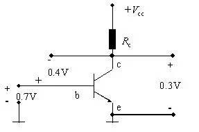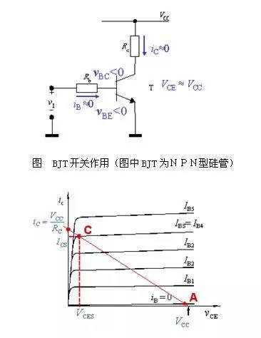 BJT的开关工作原理: 形象记忆法 :对三极管放大作用的理解,切记一点:能量不会无缘无故的产生,所以,三极管一定不会产生能量。它只是把电源的能量转换成信号的能量罢了。但三极管厉害的地方在于:它可以通过小电流控制大电流。假设三极管是个大坝,这个大坝奇怪的地方是,有两个阀门,一个大阀门,一个小阀门。小阀门可以用人力打开,大阀门很重,人力是打不开的,只能通过小阀门的水力打开。所以,平常的工作流程便是,每当放水的时候,人们就打开小阀门,很小的水流涓涓流出,这涓涓细流冲击大阀门的开关,大阀门随之打开,汹涌的江水滔滔流下。如果不停地改变小阀门开启的大小,那么大阀门也相应地不停改变,假若能严格地按比例改变,那么,完美的控制就完成了。在这里,Ube就是小水流,Uce就是大水流,人就是输入信号。当然,如果把水流比为电流的话,会更确切,因为三极管毕竟是一个电流控制元件。如果水流处于可调节的状态,这种情况就是三极管中的线性放大区。如果那个小的阀门开启的还不够,不能打开大阀门,这种情况就是三极管中的截止区。如果小的阀门开启的太大了,以至于大阀门里放出的水流已经到了它极限的流量,这种情况就是三极管中的饱和区。但是你关小小阀门的话,可以让三极管工作状态从饱和区返回到线性区。如果有水流存在一个水库中,水位太高(相应与Uce太大),导致不开阀门江水就自己冲开了,这就是二极管的反向击穿。PN结的击穿又有热击穿和电击穿。当反向电流和反向电压的乘积超过PN结容许的耗散功率,直至PN结过热而烧毁,这种现象就是热击穿。电击穿的过程是可逆的,当加在PN结两端的反向电压降低后,管子仍可以恢复原来的状态。电击穿又分为雪崩击穿和齐纳击穿两类,一般两种击穿同时存在。电压低于5-6V的稳压管,齐纳击穿为主,电压高于5-6V的稳压管,雪崩击穿为主。电压在5-6V之间的稳压管,两种击穿程度相近,温度系数最好,这就是为什么许多电路使用5-6V稳压管的原因。在模拟电路中,一般阀门是半开的,通过控制其开启大小来决定输出水流的大小。没有信号的时候,水流也会流,所以,不工作的时候,也会有功耗。而在数字电路中,阀门则处于开或是关两个状态。当不工作的时候,阀门是完全关闭的,没有功耗。比如用单片机外界三极管驱动数码管时,确实会对单片机管脚输出电流进行一定程度的放大,从而使电流足够大到可以驱动数码管。但此时三极管并不工作在其特性曲线的放大区,而是工作在开关状态(饱和区)。当单片机管脚没有输出时,三极管工作在截止区,输出电流约等于0。在制造三极管时,要把发射区的N型半导体电子浓度做的很大,基区P型半导体做的很薄,当基极的电压大于发射极电压(硅管要大0.7V,锗管要大0.3V)而小于集电极电压时,这时发射区的电子进入基区,进行复合,形成Ie;但由于发射区的电子浓度很大,基区又很薄,电子就会穿过反向偏置的集电结到集电区的N型半导体里,形成Ic;基区的空穴被复合后,基极的电压又会进行补给,形成Ib。理论记忆法:当BJT的发射结和集电结均为反向偏置(VBE<0,VBC<0),只有很小的反向漏电流IEBO和ICBO分别流过两个结,故iB≈ 0,iC≈ 0,VCE ≈ VCC,对应于下图中的A点。这时集电极回路中的c、e极之间近似于开路,相当于开关断开一样。BJT的这种工作状态称为截止。