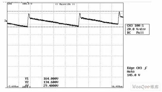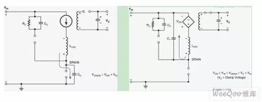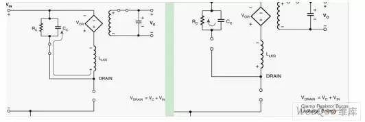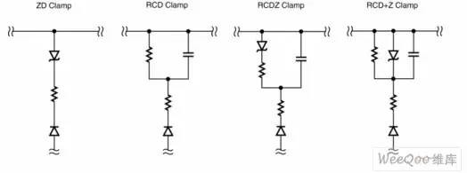 输出功率100W以下的AC/DC电源通常都采用反激式拓扑结构。这种电源成本较低,使用一个控制器就能提供多路输出跟踪,因此受到设计师们的青睐,且已成为元件数少的AC/DC转换器的标准设计结构。不过,反激式电源的一个缺点是会对初级开关元件产生高应力。反激式拓扑结构的工作原理,是在电源导通期间将能量储存在变压器中,在关断期间再将这些能量传递到输出。反激式变压器由一个磁芯上的两个或多个耦合绕组构成,激磁能量在被传递到次级之前,一直储存在磁芯的串联气隙间。实际上,绕组之间的耦合从不会达到完美匹配,并且不是所有的能量都通过该气隙进行传递。少量的能源储存在绕组内和绕组之间,这部分能量被称为变压器漏感。开关断开后,漏感能量不会传递到次级,而是在变压器初级绕组和开关之间产生高压尖峰。此外,还会在断开的开关和初级绕组的等效电容与变压器的漏感之间,产生高频振铃(图1)。 ![]() 图1:漏感产生的漏极节点开关瞬态 如果该尖峰的峰值电压超过开关元件(通常为功率MOSFET)的击穿电压,就会导致破坏性故障。此外,漏极节点的高幅振铃还会产生大量EMI。对于输出功率在约2W以上的电源来说,可以使用钳位电路来安全耗散漏感能量,达到控制MOSFET电压尖峰的目的。 1 钳位的工作原理钳位电路用于将MOSFET上的最大电压控制到特定值,一旦MOSFET电压达到阈值,所有额外的漏感能量都会转移到钳位电路,或者先储存起来慢慢耗散,或者重新送回主电路。钳位的一个缺点是它会耗散功率并降低效率,因此,有许多不同类型的钳位电路可供选择(图2)。有多种钳位使用齐纳二极管来降低功耗,但它们会在齐纳二极管快速导通时增加EMI的产生量。RCD钳位能够很好地平衡效率、EMI产生量和成本,因此最为常用。 ![]() 图2:不同类型的钳位电路 2 钳位RCD钳位的工作原理为:MOSFET关断后,次级二极管立即保持反向偏置,励磁电流对漏极电容充电(图3a)。当初级绕组电压达到由变压器匝数所定义的反射输出电压(VOR)时,次级二极管关断,励磁能量传递到次级。漏感能量继续对变压器和漏极电容充电,直到初级绕组电压等于箝位电容电压(图3b)。 ![]() 图3:RCD钳位电路的初级侧钳位 3 Vc=钳位电压此时,阻断二极管导通,漏感能量被转移到钳位电容(图4a)。经由电容吸收的充电电流将漏极节点峰值电压钳位到VIN(MAX)+VC(MAX)。漏感能量完全转移后,阻断二极管关断,钳位电容放电到钳位电阻,直到下一个周期开始(图4b)。通常会添加一个小电阻与阻断二极管串联,以衰减在充电周期结束时变压器电感和钳位电容之间产生的任何振荡。这一完整周期会在钳位电路中造成电压纹波(称为VDELTA),纹波幅度通过调节并联电容和电阻的大小来控制(图5)。 ![]() 图4:RCD钳位的工作原理 4 钳位电阻消耗漏感能量RCDZ钳位与RCD钳位的工作原理相同,不同点在于它通过齐纳二极管与电阻串联来分担耗散(图2)。齐纳二极管可防止电容放电至齐纳二极管阻断电压以下,这样可限制功率耗散并提升效率,特别是在轻载时非常有用。ZD钳位对由齐纳二极管的阻断电压指定的MOSFET电压提供硬钳位。RCD+Z钳位与RCD钳位的工作方式相同,所添加的齐纳二极管对瞬态条件下的MOSFET电压提供硬钳位,并且前者在正常工作条件下的EMI生成特性,也与RCD钳位相同。 ![]() 图5:RCD钳位电压的基准测量 钳位设计必须同时考虑变压器和MOSFET的特性。如果最低钳位电压低于变压器的VOR,钳位将充当一个负载,耗散的不仅仅是漏感能量。如果钳位元件过小,它们可能变得过热,无法预防危险的电压,并会产生不必要的EMI。最为重要的是,钳位必须对各种电源输入电压、负载电流和元件容差条件下的MOSFET提供保护。POWER Integrations公司发布的《确定钳位大小的设计指南》(PI-DG-101),对反激式电源所用到的四种主要钳位电路分别提供了确定元件大小的详细步骤。该设计指南可与PI Expert设计软件配合使用。PI Expert是一款交互式程序,它可以根据设计师的电源规格自动确定关键元件(包括变压器规格),从而完成一个有效的开关电源的设计。PI Expert可自动生成钳位设计,但其结果将比《确定钳位大小的设计指南》中的以下算法所生成的稍为保守些。5 确定RCD钳位的大小这里介绍了设计RCD钳位时需要遵循的步骤摘要。完整的细节内容,请参阅《确定钳位大小的设计指南》。下面所提到的所有值,均非由用户测量或定义,可在PI Expert的设计结果选项卡中找到。1.测量变压器的初级漏感LL。2.检查您的设计的开关频率fs。3.确定正确的初级电流IP,方法如下:如果设计采用功率限制设定,则IP=ILIMITEXT;如果设计采用外部流限设定,则IP=ILIMITEXT;对于所有其他设计,IP=IILIMITMAX。4.确定初级MOSFET所允许的总电压,并根据以下公式计算Vmaxclamp。 ![]() 建议至少应维持低于MOSFET的BVDSS 50V的电压裕量,并另外留出30V到50V的电压裕量,以满足瞬态电压要求。5.确定钳位电路的电压纹波VDELTA。6.根据以下公式计算钳位电路的最小电压。 ![]() 7.根据以下公式计算钳位电路的平均电压Vclamp。 ![]() 8.根据以下公式计算漏感中储存的能量。 ![]() 9.根据以下公式估算钳位中的能量耗散Eclamp。 ![]() 10.根据以下公式计算钳位电阻值。 ![]() 11.钳位电阻的功率额定值应大于 ![]() 12.根据以下公式计算钳位电容值。 ![]() 13.钳位电容的电压额定值应大于1.5*Vmaxclamp。14.应使用快速或超快恢复
