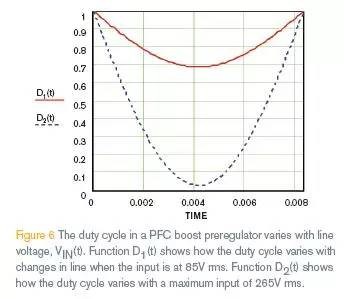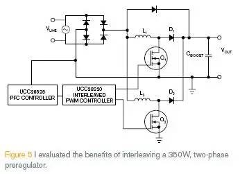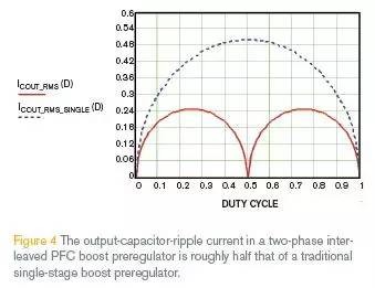 用于PFC的交错式升压转换器的优势 采用交错式升压级可以降低功率因数校正预调节器功率转换器输入及输出纹波电流,从而缩小升压电感器尺寸并降低输出电容的电气应力。 用于 PFC(功率因数校正)预调节器的最常见的拓扑结构为升压转换器,该升压转换器有一个持续的输入电流,您可以采用平均电流模式控制技术进行操作,使输入电流可以跟踪线电压变化。图 1 显示了一款传统的单级升压转换器。为了更方便地解释电路工作情况,本文所指的均为直流输入。ΔIL1 表示转换器输入端电感纹波电流变量,同时需要进行滤波处理使其符合 EMI 规范。I1 表示二极管输出电流,该电流为非持续电流,同时需要输出电容 (COUT) 对其进行滤波处理。在该拓扑结构中,输出电容纹波电流 ICOUT 较强,这也是 I1 与 IOUT(直流输出电流)之间的区别所在。 ![]() 图1 交错式升压转换器 图 2 为双级 (two-phase) 交错式升压转换器的工作原理图,该双级交错式转换器由两个在相位差为 180° 时运行的升压转换器组成。输入电流为两个电感电流(IL1 及 IL2)之和。由于电感纹波电流的相位相反,这些电流相互抵消,并降低由升压电感产生的电感纹波电流。当占空比为 50% 时,输入电感纹波电流消除效果最佳。输出电容电流为两个二极管电流 (I1+I2) 之和减去直流输出电流的差,该直流输出电流减小了输出电容纹波电流 IOUT,该输出电容纹波电流为占空比的一个函数。随着占空比接近 0、50% 和 100% 时,两个二极管电流之和就越来越接近直流电的值。这种情况下,输出电容就不得不只对电感纹波电流进行滤波处理。 ![]() 图2 输入纹波电流的降低 下面的方程式和图 3 显示了输入纹波电流与电感纹波电流的比率 K(D) 如何随着占空比的变化而变化。在选择交错式升压转换器的电感器时,牢记该变化是非常重要的。 、图3 ![]() 图 4 显示了单级升压转换器的额定输出电容 rms 电流,用 ICOUT_rms_single (D) 表示,同时还显示了双级交错式升压转换器的额定 rms 电流,用 ICOUT_rms (D) 表示,其为占空比的一个函数。图 4 则表明双级交错式升压转换器的输出电容纹波电流大约为传统单级升压转化器输出电容纹波电流的二分之一,从而减小了输出滤波电容的电气应力。 ![]() 图4 ![]() 电感器尺寸的估计 为了了解交错式 PFC 预调节器缩小的升压电感器尺寸所带来的好处,我对一款单级和一款两级升压预调节器(图 5)进行了数学对比。该设计中需要一个大约为 350W 的最大输出功率,用 POUT 表示;一个 85V rms 的最小线电压输入,用 VINMIN 表示;一个 265V rms 的最大线电压输入以及一个转换效率大约为 95% 的转换器。电感器的转换频率为 100 kHz,用 fS 表示。电感器的输入纹波电流要求为 30%,同时,两种拓扑结构电感器的最高电感纹波电流出现在最小输入及最大输入电流中。 ![]() 图5 我选取了数个电感器,以应用于基于纹波电流极值的两种设计。就用于一般输入端的转换器而言,当线电压为峰值,并且交流输入为最小值时,该点便会出现。当占空比为 0.67 时,转换器开始工作。图 6 显示了占空比是如何随着线电压 VIN(t) 的变化而变化的。函数 D1(t) 表明了占空比是如何随 265V rms 最大输入而变化的。当转换器在最大输入(265V rms)条件下工作时,并且输入电压为输出电压的二分之一时,就会出现最大电感纹波电流。随着线电压值接近输出电压值时,占空比随之减小,电感纹波电流也随之减弱。 ![]() 图6 ![]() 在转换器输入端,单级 PFC 预调节器中的电感纹波电流较为明显。用于一般输入端的单级 PFC 电感大约为 450 μH。得出该计算结果的基础是,当输入端为 85V rms,最小占空比为 0.67 时,电感纹波电流为最强。 ![]() 和传统预调节器一样,双路交错式电感器拥有相同的输入电流纹波要求。在一个交错式升压级中,电感电流的变量大约为 3.4A。最小 rms 输入电压的可变最小占空比需要一个大约为 245 μH 的电感。在相同的功率级要求条件下,该电感大致相当于一个单级 PFC 预调节器电感的二分之一。 ![]() 试验结果 为了对 L1、L2 和输入电流进行计算,我对一款使用 200-μH 电感的双路交错式升压转换器进行了估算。当线电压为峰值时以低压输入,转换器开始工作时便会出现电感纹波电流极值。图 7 中的示波器图显示了输入为 85V rms 时 L1 和 L2 的电感电流。CH1 表示经过整流之后的线电压,CH2 表示 L1 电感电流,CH3 表示 L2 电感电流,CH4 则表示输入电流。电流转换比大约为 4A/段 (division)。 最新评论论坛新帖更多>医工工具 |