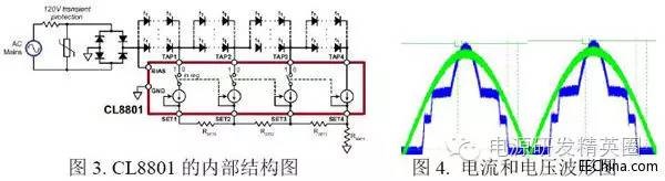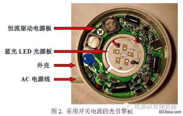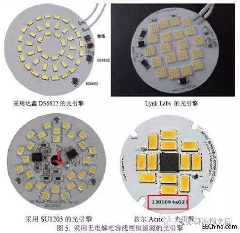 迄今为止,“光引擎”还没有一个非常严格而又确切的定义,以致不少读者还不知道到底什么是光引擎。有人把它定义为“LED光引擎(light engine)是指包含LED封装(组件)或LED数组(模块)、LED驱动器、以及其它亮度、热学、机械和电气组件的整体组合。该装置要通过一个与LED灯具匹配的常规连接器直接连接到分支电路,该LED灯具设计成不使用标准灯座。”这个定义看上去好像很完整,但是往往会使人困惑,因为它还包括了“其它亮度、热学、机械和电气组件”。其实可以非常简单地给光引擎下一个定义:那就是凡是把LED光源和LED驱动电源结合为一个模块的就可以称为光引擎。更通俗一点的可以这样来说,凡是把恒流驱动源放到LED铝基板上去就成为光引擎。有人把COB LED称为光引擎,显然是不对的!因为它没有集成恒流驱动源,没有“驱动”,怎么能够称为“引擎”?。从电源的种类又可以分为直流光引擎和交流光引擎两大类。不过,当前由于室内灯具开始大量采用光引擎,所以我们更多关注交流市电的光引擎。那么是不是整个LED灯具也可以称为光引擎呢?当然不可以。正如整个汽车不能称为引擎一样,引擎是汽车的动力总成,但是不等于汽车,还要加上外壳才能成为汽车。之所以需要有光引擎这样的产品,是因为所有的灯具有各式各样的外观。有些灯具甚至可以称为艺术品。就拿白炽灯来说,可以说它只有最简单的灯泡一种形式,顶多再加上蜡烛灯或极小的圣诞灯。可是它的外形可是有各式各样的。尤其是水晶灯更是各式各样的工艺美术品,极其华丽。但是LED还必须加上极其复杂的恒流驱动源才能相当于一个白炽灯一样工作(接上220V就可以亮)。如果把LED做成光引擎,它就也像白炽灯一样接上220V就可以亮(当然还需要有与其相配的散热器)。这样一方面有助于标准化,另一方面也可以大大地便于外壳(和散热器)设计者发挥其所能。一.采用光引擎的好处很多人认为推广光引擎的主要目的是为了标准化以增加其互换性。其实这种标准化并不应该只从光引擎着手,而是应该在统一散热器和光引擎之间的接口上着手。就拿LED球泡灯来说,需要统一的基本上就是光引擎和散热器的尺寸,具体涉及到定位螺钉孔和散热器的定位螺钉孔的尺寸位置。即使是这么具体的问题,也还有很多难处。因为它是和瓦数和散热器的散热能力都有关系。所以推广光引擎不能只从互换性的好处来着眼。可以说推广光引擎的最大好处有以下几个方面。1. 降低 LED照明灯具厂家研发费用,缩短产品生产周期因为所有LED灯具的光学和电气指标都由光引擎生产厂家制定了。甚至还推荐了相应的散热器。灯具厂家只要把光引擎安装到散热器里面去就可以了。灯具厂商甚至不需要经验丰富的光学、电子工程师,也不需要购买昂贵的光学和电子仪器设备。换句话说,光引擎可以大大降低LED灯具厂的准入门限,但却不会因此而降低LED灯具的产品质量。当然这要求光引擎的生产厂家本身就要有极高的水平才行。2. 推广光引擎可以大大加速LED灯具的推广最近几年随着白炽灯的禁产,LED灯具即将迎来爆炸式的增长。LED灯具厂如雨后春笋般的大量涌出。这虽然是一种必然趋势,但是也带来了很多问题,尤其是表现在LED灯具的质量上的良莠不齐和各个厂商之间的无序的价格战。LED光引擎的出现可以在很大程度上解决这类问题。因为质量是由几家生产光引擎的大厂决定,价格也不可能有太大的出入。这就大大地减少了由无序竞争而引起的内耗。有助于LED灯具产业的高速发展。3. 提升了LED灯具的整体性能例如提高了整体光效(lm/W),这里是指包括电源效率在内的整体光效,当然对于整灯来说也还应当包括灯罩的透光率(不过这不是由生产光引擎的公司负责,而是由生产散热器的公司负责)。也可以提高色温,显色指数等指标。4. 降低了成本至少可以省去了恒流驱动源的印制板,及其生产成本。目前来说,最简单而最重要的就是用于LED球泡灯的光引擎。下面我们就来看一下这种光引擎的构成。 二. LED球泡灯的光引擎对于球泡灯来说,它的构成已经是非常接近标准化的了。它主要是由三大部分构成:LED光源、恒流驱动电源、散热器和外壳(包括灯头和灯罩)。 图1. LED球泡灯的构成所以如果就拿LED球泡灯来说,如果要做成光引擎就必须把它的电源板和LED板合成为一块板,可以看出其难度是很大的。一. 开关电源不适合做光引擎开关电源虽然性能比较好,效率也比较高,但是最大的缺点就是元件数目非常多,要和LED灯板集成在一起有很大难度。有人就曾经试图这样做,其结果是非常拥挤(见图2) 图2. 采用开关电源的光引擎板从这张照片可以看出,整个开关电源几乎占据了70%以上的面积,而把LED的空间减到最小。这种结构显然是不可行的,因为它不但减小了LED的发光面积,也挡去一部分光线。而且最大的问题是减小了LED的散热面积。图中看来可能是5个1W的LED。如果要做成9W或10W的球泡灯更是完全不可能实现的了。二. 线性电源可以减少元件数但效率过低为了减少元件数,最简单的方法是改用线性电源,通常线性电源只有5-6个元件,这样就可以大大减小所占用的面积。目前市面上的光引擎大多数都是采用无电解电容的线性恒流源,无电解电容方案是美国ExClara公司于2011年8月提出来的,以后有6-7家公司模仿他们的思路开发出类似的芯片。它的基