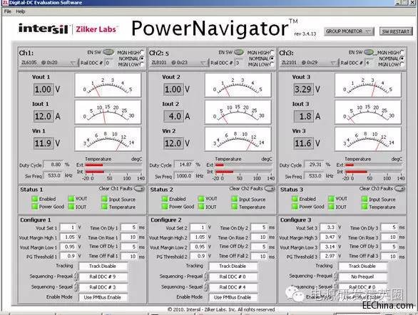 随着各大电源厂商不断的推出新的数字电源产品,数字电源也越来越多的被用户采纳,但如何才能使用户从数字电源中得到最大的利益,一直是电源设计工程师和系统设计工程师的共通目标,本文就以intersil的Zilker系列数字电源为基础,主要介绍了数字电源能够给系统应用带来怎样的价值,以及如何最大限度发挥数字电源的优势。1. 数字电源的同步和时序控制通常电源系统的时序和同步控制都需要使用特殊的控制器件来实现,而需要额外增加器件来实现时序控制,即增加了成本还需要在电路板上占有一定的空间,并且是完全由硬件电路实现,没有适应性和扩展性,每做一个新的产品都需要重新进行时序设计和相应的硬件设计。特别是针对复杂的系统来说,每个系统中可能有多达10几路的电源轨需要进行精确的时序设计,一不小心如果有一路时序设计错误,整个系统设计就功亏一篑。而数字电源的应用,让时序和同步控制变得异常简单,Zilker系列数字电源管理芯片使用单线制的DDC总线和SYNC管脚就可轻松实现各路电源轨之间的同步和时序管理,不再需要使用专门的频率同步信号发生器件和时序控制器件,只需通过单线将各芯片的DDC管脚和SYNC管脚分别连接在一起,相应器件的时序和工作的相位就可以进行精确的设定。时序设定是通过配置Pre Sequence和Sequence寄存器实现,同步和相位是通过配置SYNC Output Mode,SYNC Input Mode, SYNC Pin Configure来实现。而芯片运行的过程中是完全不需要外部控制的,只需事先将配置文件写入芯片中,芯片就可以完全在独立运行的过程中实现精确的排序和同步错相功能了。下图是通过配置的基于ZL系列数字电源芯片电源轨的开关节点波形图以及输出电压轨的时序控制结果: 图2:系统的上电时序控制效果![]() 2.数字电源对系统动态功耗管理的帮助针对工业界越来越严格的能耗管理需求,为使电源系统能够得到最优化的效能。除了提高电源系统的工作效率,另一个途径就是针对系统处理器芯片工作在不同业务密度时,动态的调节处理器芯片的供电电压来优化处理器的能耗,通常情况下即要实现下面的功能:当系统处在高负荷运转的时候,需要系统有很强的处理能力,让系统达到最高的处理速度和能力,需要相应的提高系统处理器芯片的供电电压;而当系处于低负荷运转的时候,又需要尽可能的把闲散的功能模块屏蔽,不让或者少让其损耗能量,从而相应的降低系统处理器芯片的供电电压。使用模拟电源方案,电源系统的输出电压是由硬件固定设置的,不能够或者很难进行实时的动态调整。而使用了数字电源方案,我们不仅可以通过接口(Zilker系列数字电源使用标准的I2C/SMBUS接口)和相应的协议(Zilker系列数字电源使用标准协议的PMBus协议)实时的控制电源的输出,而且还可以实时监测电源轨的工作电压、电流、温度等信息(如图4是通过Intersil公司的GUI显示了多路数字电源轨的工作状态), 这样可以比较容易的实现对系统的动态管理和性能优化了。 图4:系统的动态监控通常的系统动态电压调节流程图如下图5所示,在调节的过程中需要CPU发送调节指令,对于模拟电源来说,指令是不能够被直接接收和执行的,那么整个调节过程就不能够有效的执行。只有使用了数字电源的系统才能有效的进行相应指令接收和操作,系统动态功耗的管理和优化就变的有操作性了。 作者:资深应用工程师 李林