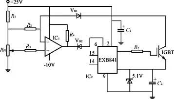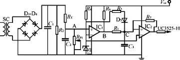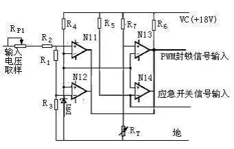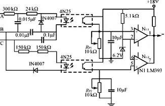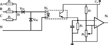 图2采用继电器K和限流电阻R1构成的防浪涌电流电路 图3替代R2C2延迟电路 图2是采用继电器K和限流电阻R1构成的防浪涌电流电路。电源接通瞬间,输入电压经整流(D1~D4)和限流电阻R1对滤波电容器C1充电,防止接通瞬间的浪涌电流,同时辅助电源Vcc经电阻R2对并接于继电器K线包的电容器C2充电,当C2上的电压达到继电器K的动作电压时,K动作,其触点K1.1闭合而旁路限流电阻R1,电源进入正常运行状态。限流的延迟时间取决于时间常数(R2C2),通常选取为0.3~0.5s。为了提高延迟时间的准确性及防止继电器动作抖动振荡,延迟电路可采用图3所示电路替代R2C2延迟电路。 3 过压、欠压及过热保护电路 进线电源过压及欠压对开关电源造成的危害,主要表现在器件因承受的电压及电流能力超出正常使用的范围而损坏,同时因电气性能指标被破坏而不能满足要求。因此对输入电源的上限和下限要有所限制,为此采用过压、欠压保护以提高电源的可靠性和安全性。 温度是影响电源设备可靠性的最重要因素。根据有关资料分析表明[5],电子元器件温度每升高2℃,可靠性下降10%,温升50℃时的工作寿命只有温升25℃时的1/6,为了避免功率器件过热造成损坏,在开关电源中亦需要设置过热保护电路。 图4 过压、欠压、过热保护电路 图4是仅用一个4比较器LM339及几个分立元器件构成的过压、欠压、过热保护电路。取样电压可以直接从辅助控制电源整流滤波后取得,它反映输入电源电压的变化,比较器共用一个基准电压,N1.1为欠压比较器,N1.2为过压比较器,调整R1可以调节过、欠压的动作阈值。N1.3为过热比较器,RT为负温度系数的热敏电阻,它与R7构成分压器,紧贴于功率开关器件IGBT的表面,温度升高时,RT阻值下降,适当选取R7的阻值,使N1.3在设定的温度阈值动作。N1.4用于外部故障应急关机,当其正向端输入低电平时,比较器输出低电平封锁PWM驱动信号。由于4个比较器的输出端是并联的,无论是过压、欠压、过热任何一种故障发生,比较器输出低电平,封锁驱动信号使电源停止工作,实现保护。如将电路稍加变动,亦可使比较器输出高电平封锁驱动信号。 4 缺相保护电路 由于电网自身原因或电源输入接线不可靠,开关电源有时会出现缺相运行的情况,且掉相运行不易被及时发现。当电源处于缺相运行时,整流桥某一臂无电流,而其它臂会严重过流造成损坏,同时使逆变器工作出现异常,因此,必须对缺相进行保护。检测电网缺相通常采用电流互感器或电子缺相检测电路。由于电流互感器检测成本高、体积大,故开关电源中一般采用电子缺相保护电路。图5是一个简单的缺相保护电路。三相平衡时,R1~R3结点H电位很低,光耦合输出近似为零电平。当缺相时,H点电位抬高,光耦输出高电平,经比较器进行比较,输出低电平,封锁驱动信号。比较器的基准可调,以便调节缺相动作阈值。该缺相保护适用于三相四线制,而不适用于三相三线制。电路稍加变动,亦可用高电平封锁PWM信号。 图5三相四线制的缺相保护电路 图6是一种用于三相三线制电源缺相保护电路,A、B、C缺任何一相,光耦器输出电平低于比较器的反相输入端的基准电压,比较器输出低电平,封锁PWM驱动信号,关闭电源。比较器输入极性稍加变动,亦可用高电平封锁PWM信号。这种缺相保护电路采用光耦隔离强电,安全可靠,RP1、RP2用于调节缺相保护动作阈值。 图6 三相三线制的缺相保护电路 5 短路保护 开关电源同其它电子装置一样,短路是最严重的故障,短路保护是否可靠,是影响开关电源可靠性的重要因素。IGBT(绝缘栅双极型晶体管)兼有场效应晶体管输入阻抗高、驱动功率小和双极型晶体管电压、电流容量大及管压降低的特点,是目前中、大功率开关电源最普遍使用的电力电子开关器件。IGBT能够承受的短路时间取决于它的饱和压降和短路电流的大小,一般仅为几μs至几十μs。短路电流过大不仅使短路承受时间缩短,而且使关断时电流下降率 过大,由于漏感及引线电感的存在,导致IGBT集电极过电压,该过电压可使IGBT锁定失效,同时高的过电压会使IGBT击穿。因此,当出现短路过流时,必须采取有效的保护措施。 为了实现IGBT的短路保护,则必须进行过流检测。适用IGBT过流检测的方法,通常是采用霍尔电流传感器直接检测IGBT的电流Ic,然后与设定的阈值比较,用比较器的输出去控制驱动信号的关断;或者采用间接电压法,检测过流时IGBT的电压降Vce,因为管压降含有短路电流信息,过流时Vce增大,且基本上为线性关系,检测过流时的Vce并与设定的阈值进行比较,比较器的输出控制驱动电路的关断。 在短路电流出现时,为了避免关断电流的 过大形成过电压,导致IGBT锁定无效和损坏,以及为了降低电磁干扰,通常采用软降栅压和软关断综合保护技术。 在设计降栅压保护电路时,要正确选择降栅压幅度和速度,如果降栅压幅度大(比如7.5V),降栅压速度不要太快,一般可采用2μs下降时间的软降栅压,由于降栅压幅度大,集电极电流已经较小,在故障状态封锁栅极可快些,不必采用软关断;如果降栅压幅度较小(比如5V以下),降栅速度可快些,而封锁栅压的速度必须慢,即采用软关断,以避免过电压发生。 为了使电源在短路故障状态不中断工作,又能避免在原工作频率下连续进行短路保护产生热积累而造成IGBT损坏,采用降栅压保护即可不必在一次短路保护立即封锁电路,而使工作频率降低(比如1H