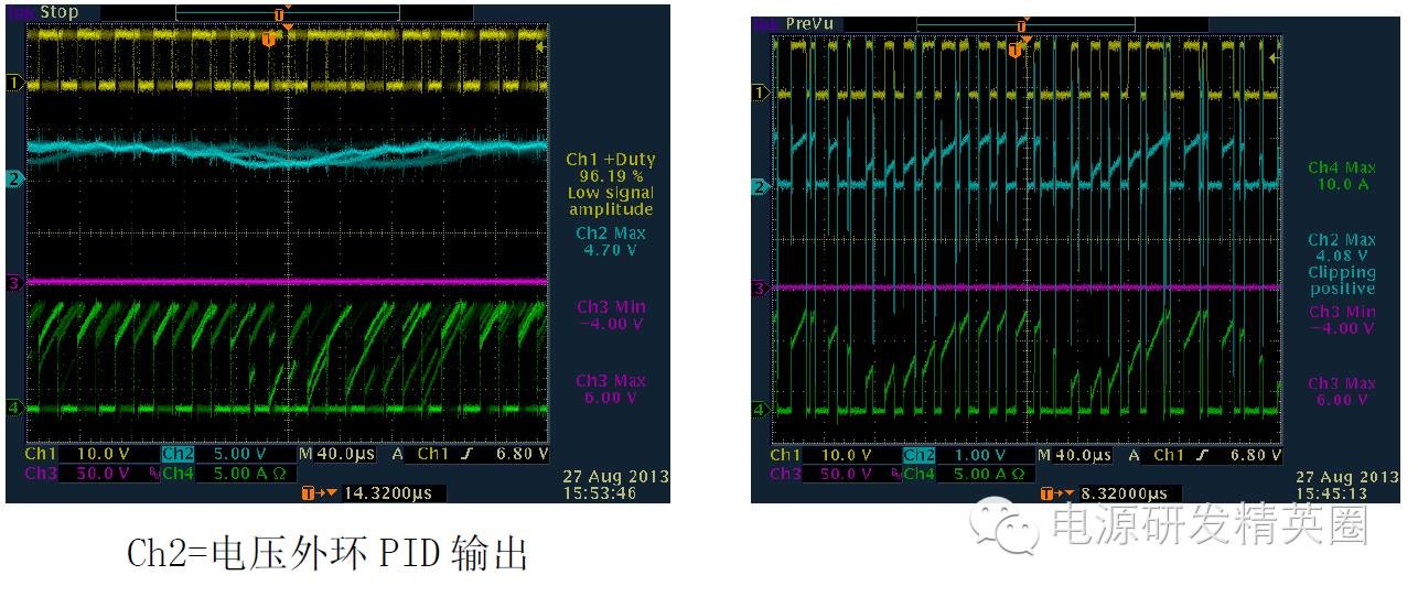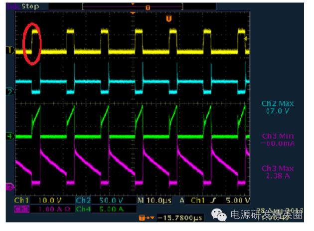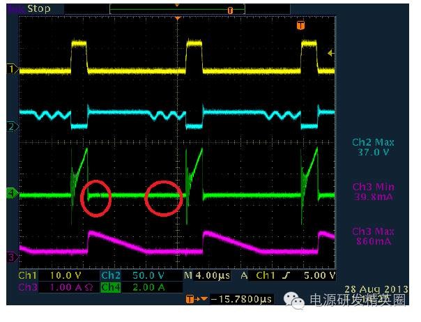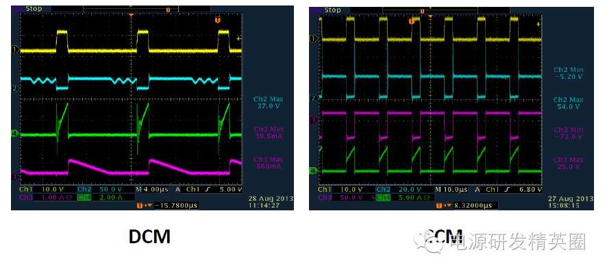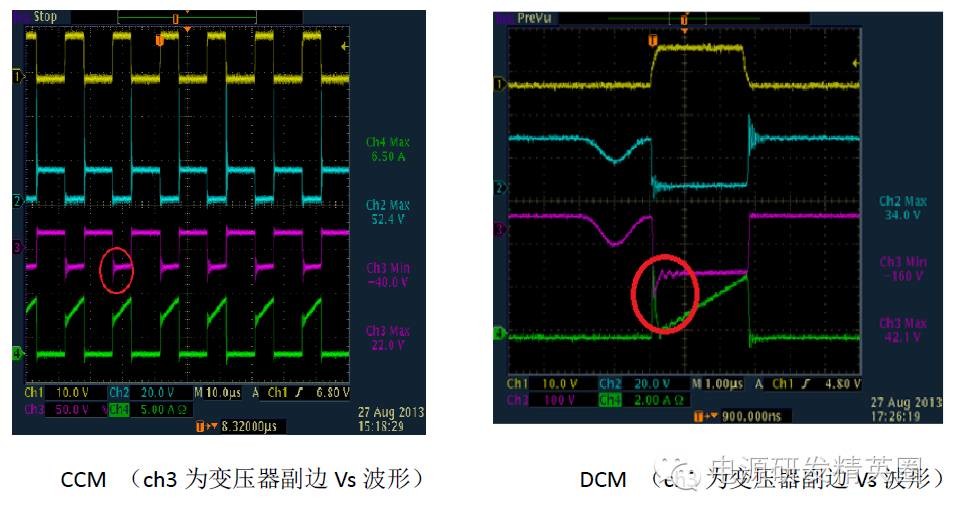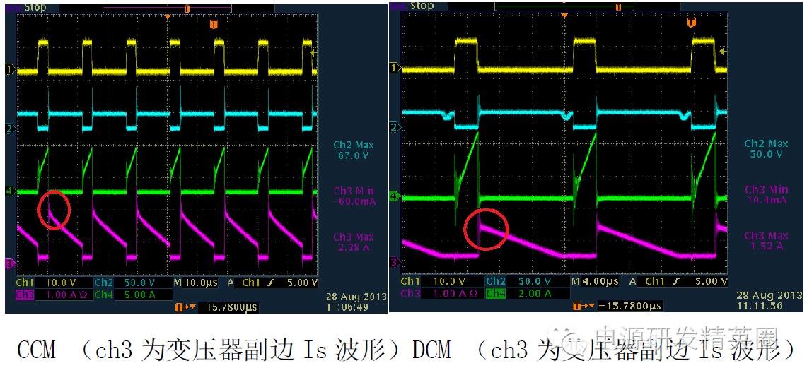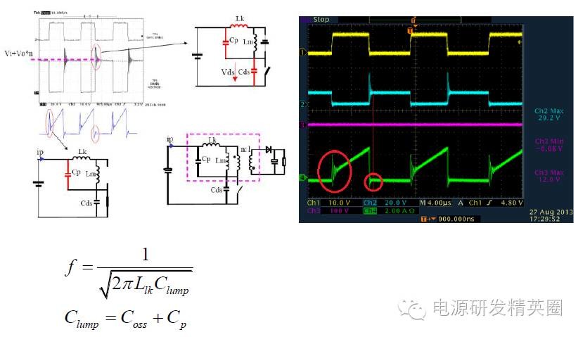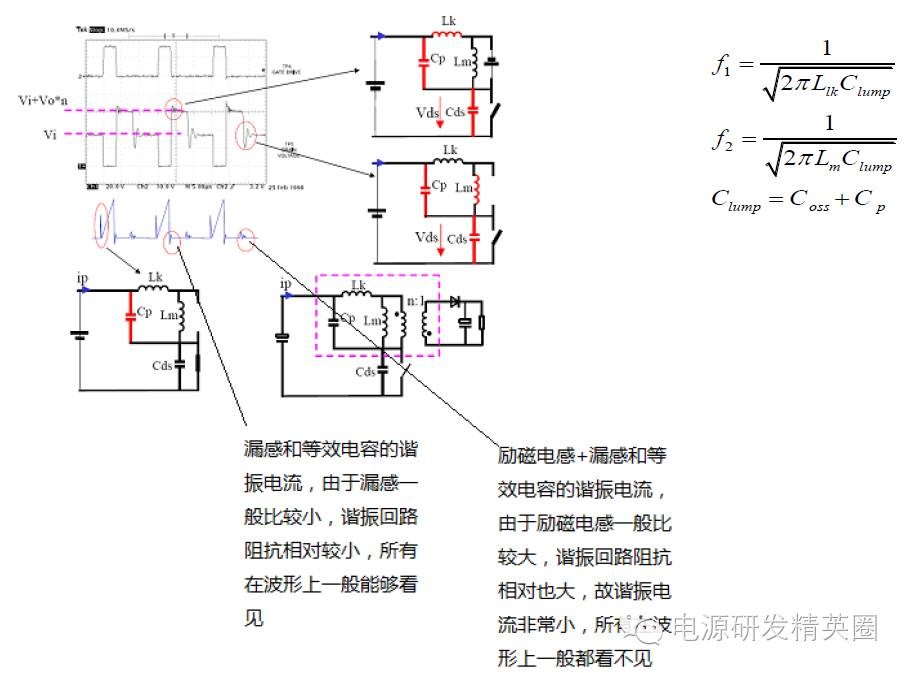 1.单管反激电路基本结构 基本工作原理 ON/OFF(省略)2. 两种模式DCM 和CCM (1) CCM 和DCM 模式判断依据 CCM 和DCM 的判断,不是按照初级电流是否连续来判断的。而是根据初、次级的电流合成来判断的。只要初、次级电流不同是为零,就是CCM 模式。而如果存在初、次级电流同时为零的状态,就是DCM模式。介于二者之间的就是BCM 模式。 (2) 两种模式在波形上的区别 变压器初级电流,CCM 模式是梯形波,而DCM 模式是三角波。 次级整流管电流波形,CCM 模式是梯形波,DCM 模式是三角波。 MOS 的Vds 波形,CCM 模式,在下一个周期开通前,Vds 一直维持在Vin+Vf 的平台上。而DCM 模式,在下一个周期开通前,Vds会从Vin+Vf 这个平台降下来发生阻尼振荡。(Vf 次级反射到原边电压) 。因此我们就可以很容易从波形上看出来反激电源是工作在CCM还是DCM状态 ![]() 3. MOSFET在开通和关断瞬间寄生参数对波形的影响 (1)DCM(Vds,Ip) ![]() 在MOS关断的时候,Vds的波形显示,MOS上的电压远超过Vin+Vf!这是因为,变压器的初级有漏感。漏感的能量是不会通过磁芯耦合到次级的。那么MOS关断过程中,漏感电流也是不能突变的。漏感的电流变化也会产生感应电动势,这个感应电动势因为无法被次级耦合而箝位,电压会冲的很高。那么为了避免MOS被电压击穿而损坏,所以我们在初级侧加了一个RCD吸收缓冲电路,把漏感能量先储存在电容里,然后通过R消耗掉当次级电感电流降到了零。这意味着磁芯中的能量已经完全释放了。那么因为二管电流降到了零,二极管也就自动截止了,次级相当于开路状态,输出电压不再反射回初级了。由于此时MOS的Vds电压高于输入电压,所以在电压差的作用下,MOS的结电容和初级电感发生谐振。谐振电流给MOS的结电容放电。Vds电压开始下降,经过1/4之一个谐振周期后又开始上升。由于RCD箝位电路以及其它寄生电阻的存在,这个振荡是个阻尼振荡,幅度越来越小。f1比f2大很多(从波形上可以看出),这是由于漏感一般相对较小;同时由于f1所在回路阻抗比较小,谐振电流较大,所以能够很快消耗在等效电阻上,这也就是为什么f1所在回路很快就谐振结束的原因!(具体谐振时间可以通过等效模型求解二次微分方程估算) (2) CCM(Vds,Ip) (3)其他一些波形分析(次级输出电压Vs,Is, Vds) 不管是在CCM模式还是DCM模式,在mosfet开通on时刻,变压器副边都有震荡。主要原因是初次级之间的漏感+输出肖特基(或快恢复)结电容+输出电容谐振引起,在CCM模式下与肖特基的反向恢复电流也一些关系。故一般在输出肖特基上并联一个RC来吸收,使肖特基应力减小。 不管是在CCM模式还是DCM模式,在mosfet关断off时刻,变压器副边电流Is波形都有一些震荡。主要原因是次级电感+肖特基接电容+输出电容之间的谐振造成的.(4)RCD吸收电路对Vds的影响 在MOS关断的时候,Vds的波形显示,MOS上的电压远超过Vin+Vf!这是因为,变压器的初级有漏感。漏感的能量是不会通过磁芯耦合到次级的。那么MOS关断过程中,漏感电流也是不能突变的。漏感的电流变化也会产生感应电动势,这个感应电动势因为无法被次级耦合而箝位,电压会冲的很高。那么为了避免MOS被电压击穿而损坏,所以我们在初级侧加了一个RCD吸收缓冲电路,把漏感能量先储存在电容里,然后通过R消耗掉(5)Vgs波形 为使mosfet在开通时间的上升沿比较陡,进而提高效率。在布线时驱动信号尽量通过双线接到mosfet的G、S端,同时连接尽量短些。4.设计时需注意点 (1)尽量使反激电路最大工作占空比小于50%,若要使占空比工作在大于50%,为避免次谐波震荡,需加上斜率补偿,此外还需注意变压器能否磁复位。由于mosfet导通和关断需要一定的时间,同一批次的变压器单体之间也有差异,建议反激最大工作占空比小于45%。 (2)反激的功率地和控制地的连接须注意单点接地,特别是在哪个地方进行单点接地需慎重。为有效地吸收地噪声(mosfet的开通和关断),输入电容的一个脚尽量靠近共地点。 (3)由于电压外环的PID输出与电流内环进行比较来决定占空比,事实上 PID的输出不是一条绝对直线,它是在直流的基础上叠加了一个低频分量,为保证输出稳定,在设计时需使内环带宽比外环带宽大于10倍以上。 上述波形一般在开始调环路或者在输入VIN比较高时经常会出现,主要原因是外环的带宽太快了,为使系统稳定,需减小带宽,一般可通过减小比例P或者增大积分C来解决。 |