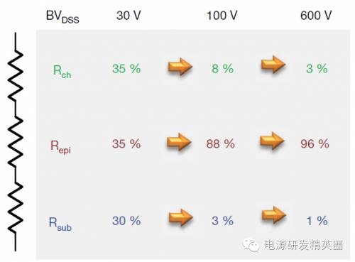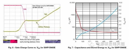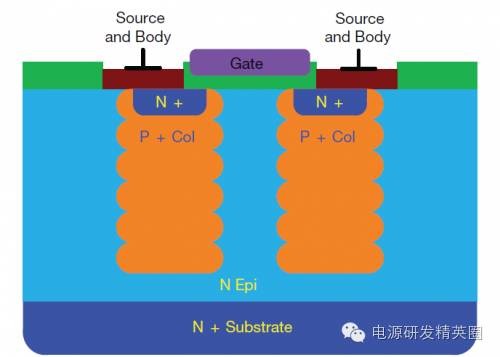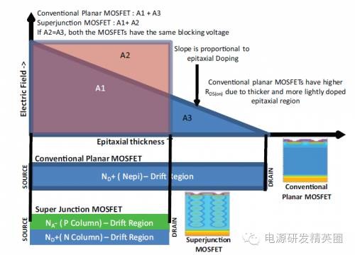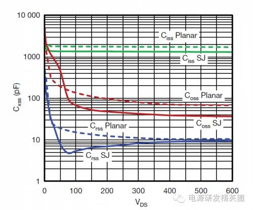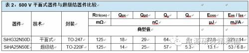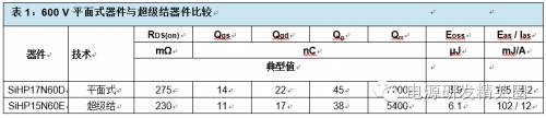 基于超级结技术的功率MOSFET已成为高压开关转换器领域的业界规范。它们提供更低的RDS(on),同时具有更少的栅极和和输出电荷,这有助于在任意给定频率下保持更高的效率。在超级结MOSFET出现之前,高压器件的主要设计平台是基于平面技术。但高压下的快速开关会产生AC/DC电源和逆变器方面的挑战。从平面向超级结MOSFET过渡的设计工程师常常为了照顾电磁干扰(EMI)、尖峰电压及噪声考虑而牺牲开关速度。本应用指南将比较两种平台的特征,以便充分理解和使用超级结技术的优点。为了理解两种技术的差异,我们需要从基础开始。图1a显示了一种传统平面式高压MOSFET的简单结构。平面式MOSFET通常具有高单位芯片面积漏源导通电阻,并伴随相对更高的漏源电阻。使用高单元密度和大管芯尺寸可实现较低的RDS(on)值。但大单元密度和管芯尺寸还伴随高栅极和输出电荷,这会增加开关损耗和成本。另外还存在对于总硅片电阻能够达到多低的限制。器件的总RDS(on)可表示为通道、epi和衬底三个分量之和:RDS(on) = Rch + Repi + Rsub 图1a – 传统平面式MOSFET结构 图1b – 平面式MOSFET的电阻性元件图1b显示平面式MOSFET情况下构成RDS(on) 的各个分量。对于低压MOSFET,三个分量是相似的。但随着额定电压增加,外延层需要更厚和更轻掺杂,以阻断高压。额定电压每增加一倍,维持相同的RDS(on)所需的面积就增加为原来的五倍以上。对于额定电压为600 V的MOSFET,超过95%的电阻来自外延层。显然,要想显著减小RDS(on)的值,就需要找到一种对漂移区进行重掺杂的方法,并大幅减小epi电阻。 图2 – 超级结MOSFET结构 图3 – 平面和超级结MOSFET的电压与导通电阻比较图2显示了基于电荷平衡概念的超级结MOSFET物理结构。漂移区现在有多个P柱,用于消除处于反向偏压下的周围N区中的电荷。因此,Nepi现在可更薄和重掺杂,因为其组合结构可对施加反向电压提供高很多的电阻。由于N区变得更加重掺杂,所以其单位面积导通电阻减小。图3比较了两种技术的漂移区电场与epi厚度的关系。在传统平面式MOSFET中,阻断电压由epi厚度和掺杂(ND+)定义,或由掺杂线的斜率定义。如果需要额外阻断电压,不仅epi需要更厚,而且epi掺杂线也需要改变。这导致较高电压MOSFEET的RDS(on)不成比例增加。额定电压每增加一倍,在保持相同管芯尺寸条件下,RDS(on)可能增至原来的三至五倍。对于给定的阻断电压,超级结MOSFET可使用比传统平面式器件(A1 + A3)更薄的epi(A1 + A2)。N区(ND+)的掺杂被P柱(NA-)的掺杂抵消,导致没有斜率。换言之,因为电荷平衡机制,定义阻断电压的只有epi厚度。因此,超级结结构的导通电阻和击穿电压之间存在线性关系。导通电阻随着击穿电压的增加而线性增加。对于相同的击穿电压和管芯尺寸,超级结MOSFET的导通电阻远小于传统平面式器件。Vishay提供的超级结器件为E系列高压MOSFET,额定电压范围为500 V - 650 V。这些器件提供从小SMT占位面积(如PowerPAK? SO8和PowerPAK 8 x 8)到标准TO-xxx封装的各种封装选项。典型比导通电阻的变化范围为20 mΩ -cm2至10 mΩ-cm2,具体取决于击穿电压和使用哪一代技术。传统平面式MOSFET的导通电阻x 面积之积有三至五倍高,同样取决于额定电压。例如,TO-220封装600 V器件可实现的最低RDS(on)为275 mΩ,而来自Vishay的同样封装超级结器件可低至50 mΩ。当然,对于每一代新的设计平台,将来会提供具有更低RDS(on)的更好器件。容值对超级结器件而言,电阻的减小会带来明显的好处,例如在相同RDS(on)下的更低导通损耗或更小管芯。另外,芯片面积的减小会导致更低的容值以及栅极和输出电荷,这可减小动态损耗。在低压沟槽式或平面式MOSFET中,通常需要考虑以更高容值为让步条件来降低RDS(on)。在超级结技术情况下,让步程度是最小的。电荷平衡机制可同时减小RDS(on)和器件容值,使之成为一种双赢解决方案。表1比较了具有接近RDS(on)值的两种器件的特征。除Eas和Ias外,超级结器件的每个参数均实现15 % - 25 %的改善。这是因为超级结器件虽然RDS(on)只减小了20%,但其管芯尺寸只有平面式器件的三分之一。更小的尺寸会影响额定电流和功率。大管芯尺寸具有更低的电流密度和更好的散热能力。因此,对于给定的导通电阻,传统平面式MOSFET天生比超级结器件更坚固。但在通常用于高压电源转换器的电流和开关频率下,超级结器件始终具有更低的损耗和更高的效率。 表2显示了500 V器件的比较。SiHG32N50D是一款具有125 m?典型RDS(on)额定值的平面式MOSFET。其管芯尺寸大,实际上是适合TO-247封装的最大管芯。这可与采用更小的隔离式细引线TO-220F封装的超级结SiHA25N50E相比,后者提供相同的RDS(on),但除UIS坚固性以外,规格表的每个参数都更好。应当注意的是,Vishay在电感式开关规格降额方面相当保守,对测量故障电流施加100%的降额因子,相当于针对UIS能量Eas的降额因子为4。 图4定义了提供有电荷规格的器件的容值。对于上文比较的两种600 V器件,容值曲线如图5所示。请注意容值采用对数式标度。 图4 – MOSFET容值定义 图5 – 平面式SiHP17N60D和超级结SiHP15N60E MOSFET的容值比较栅极电荷考虑事项在任何开关电路中,栅极驱动设计都要考虑开关速度与噪声这一对矛盾。超级结器件在高压下提供高开关速度,这也需要特别注意驱动设计。设计不佳可能造成电压尖峰、开关不稳定和更高的EMI。与超低容值有关的另一个重要考虑是对耦合和